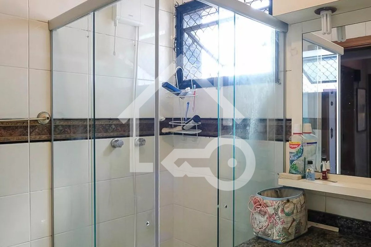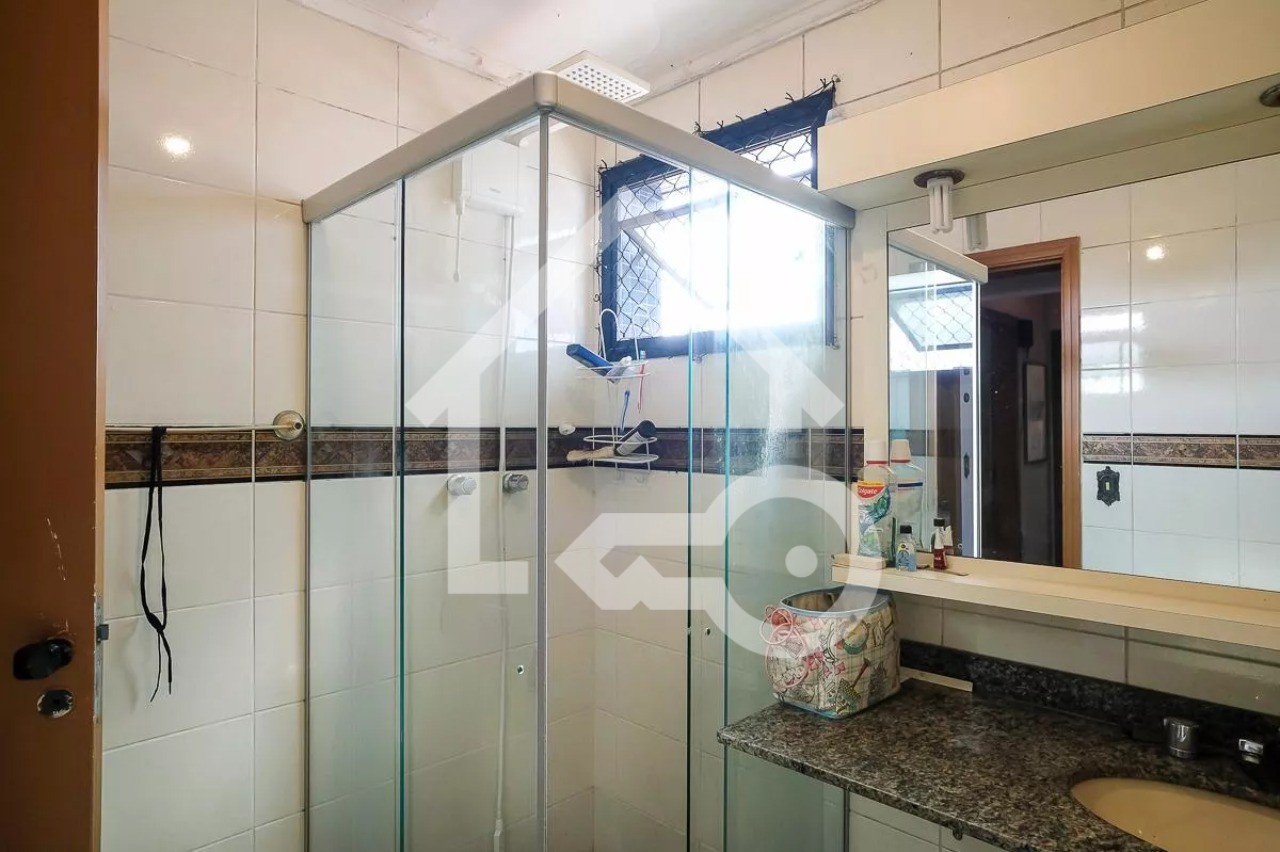 Banheiros com ventilação natural e box em vidro.