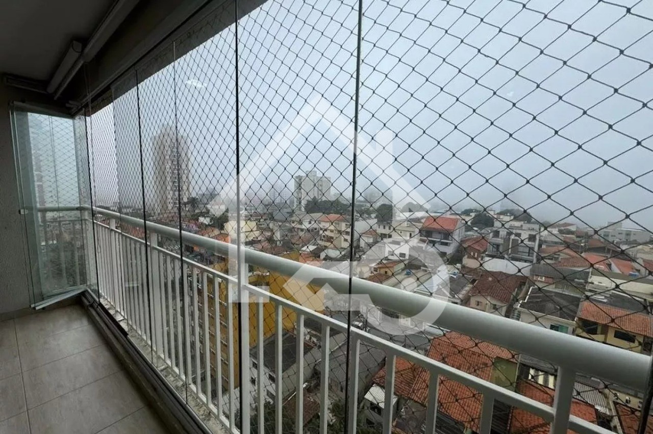 Varanda com fechamento em vidro e telas de proteção.