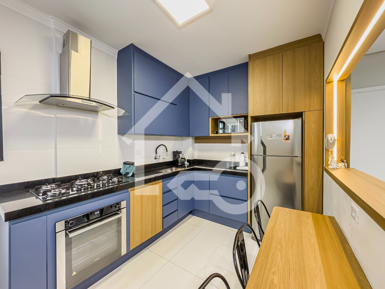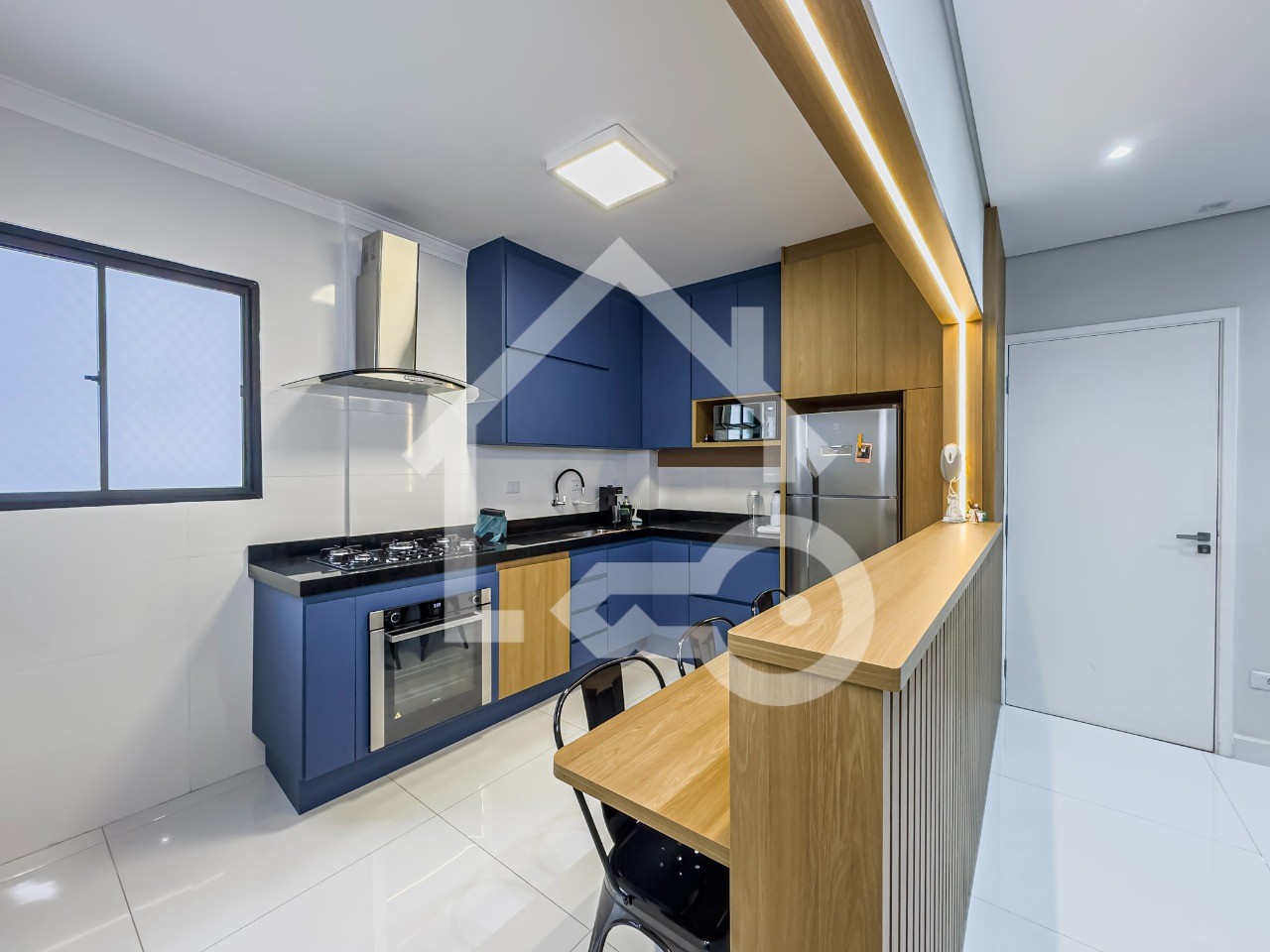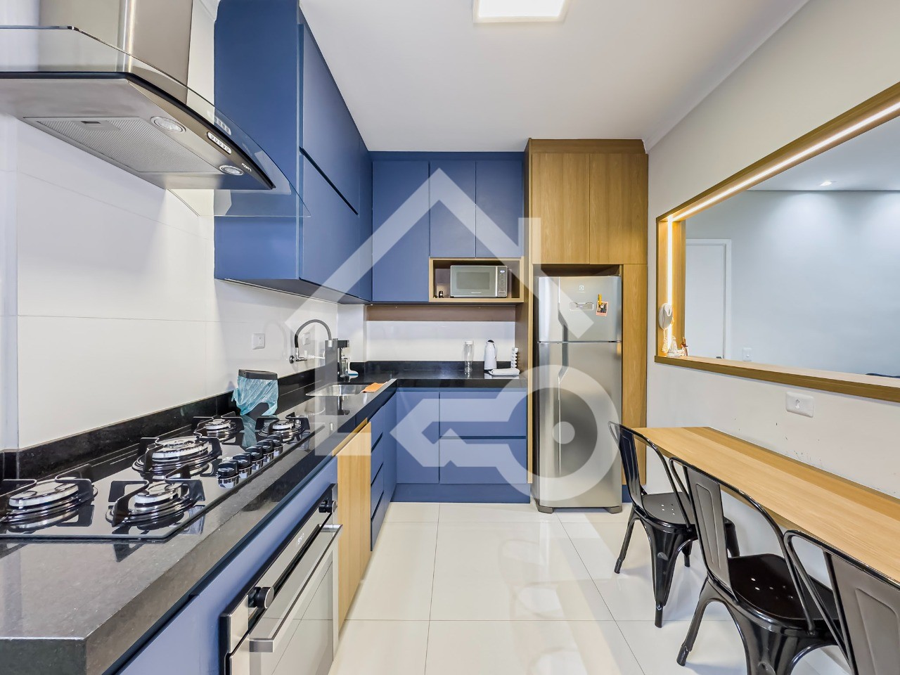 Cozinha em conceito aberto com armários planejados e eletros embutidos.