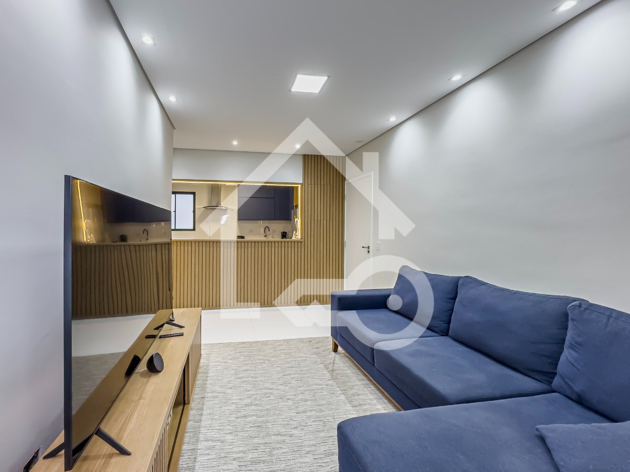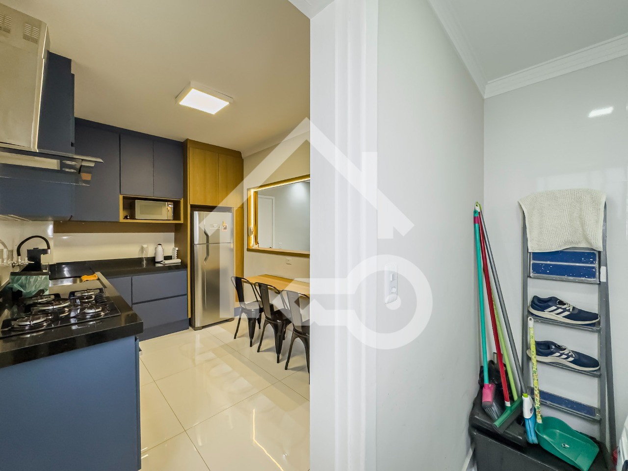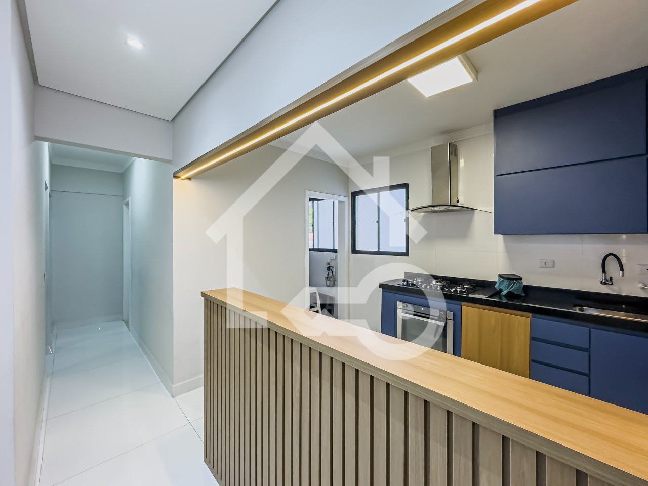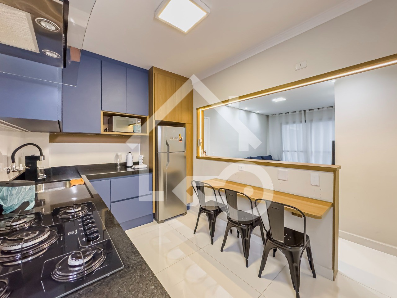 Cozinha em conceito aberto com armários planejados e eletros embutidos.