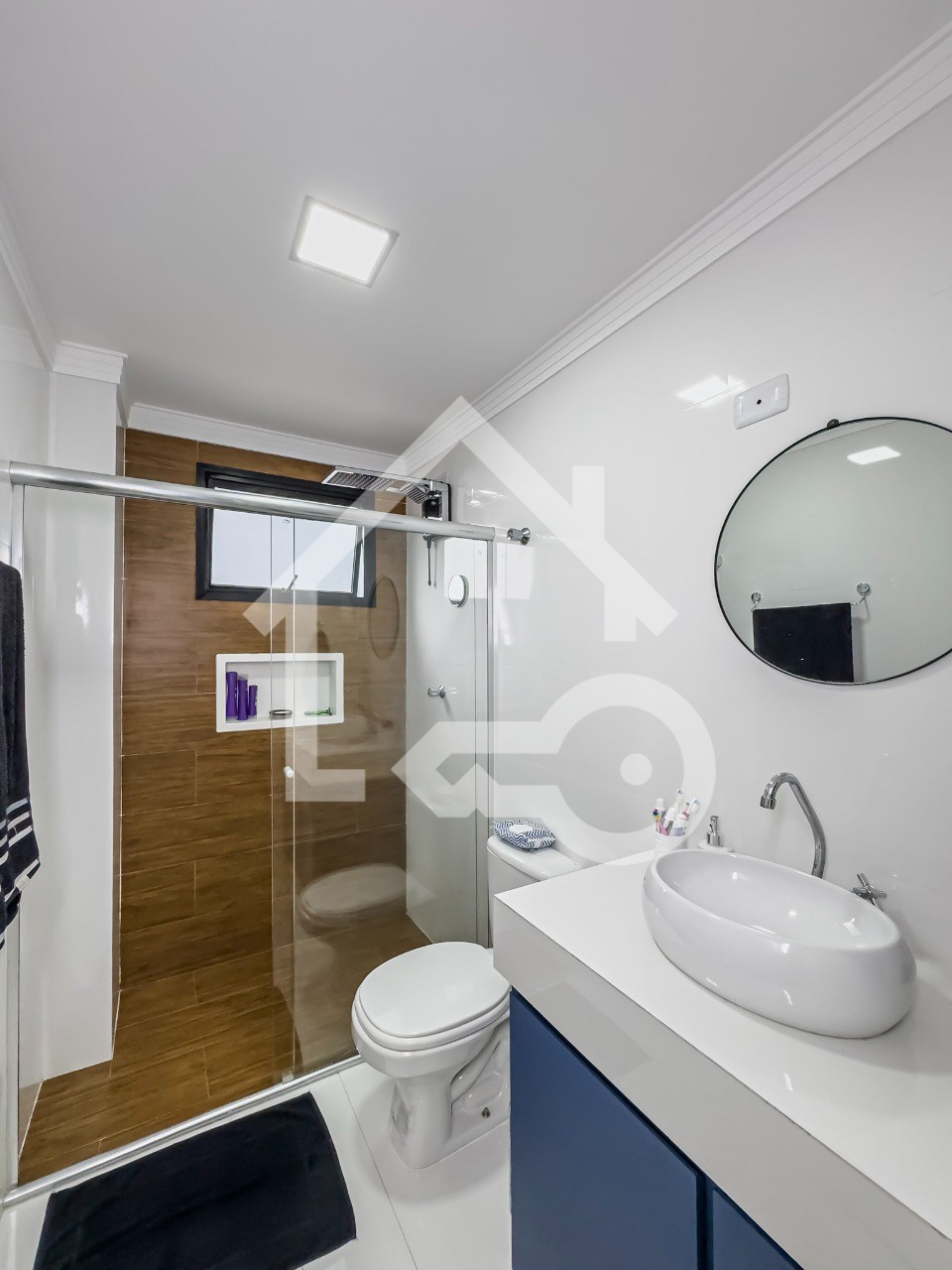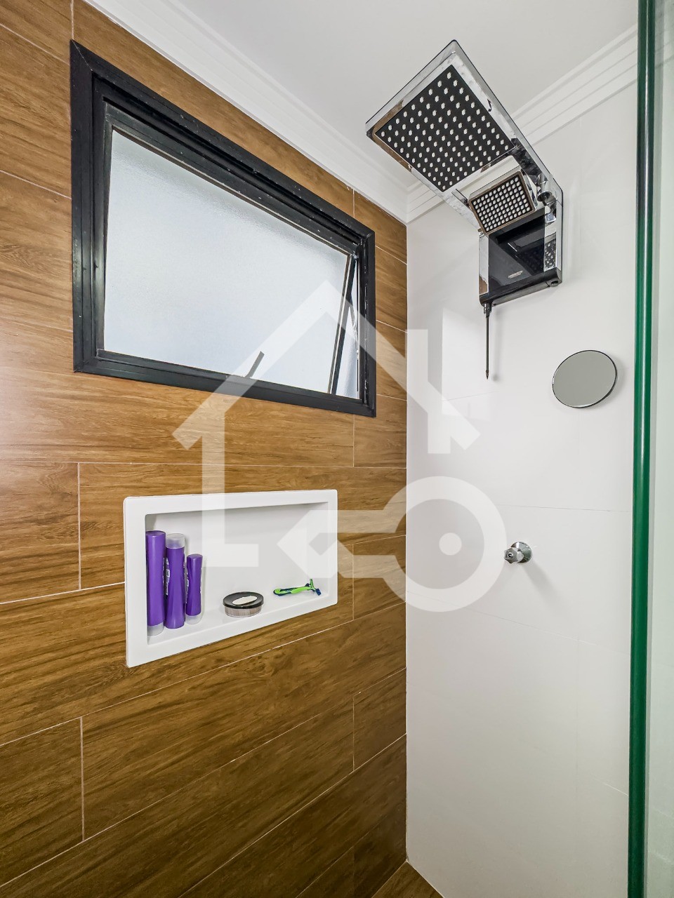 Banheiro com ventilação natural e box em vidro.