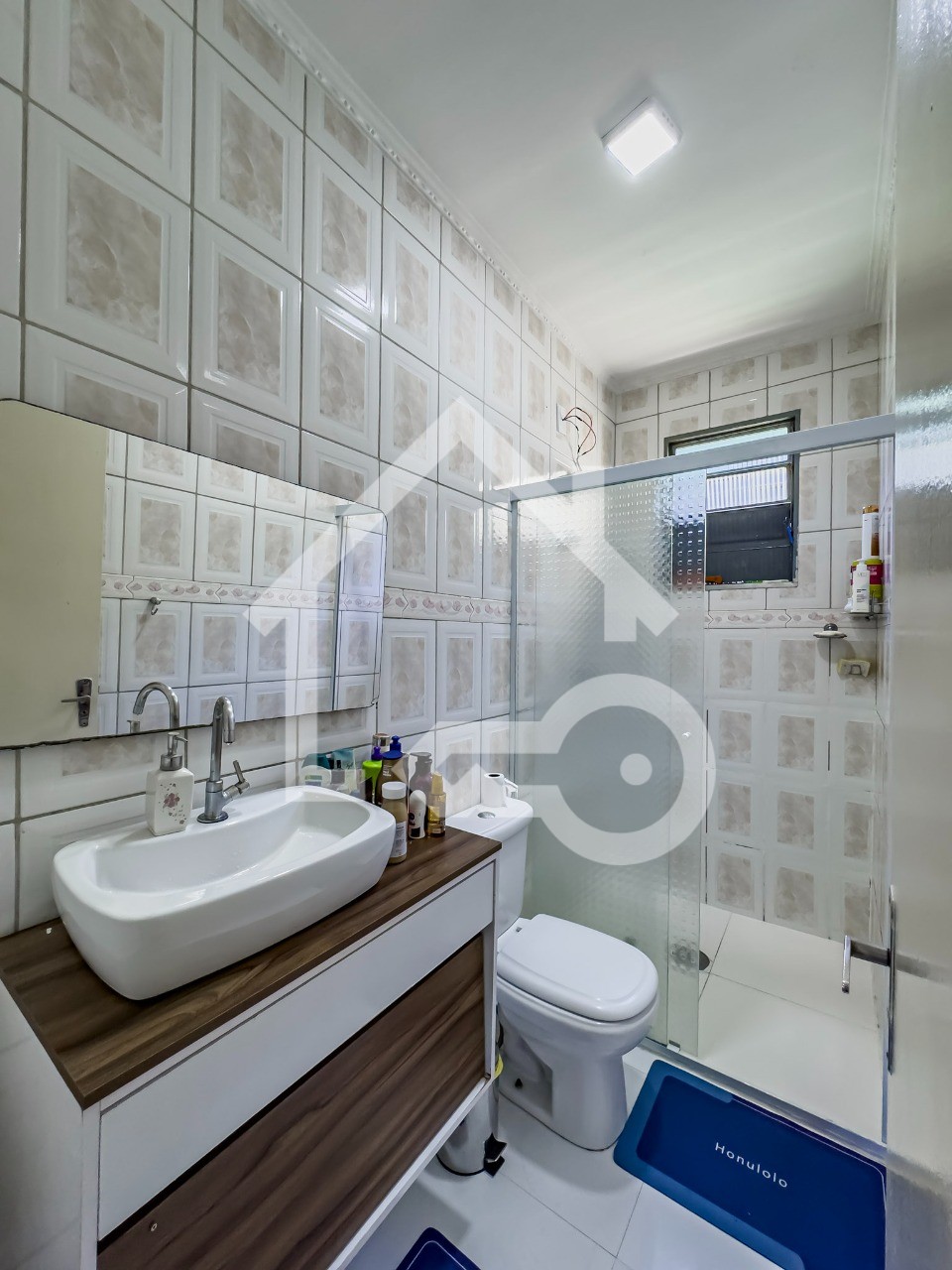 Banheiro com box em vidro.