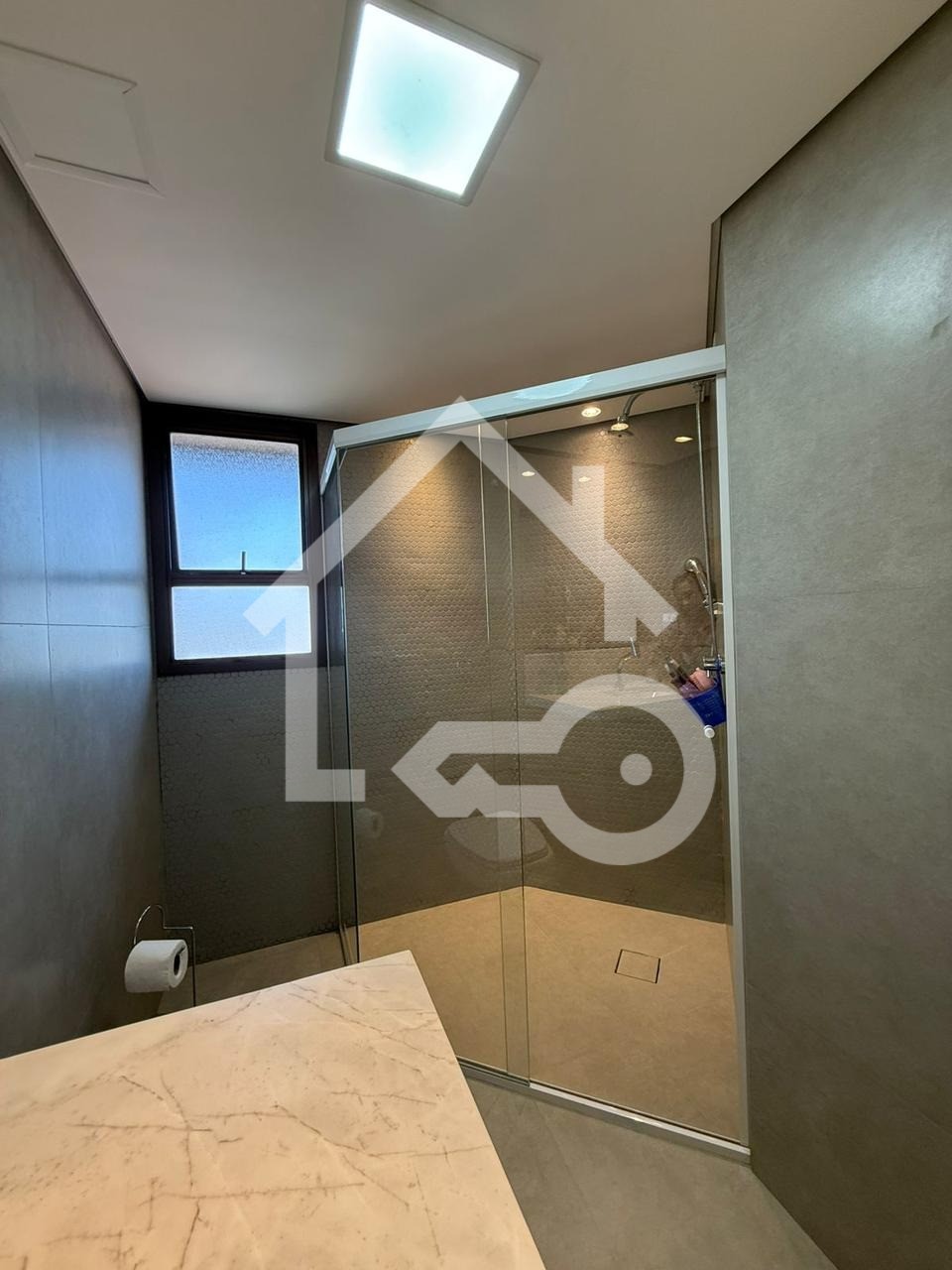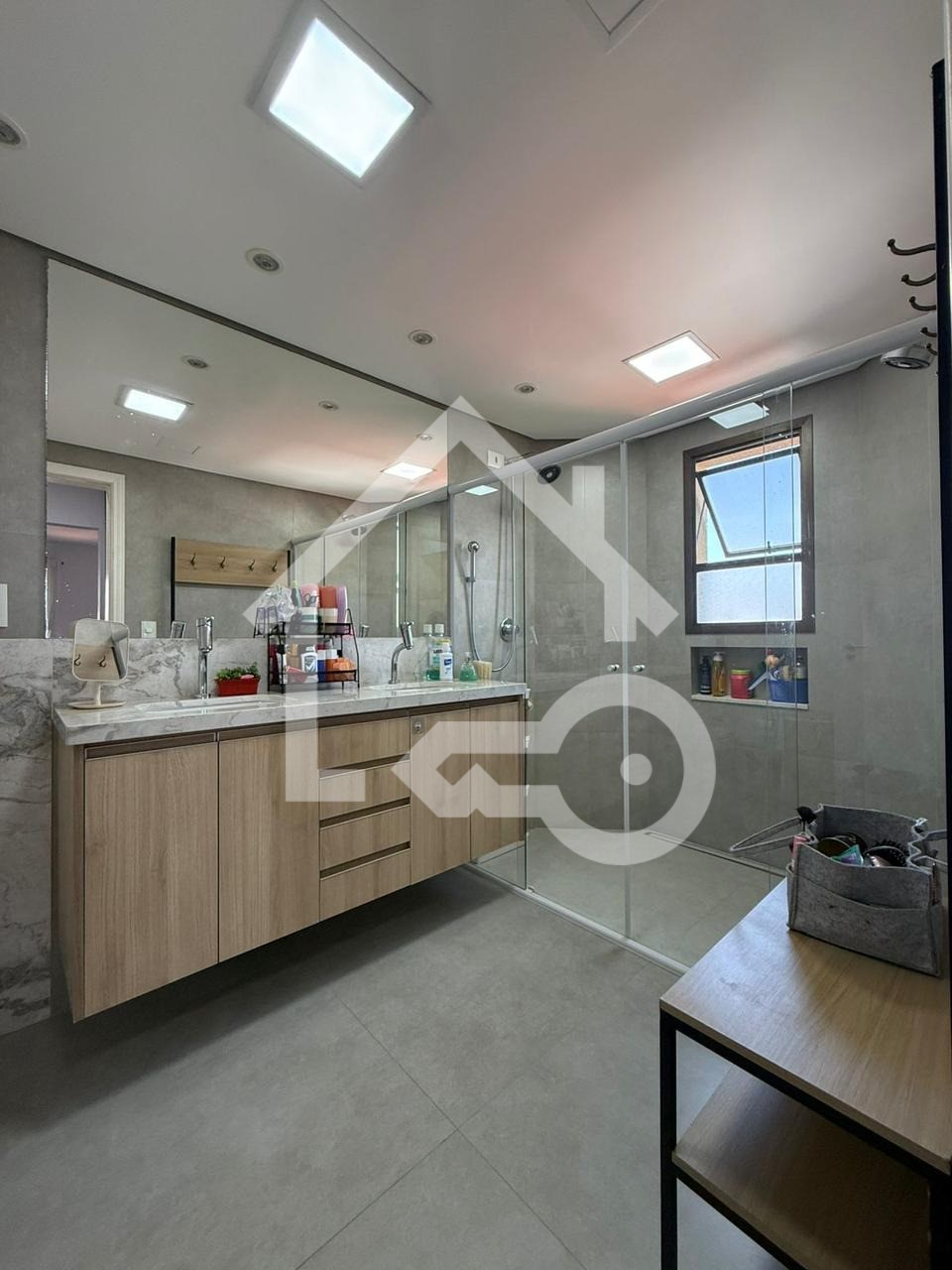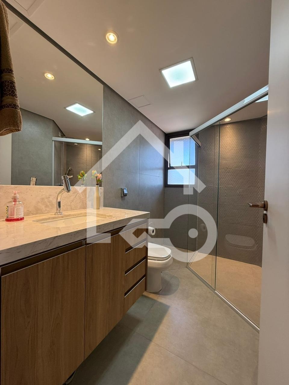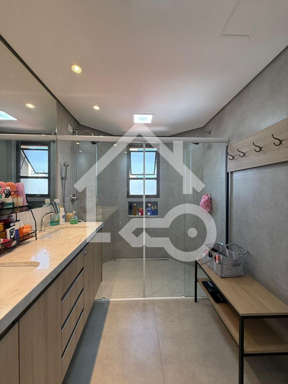 Banheiros com ventilação natural e box em vidro.