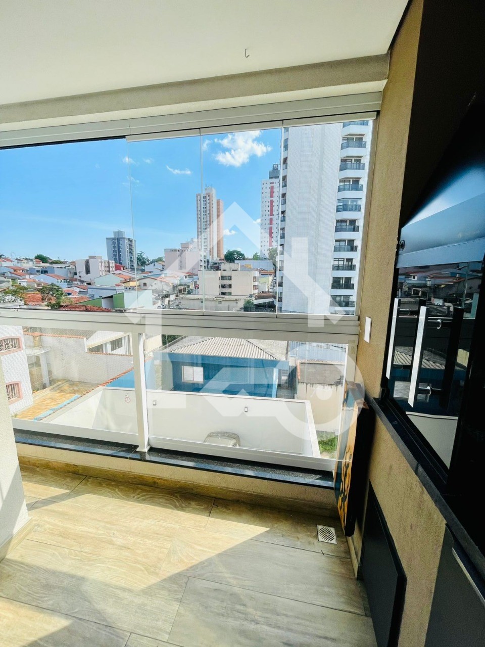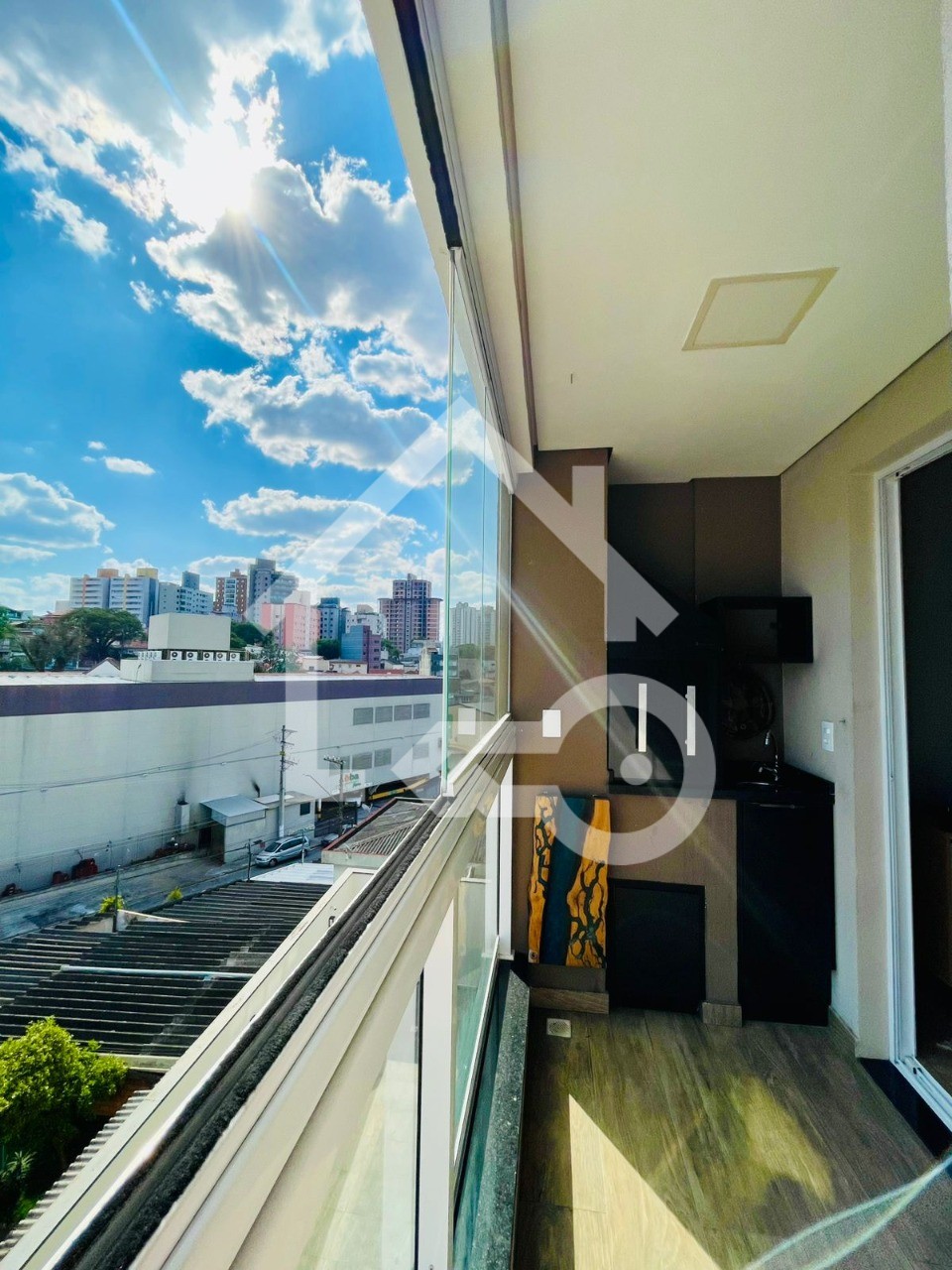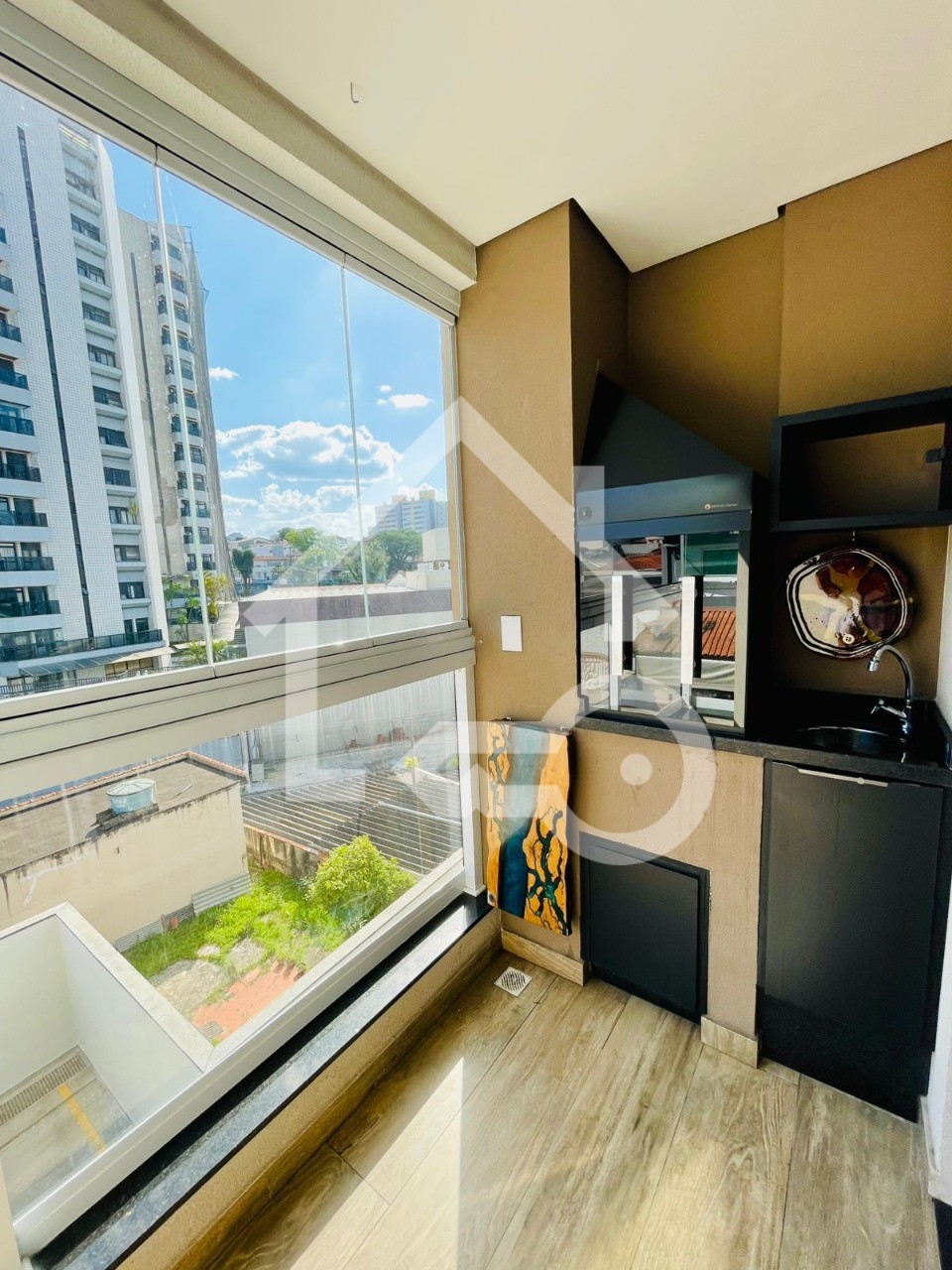 Varanda gourmet com churrasqueira e com fechamento em vidro.