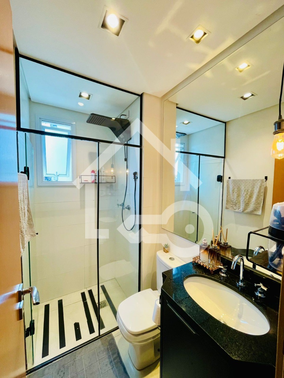 Banheiro com ventilação natural e box em vidro.
