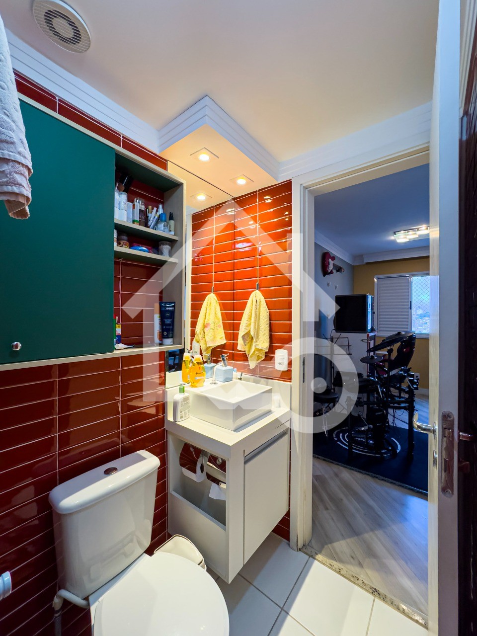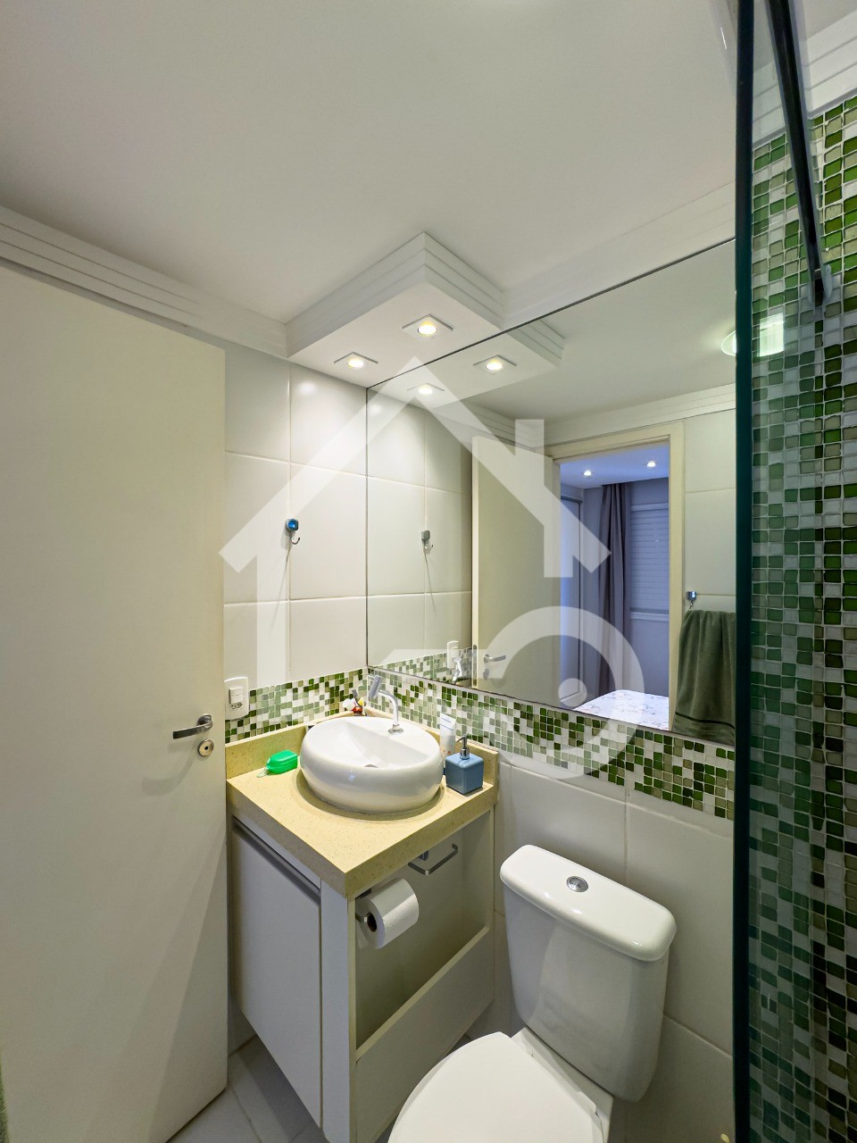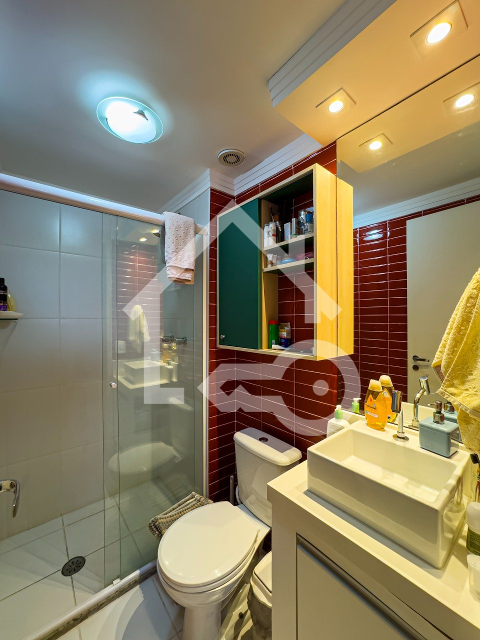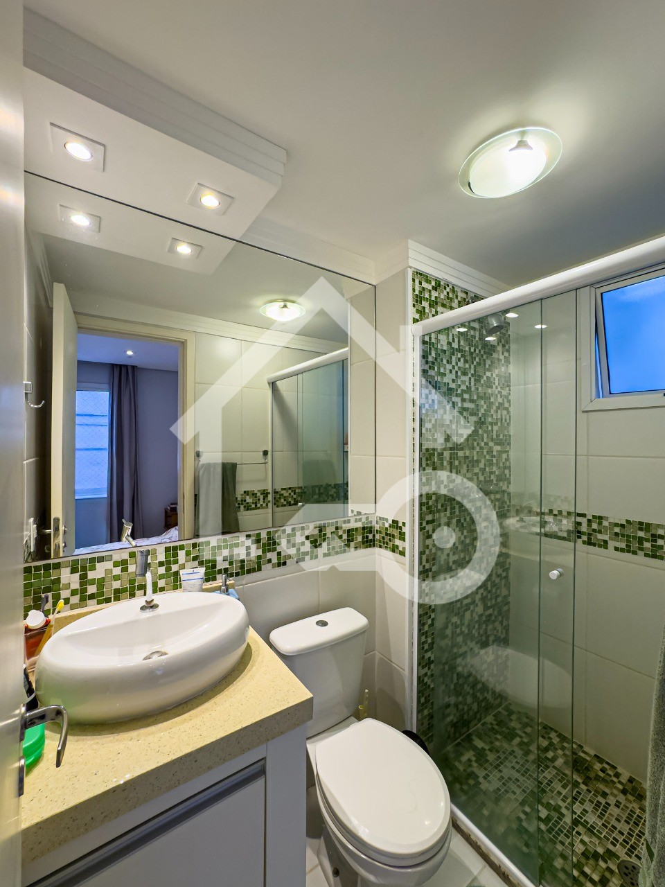 Banheiros com ventilação natural e box em vidro, também com armários planejados.