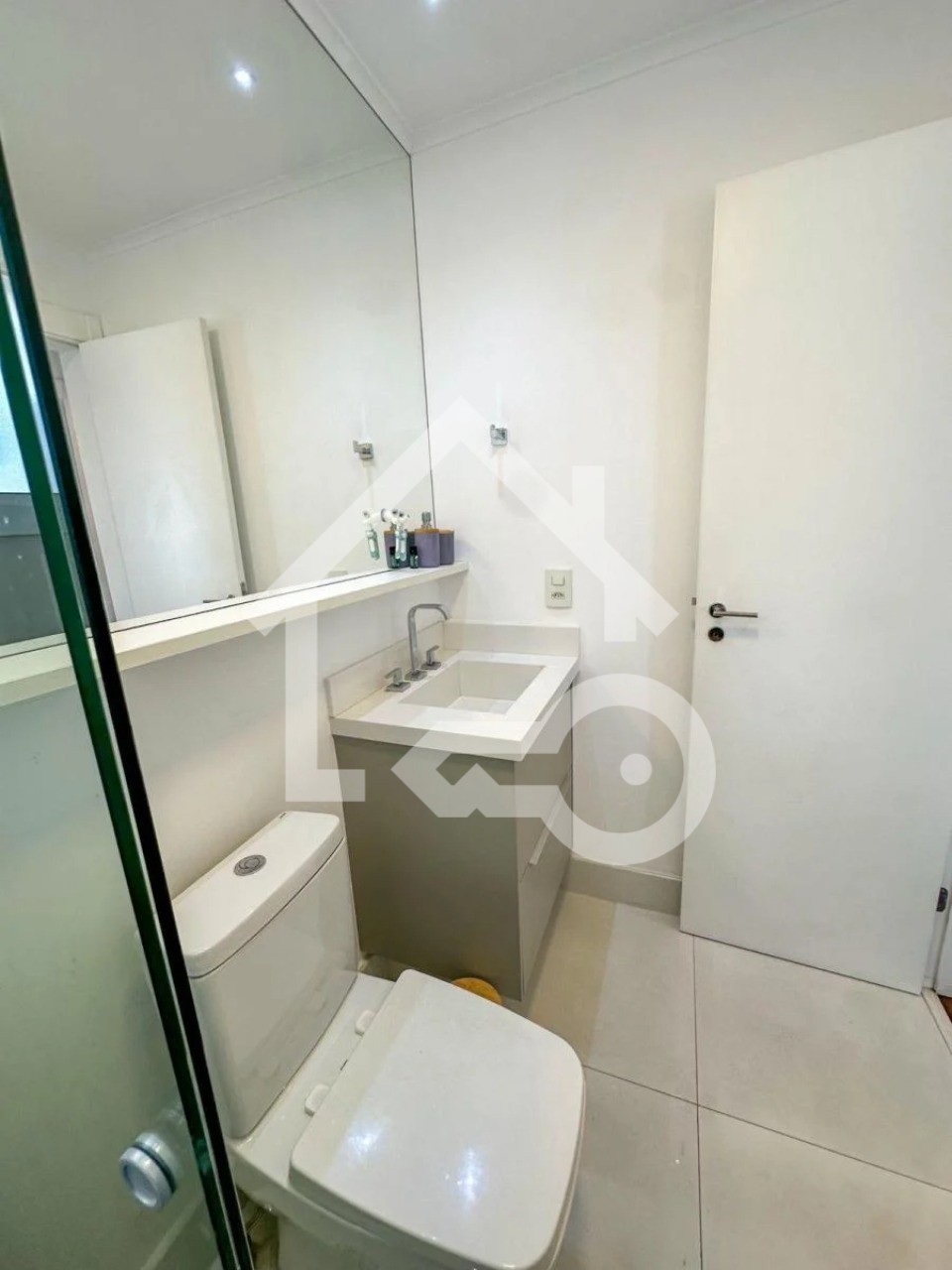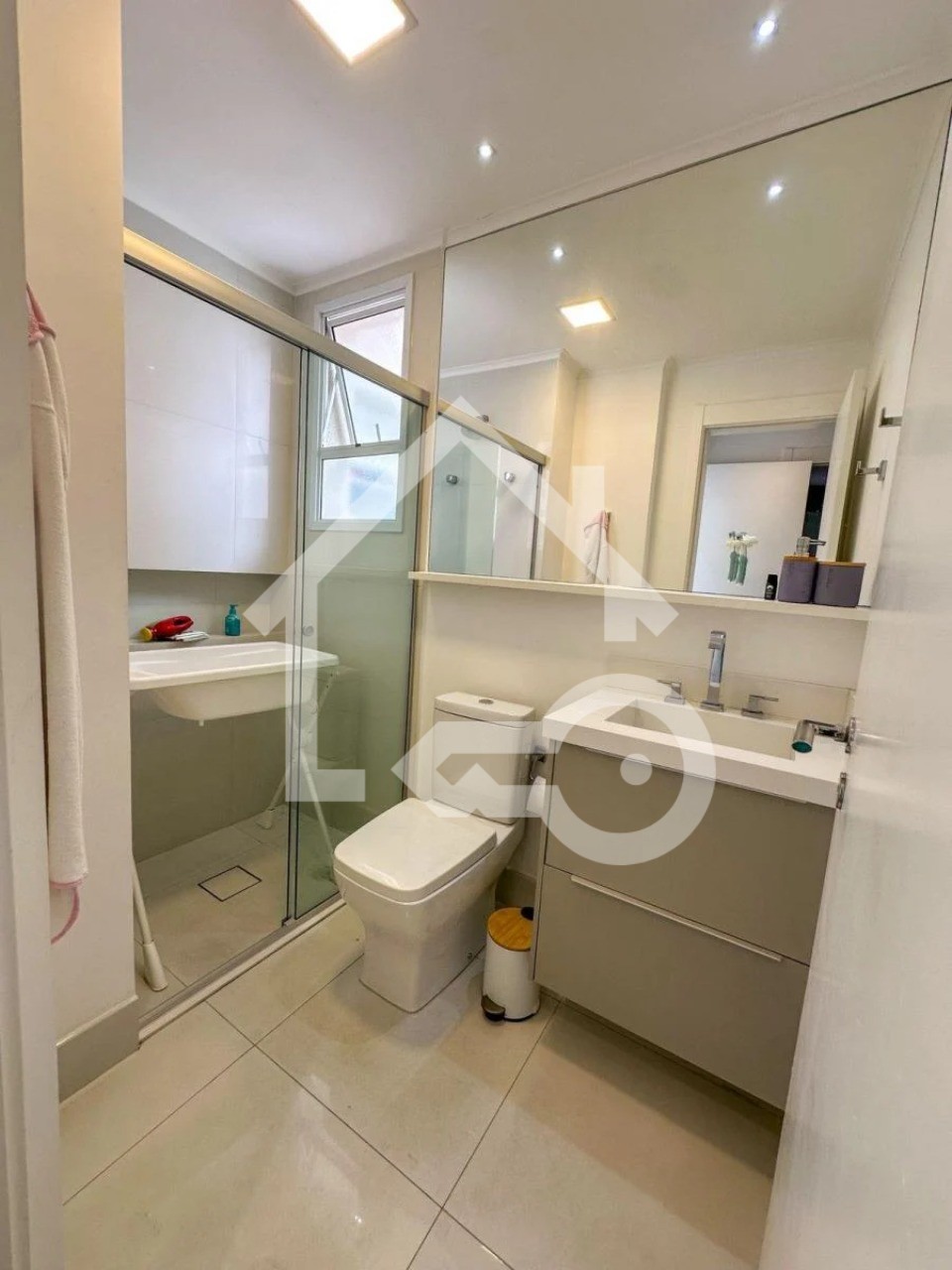 Banheiros com ventilação natural e box em vidro.