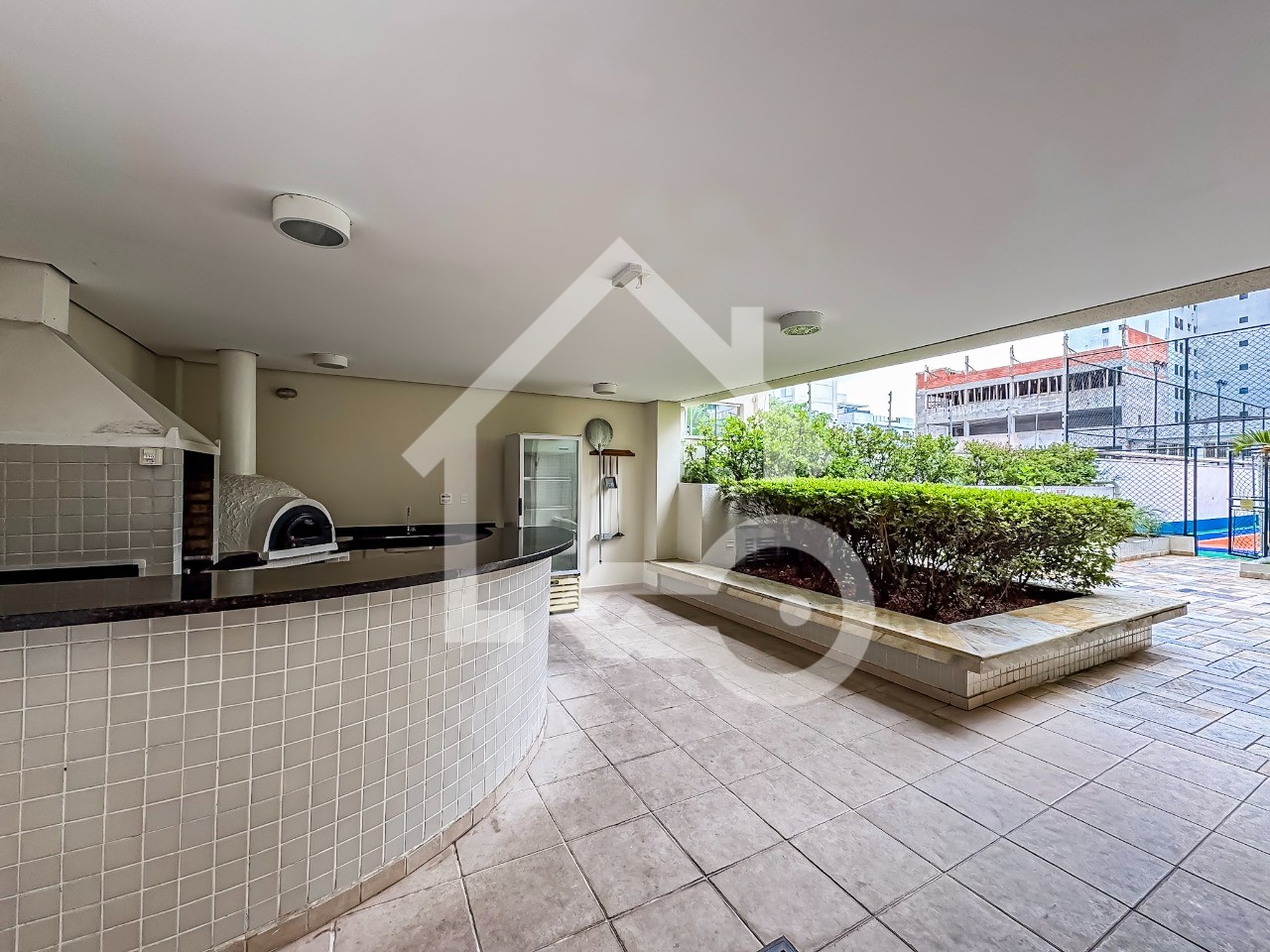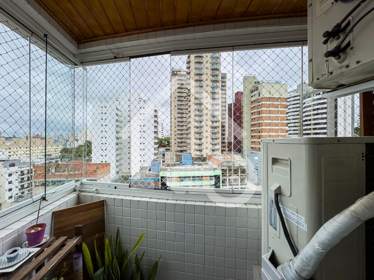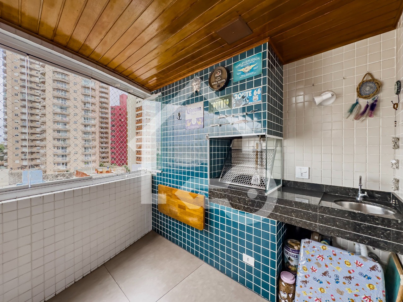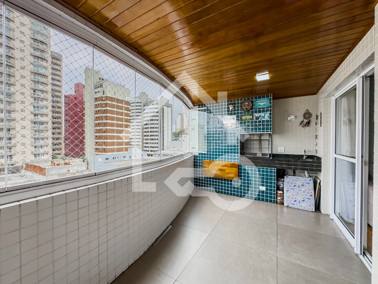 Varanda gourmet com churrasqueira a carvão com fechamento em vidro e telas de proteção.