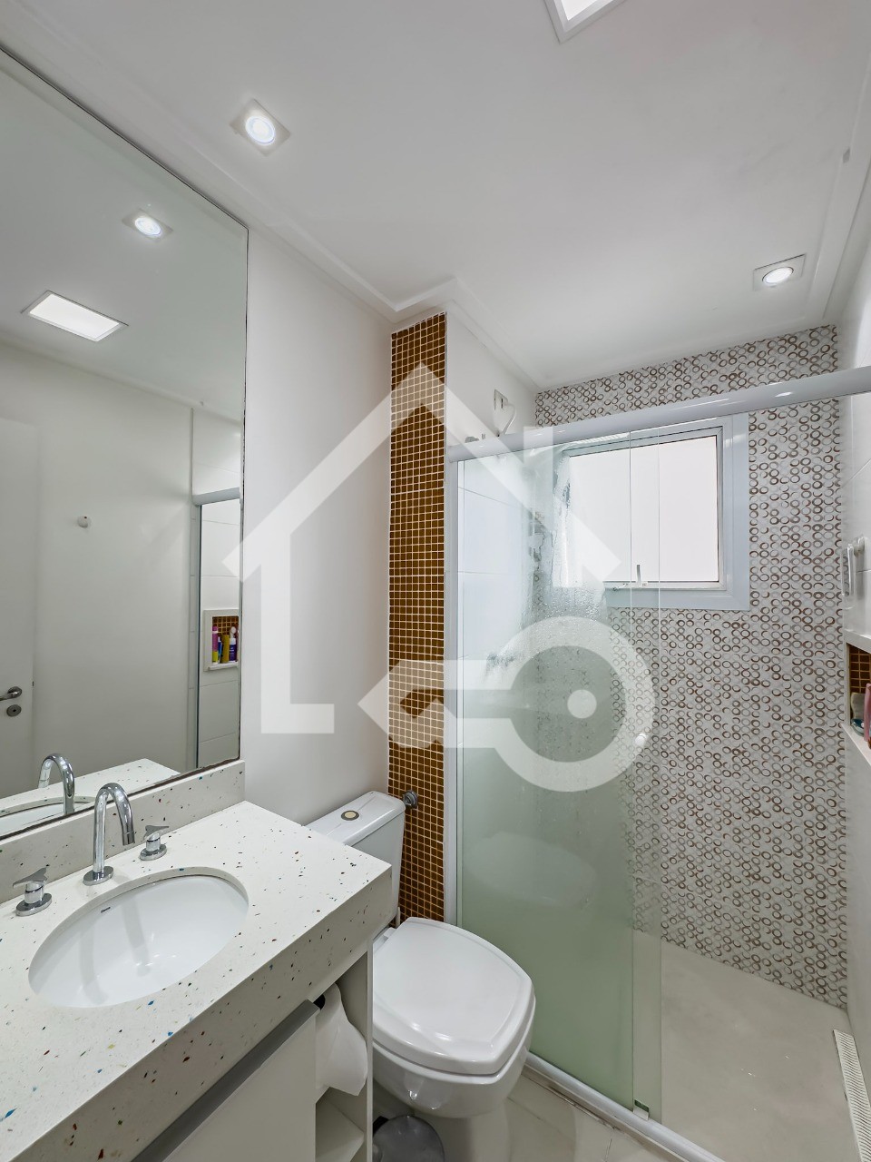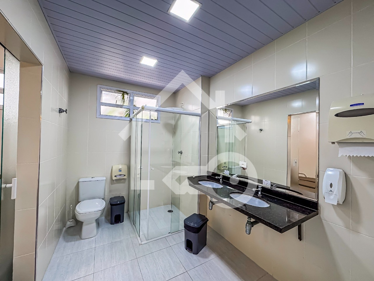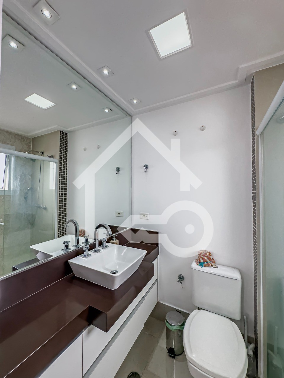 Banheiros com ventilação natural e box em vidro.