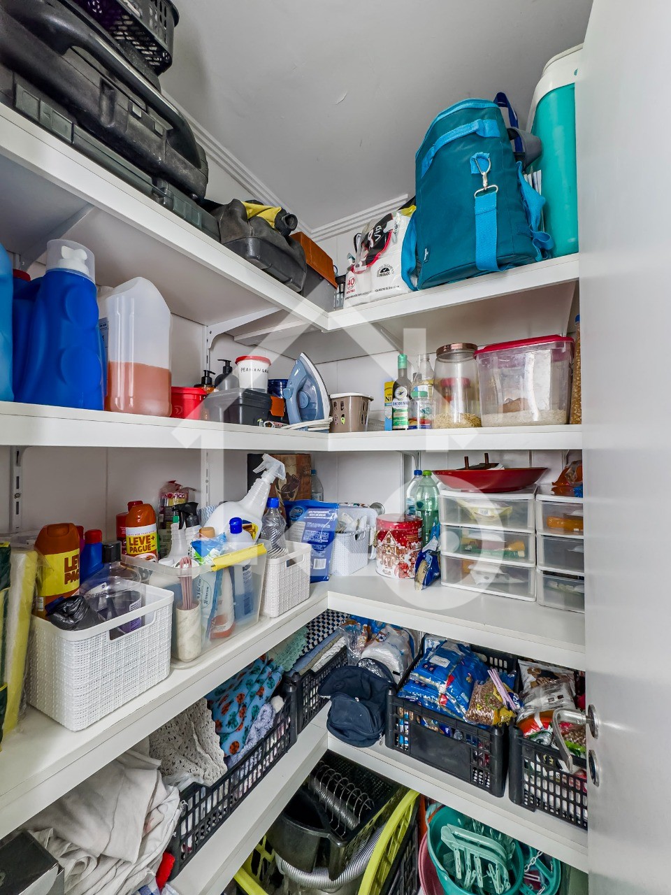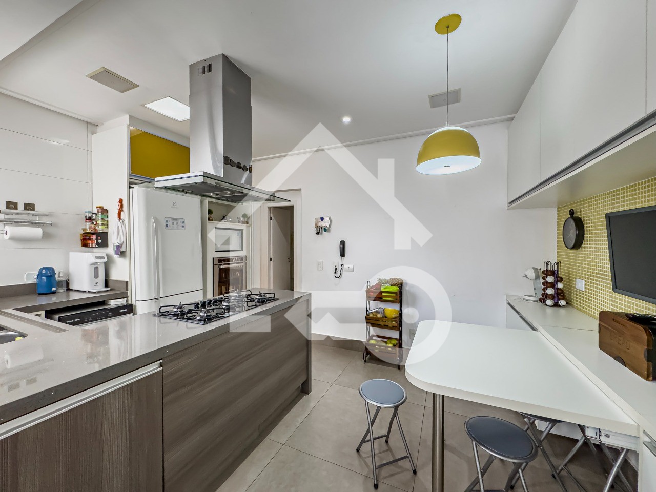 Cozinha ampla com ilha, despensa e área de serviço separada.