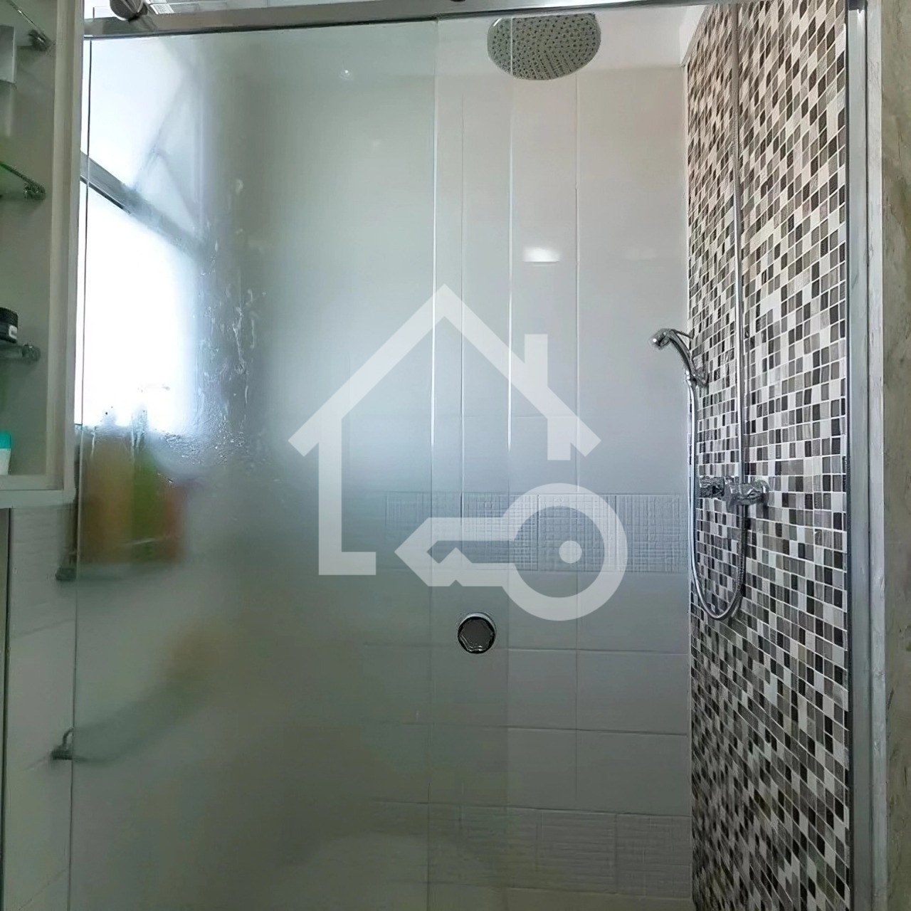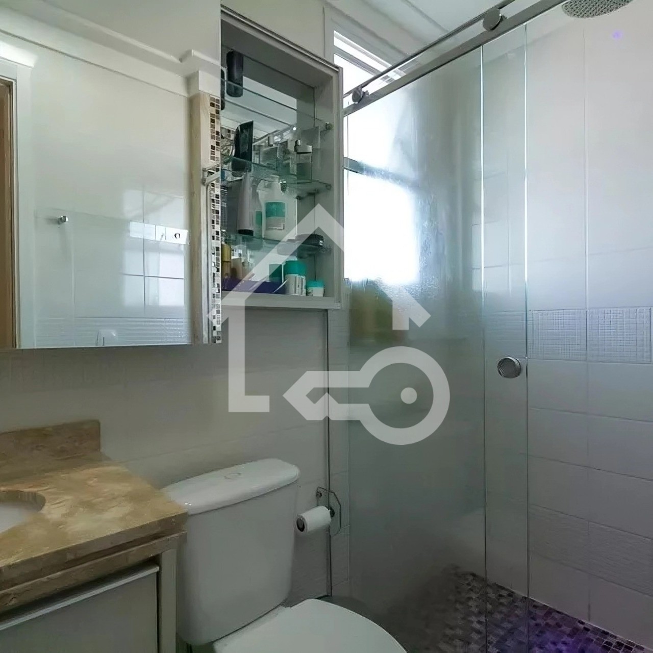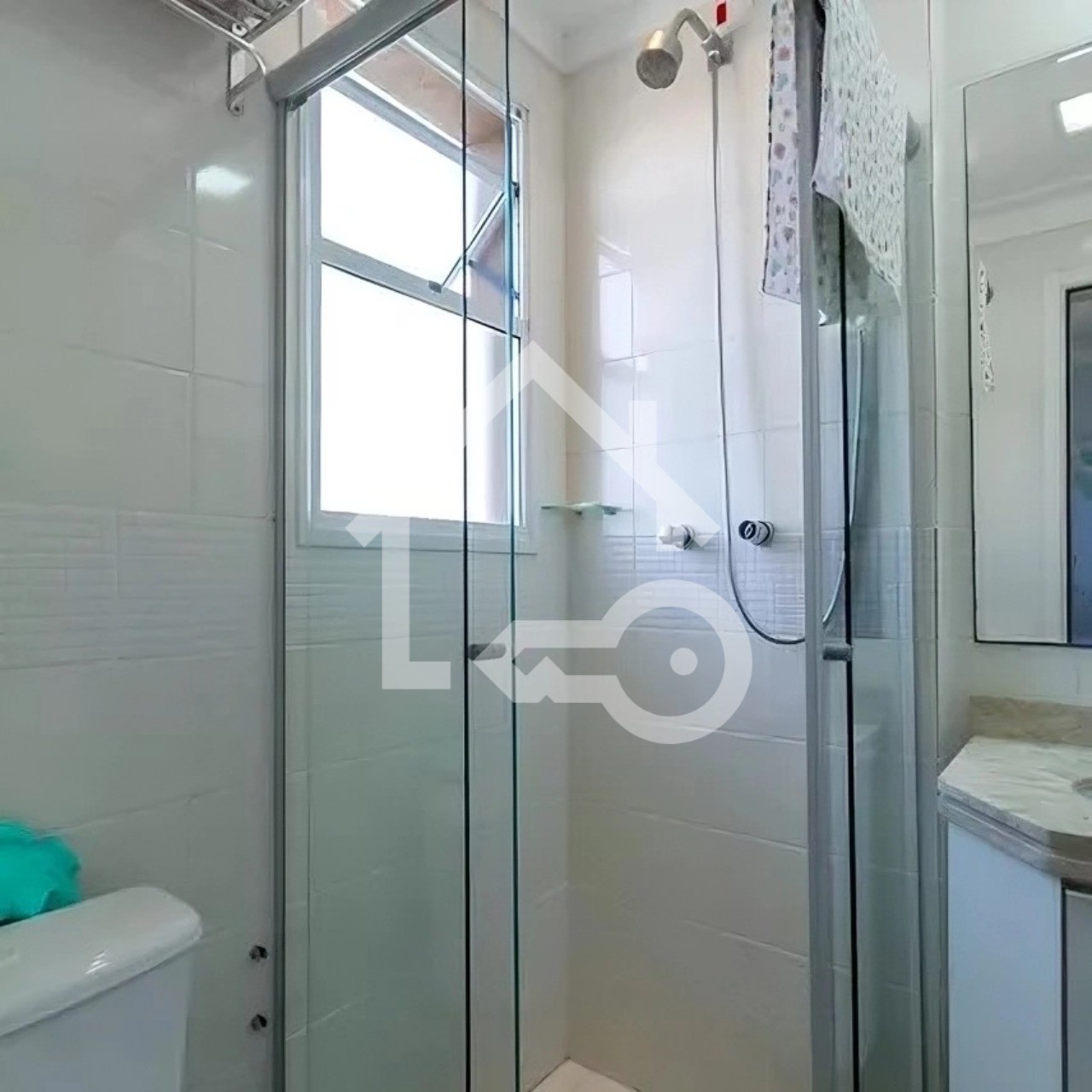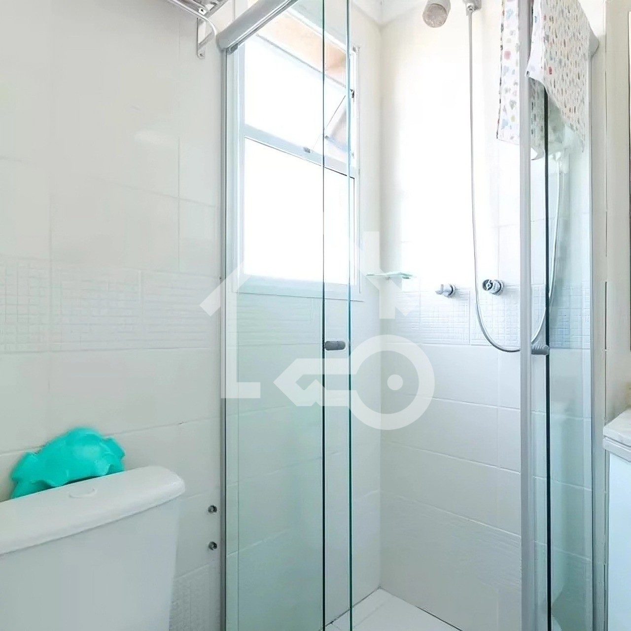 Banheiros com ventilação natural e box em vidro.