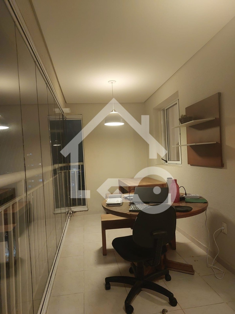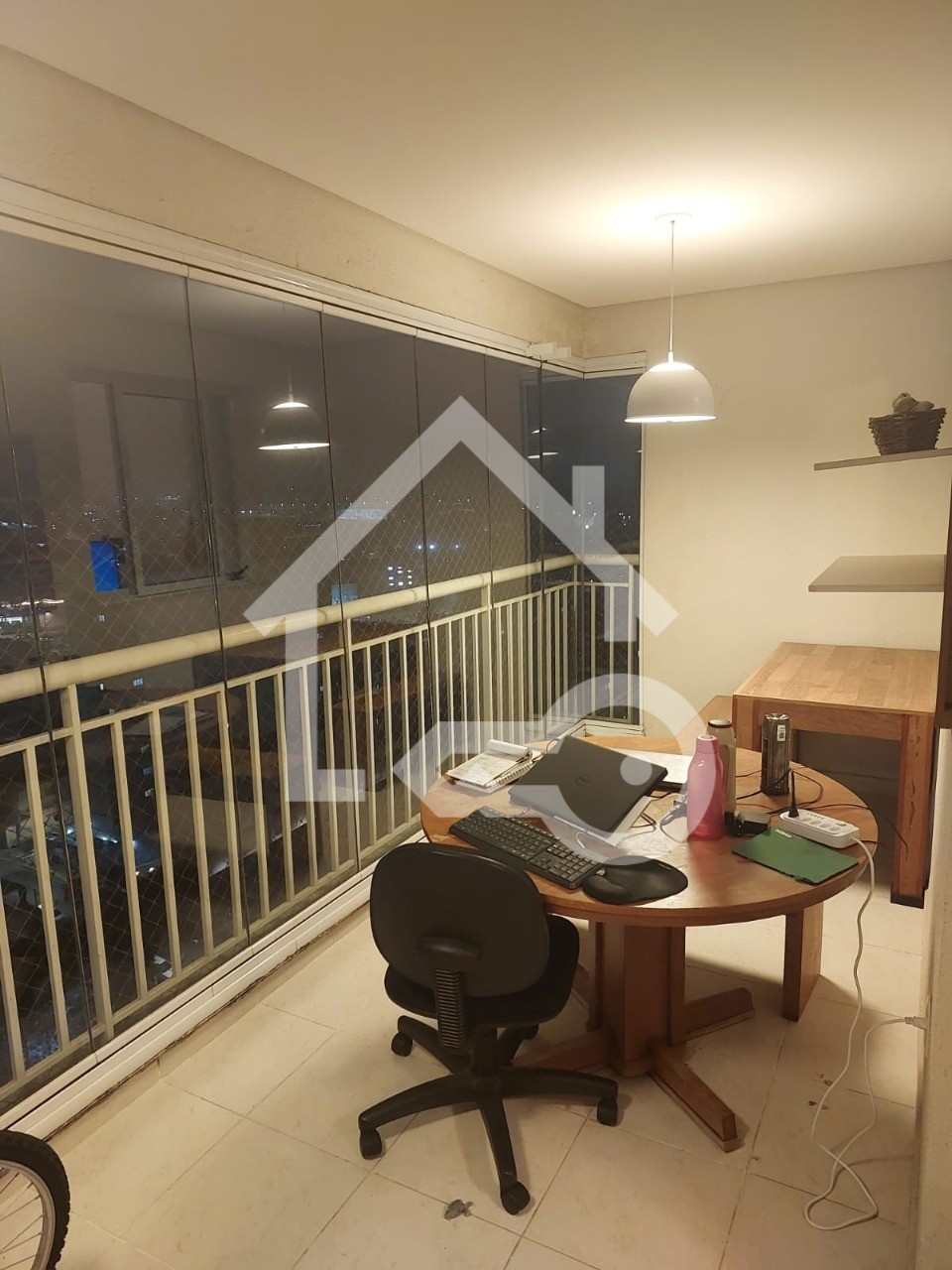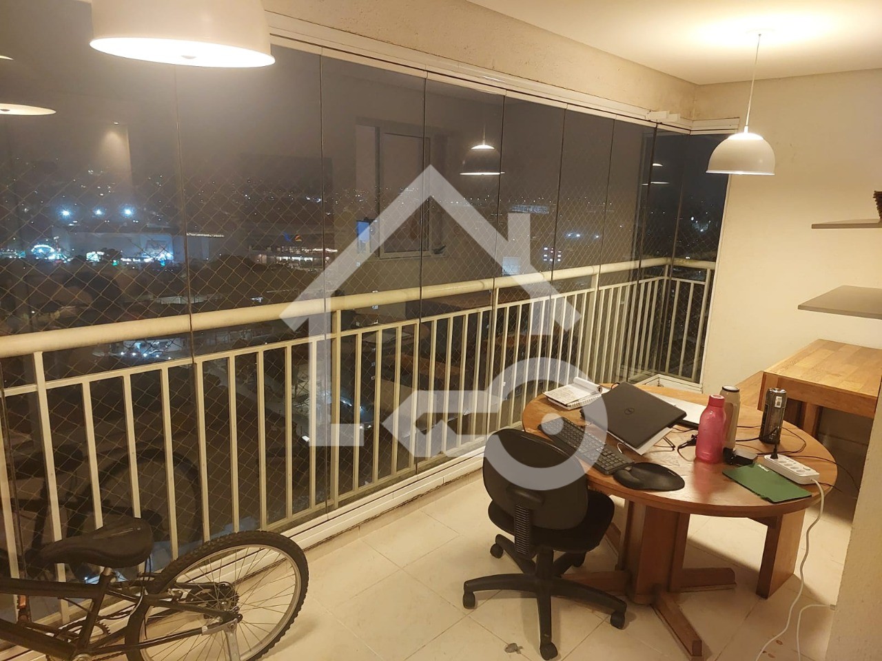 Varanda com fechamento em vidro e telas de proteção.