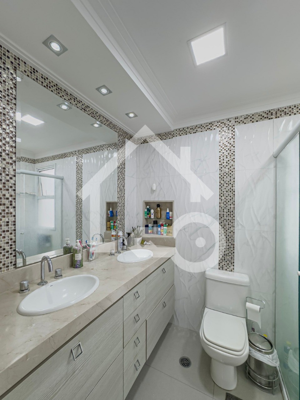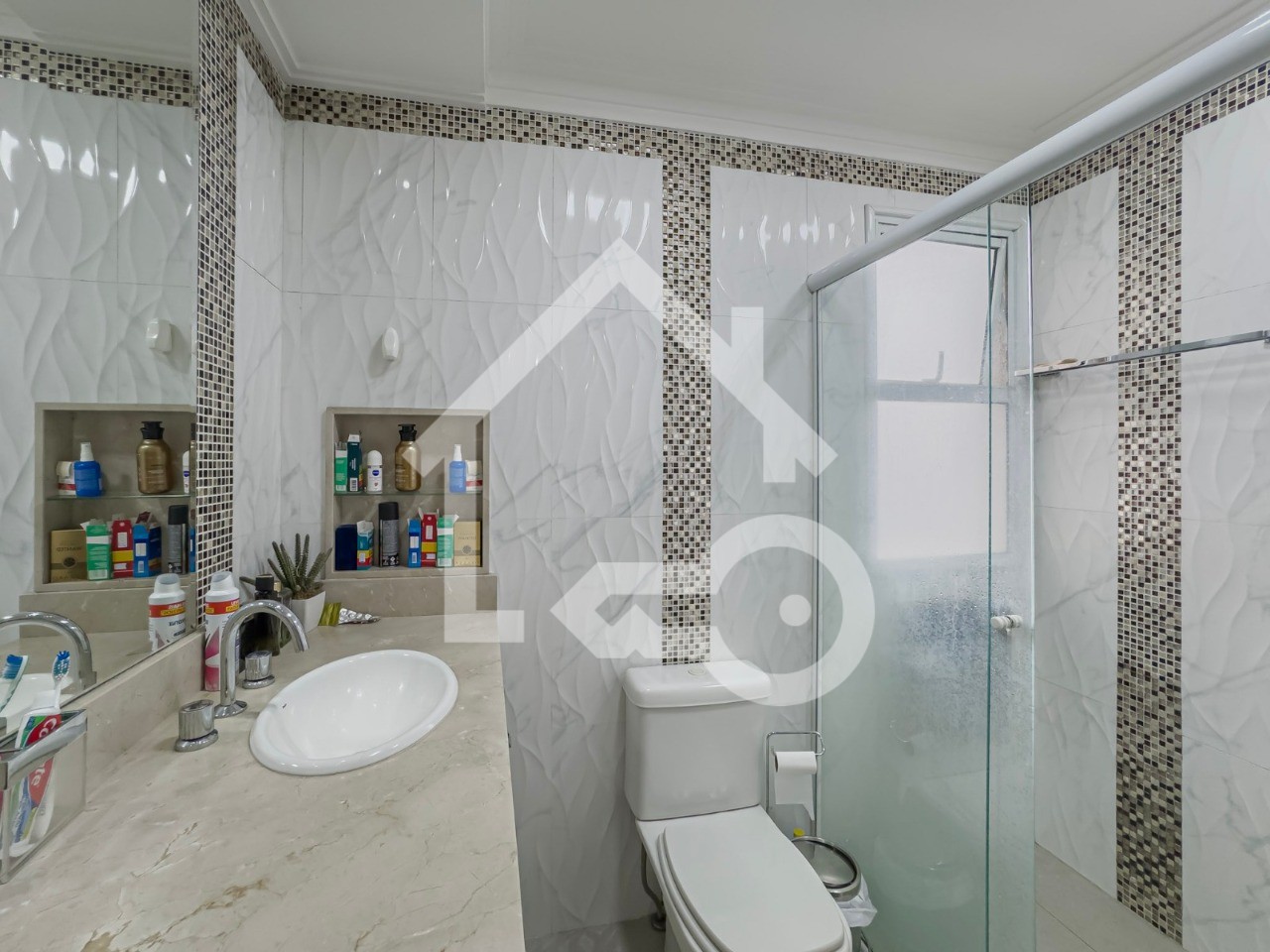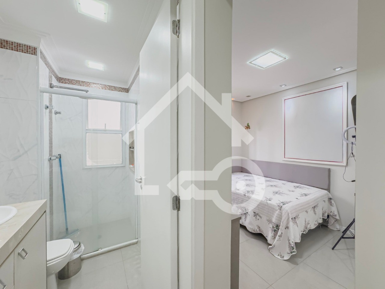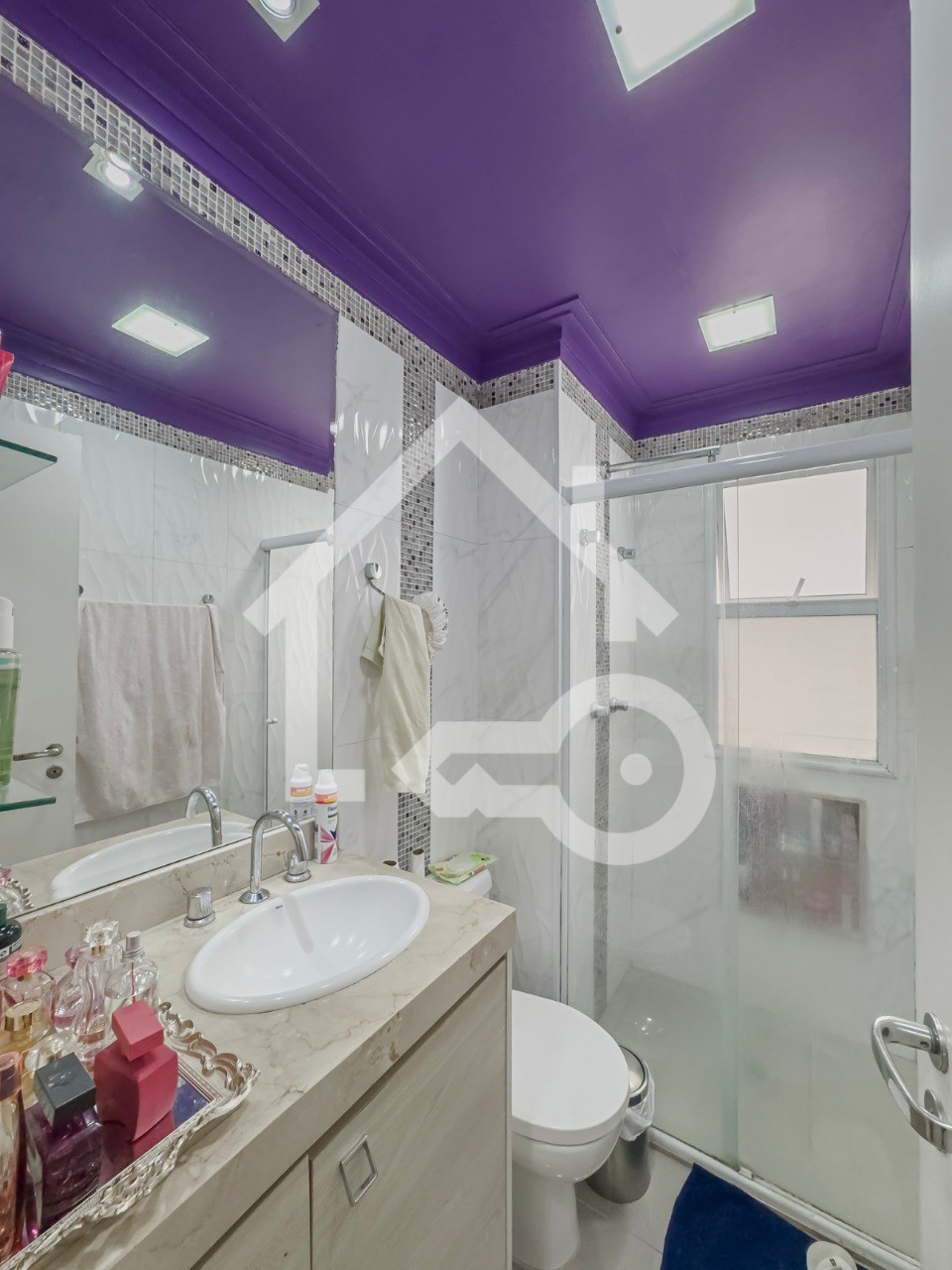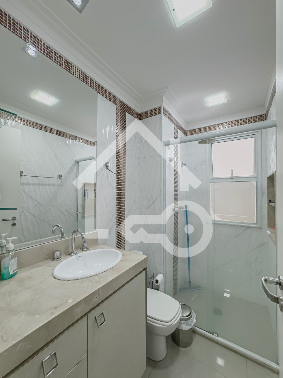 Banheiros com ventilação natural e box em vidro.