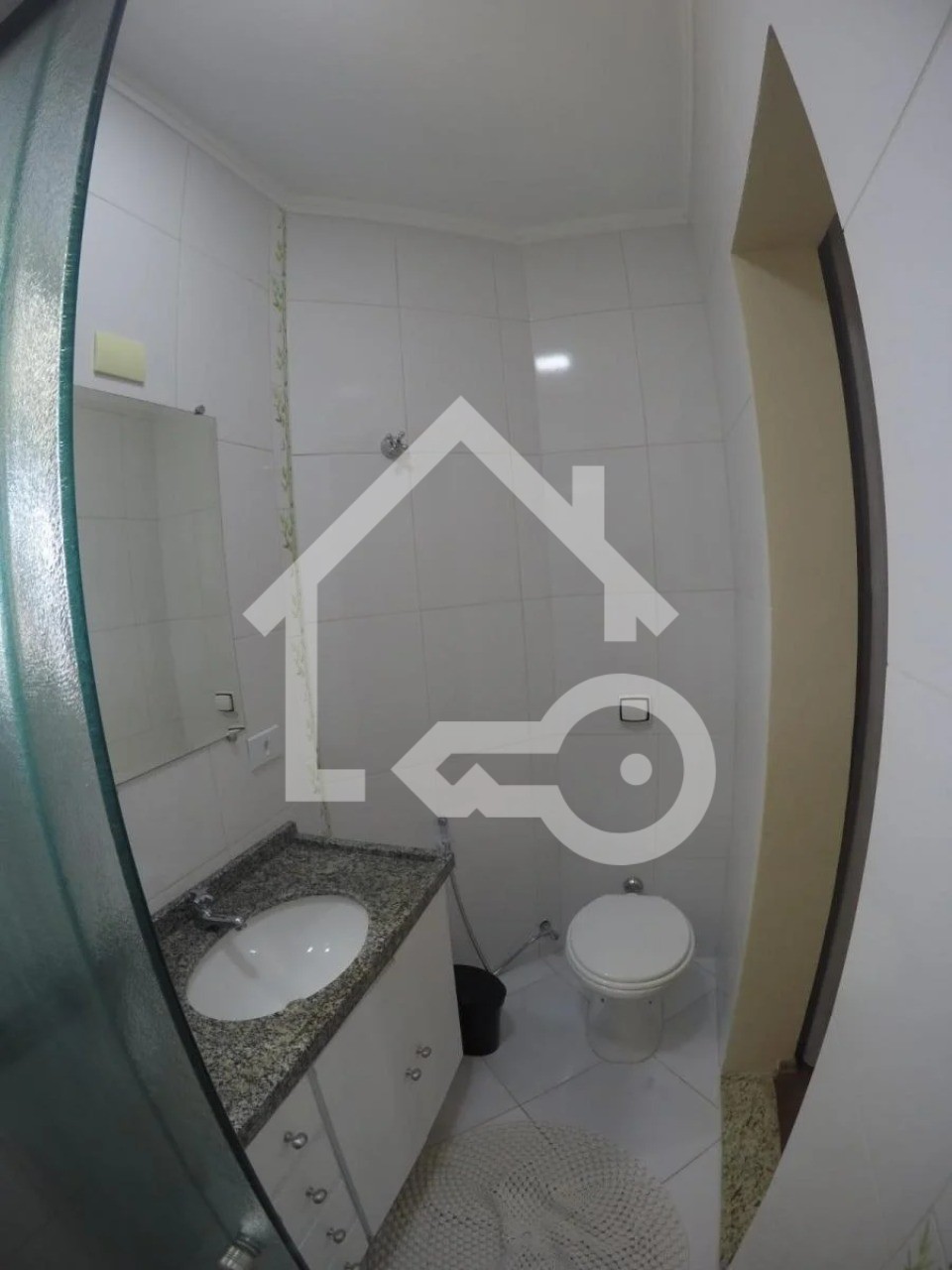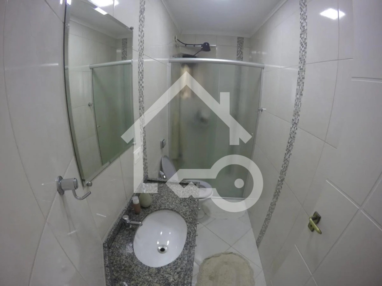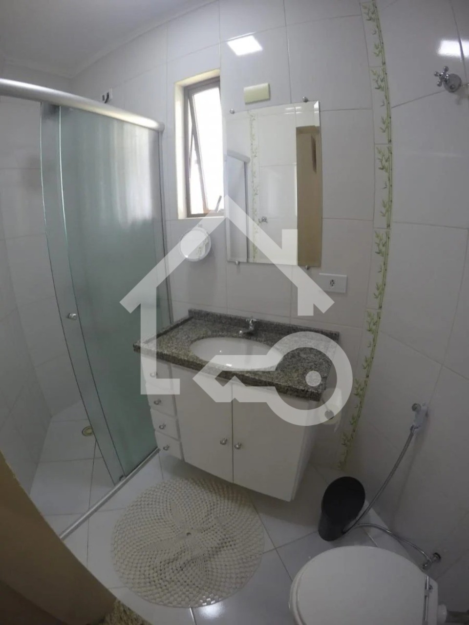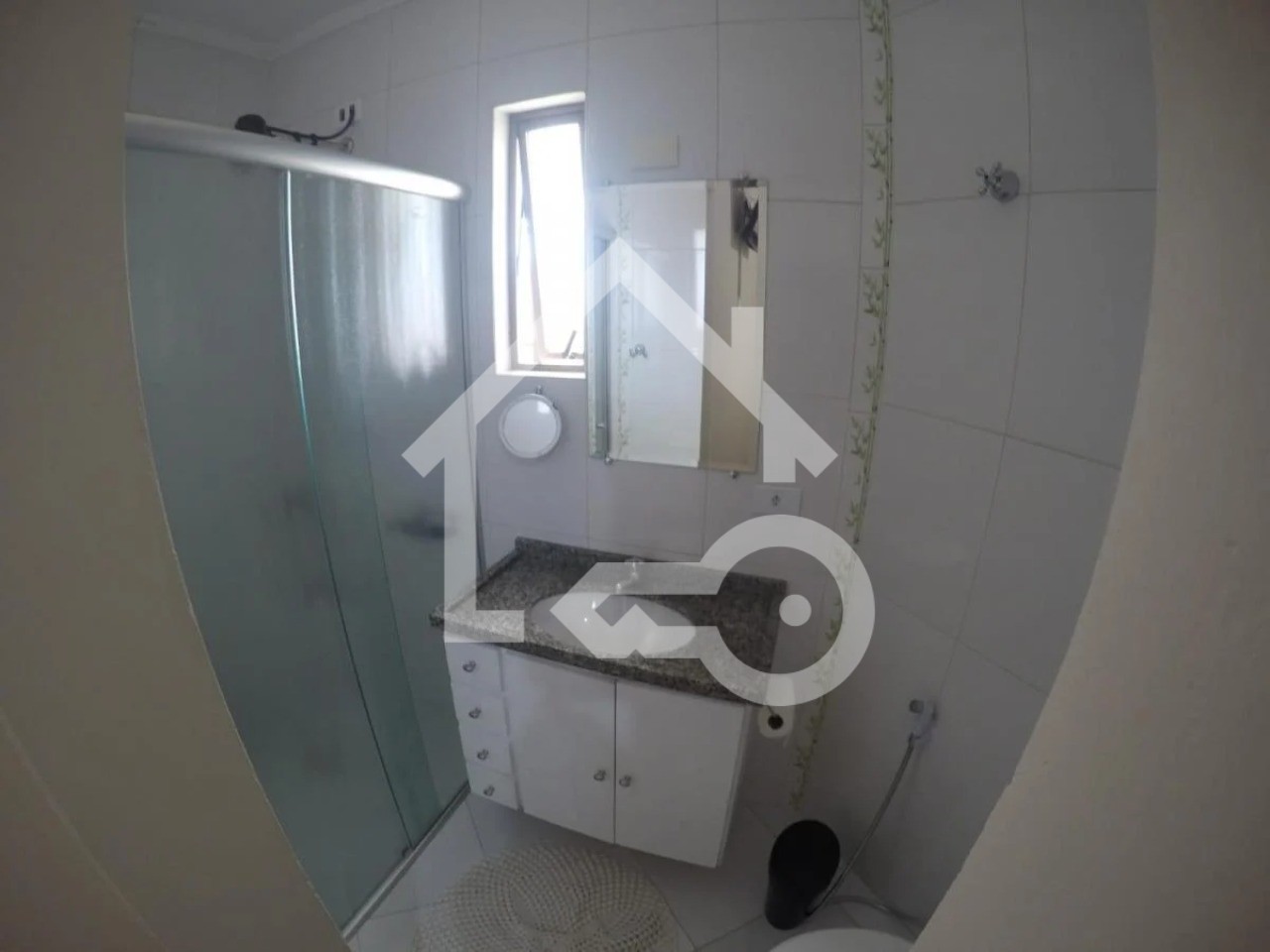 Banheiros com ventilação natural e box em vidro.