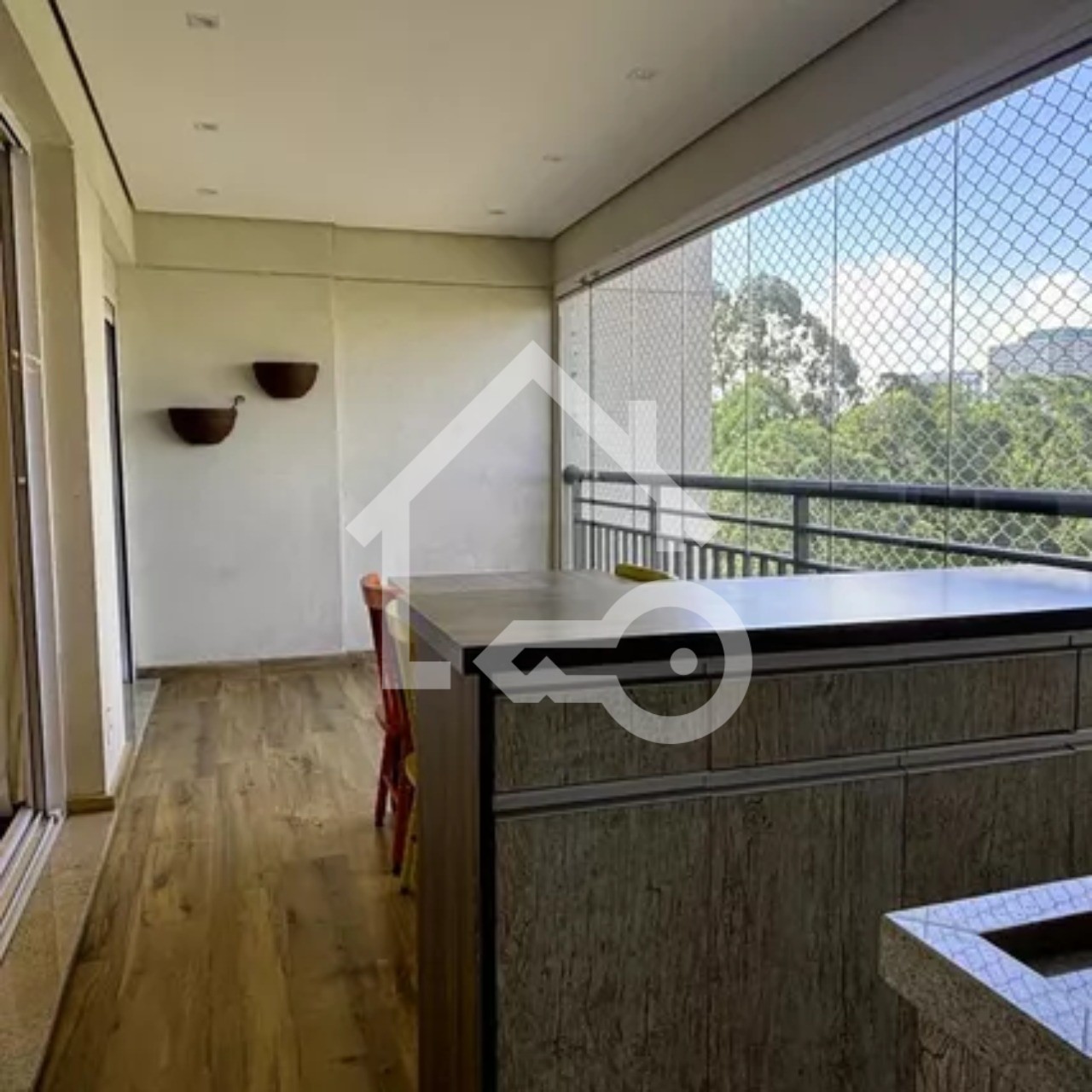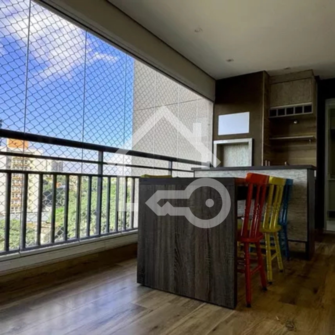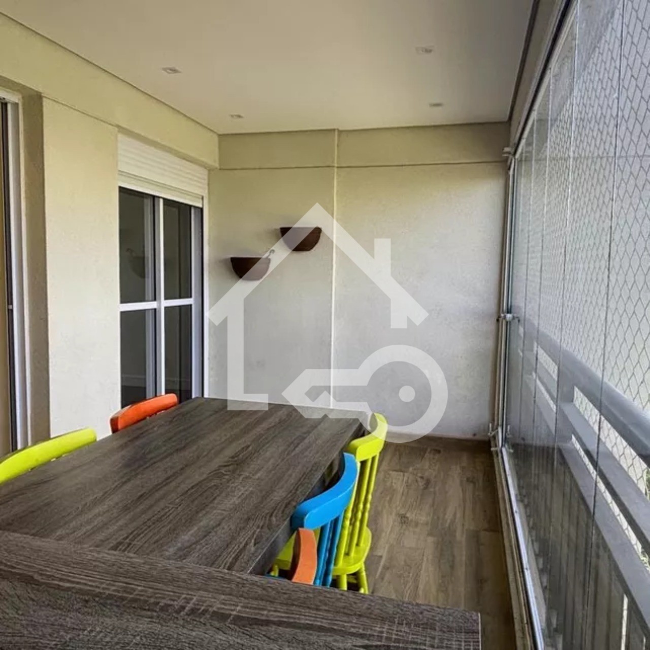 Varanda com fechamento em vidro e telas de proteção.