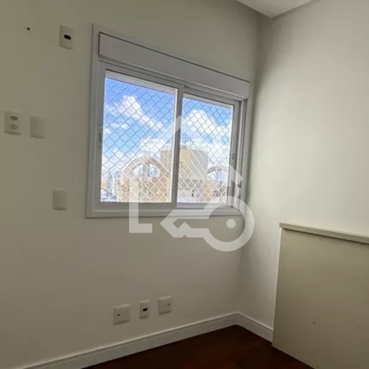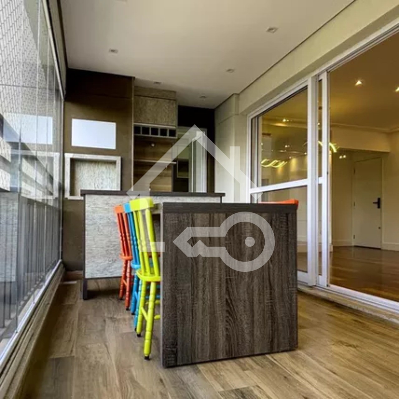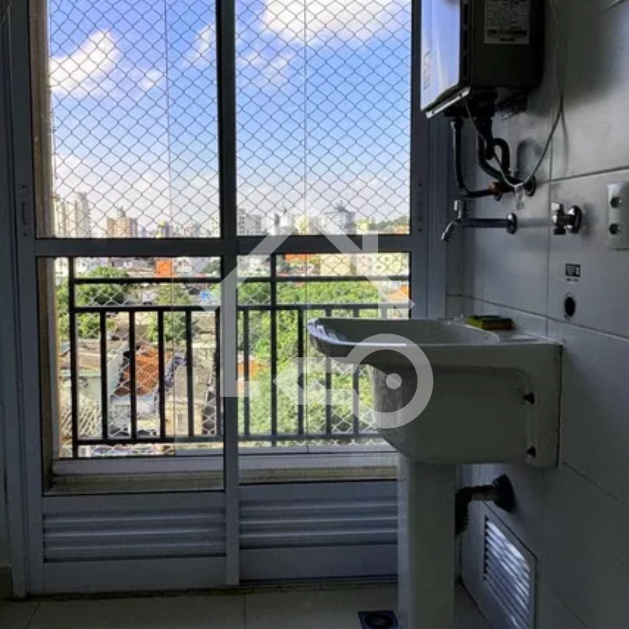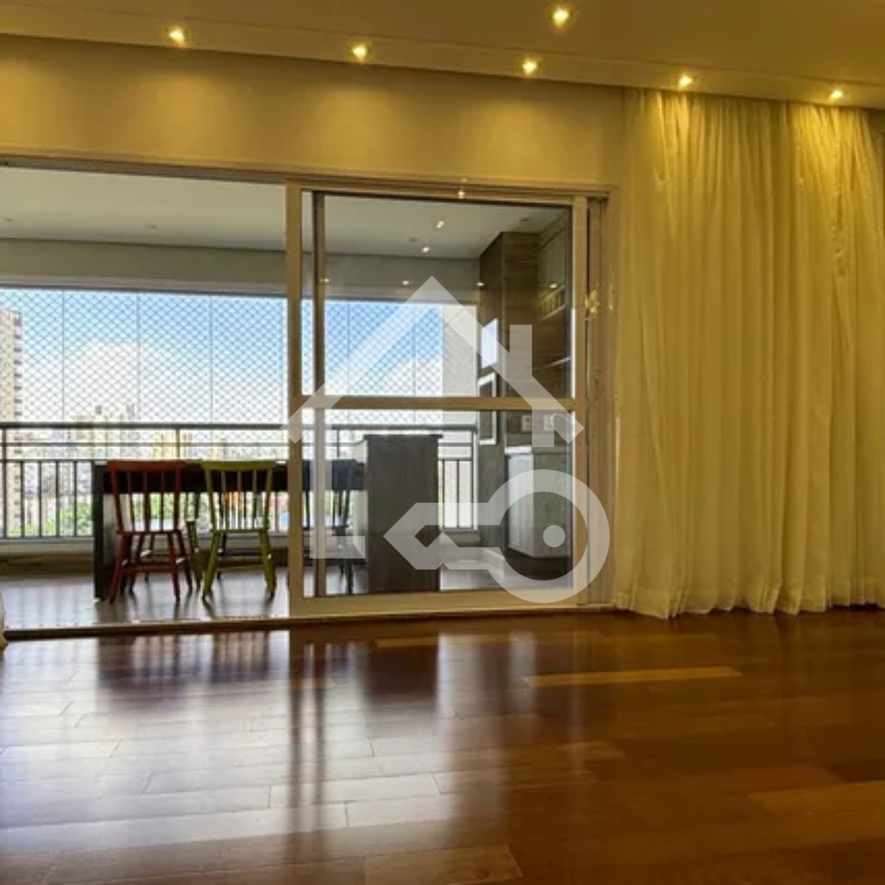 Varanda com fechamento em vidro e telas de proteção.