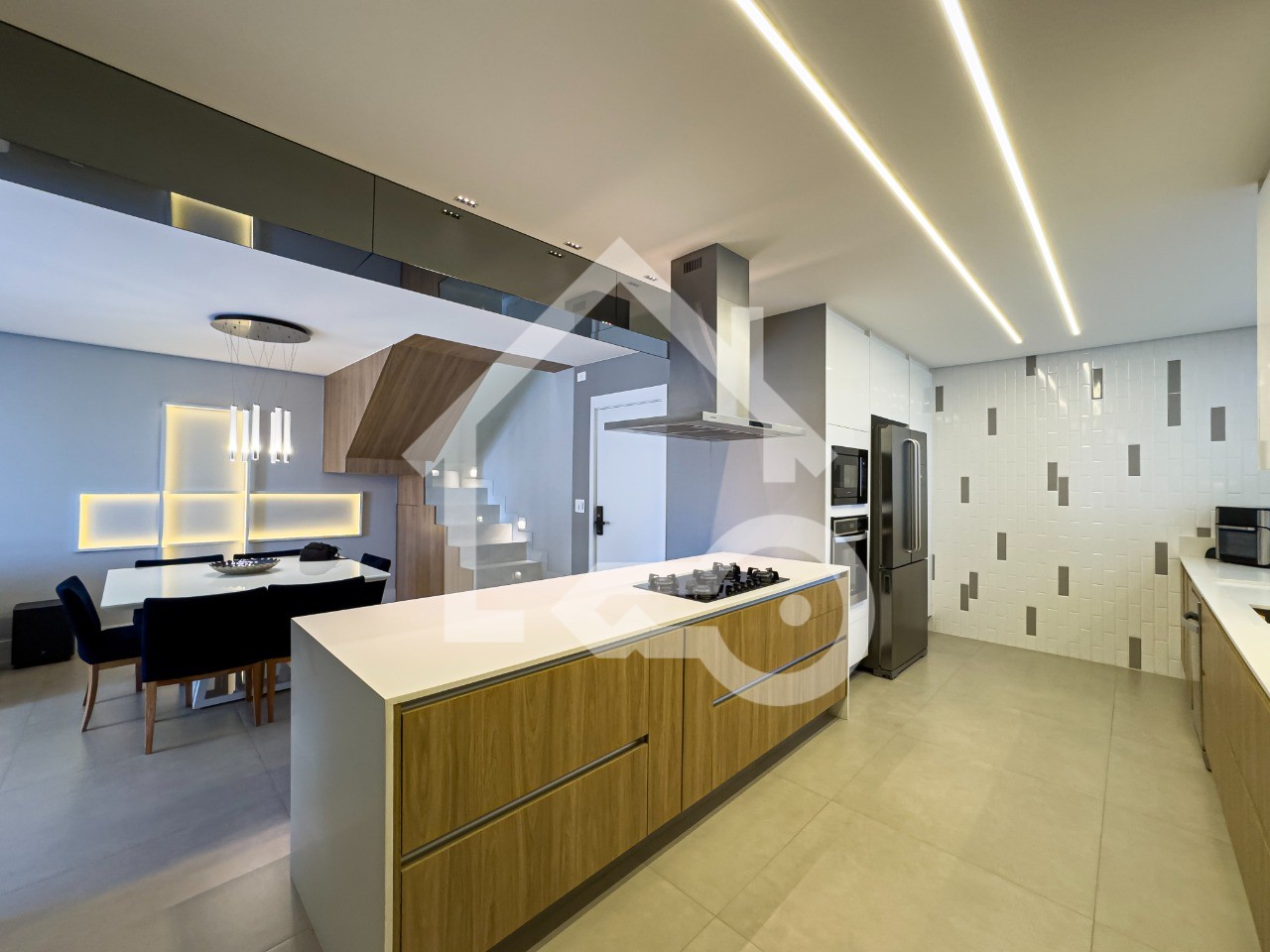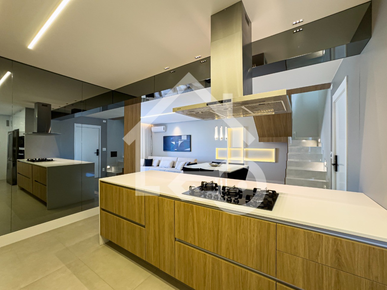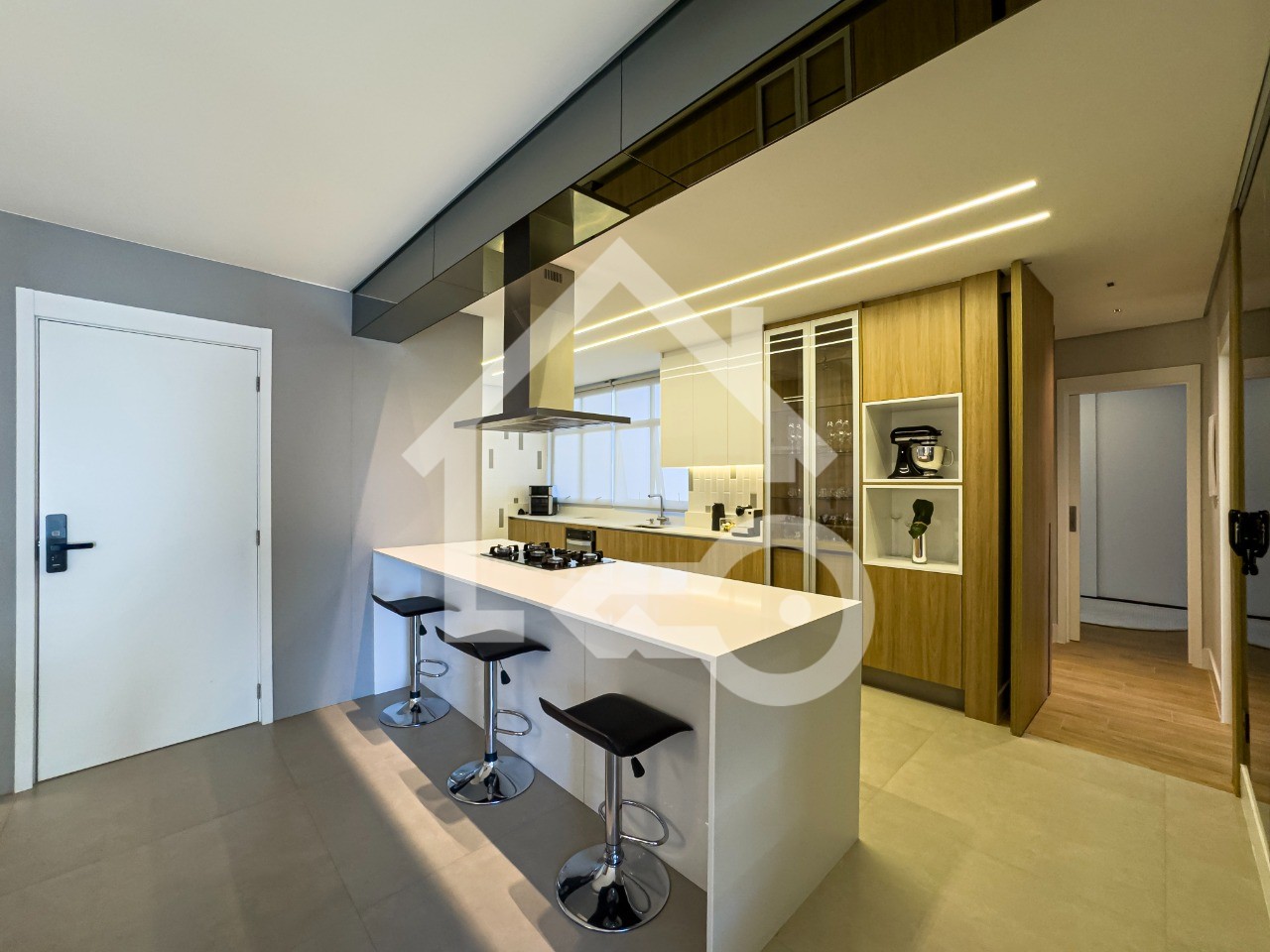Cozinha em conceito aberto com armários planejados, ilha e coifa.