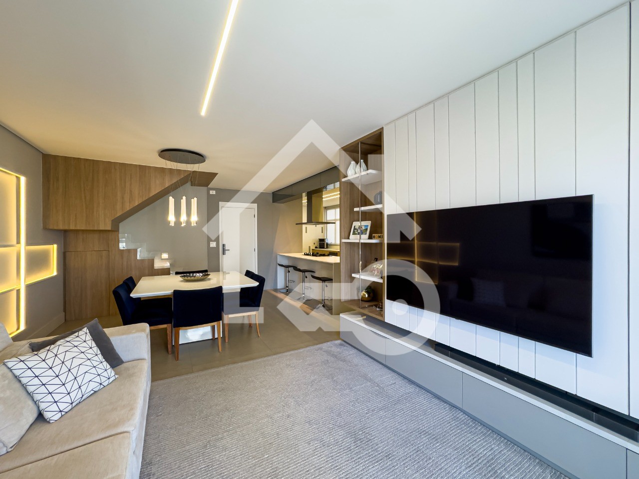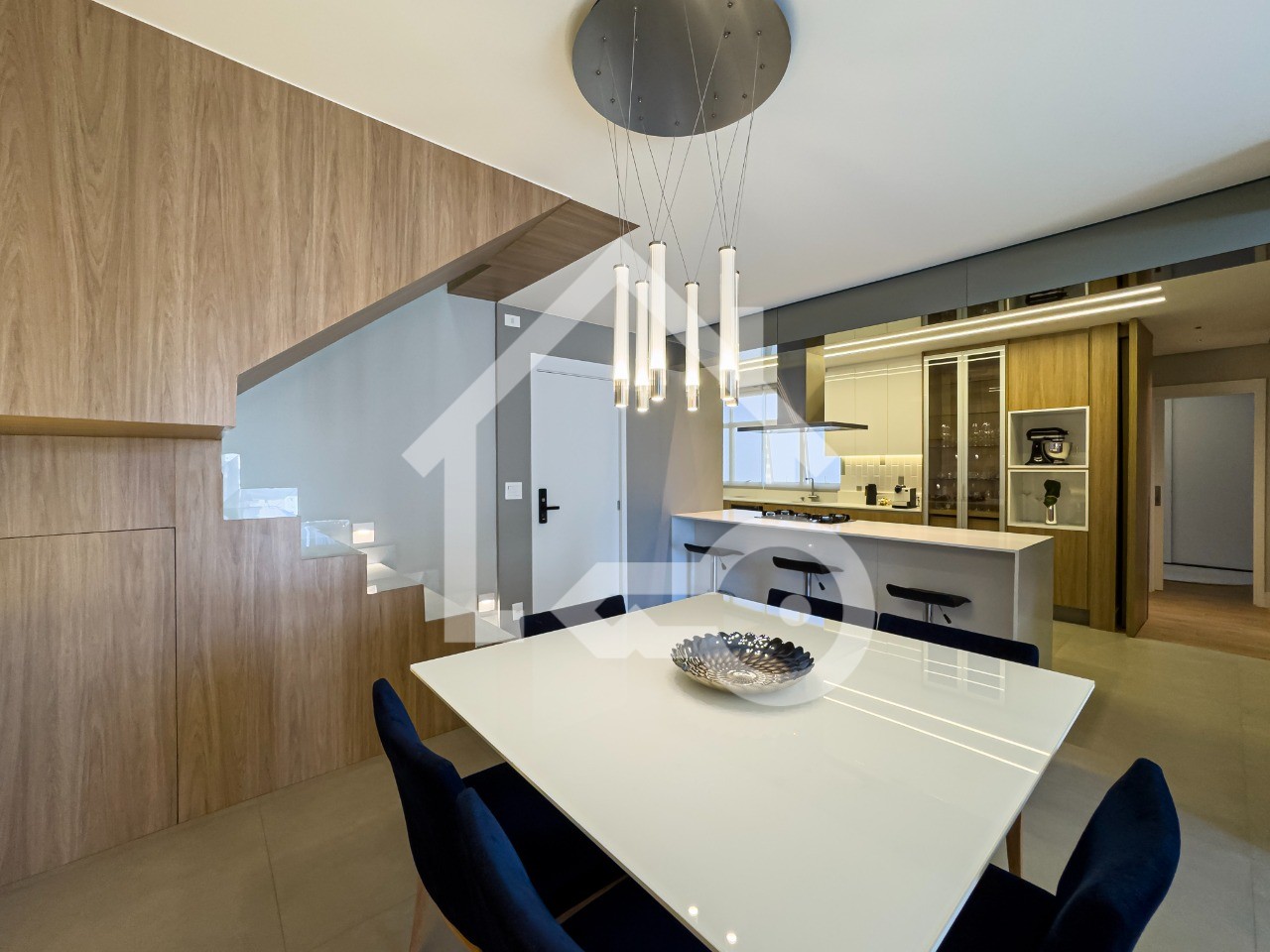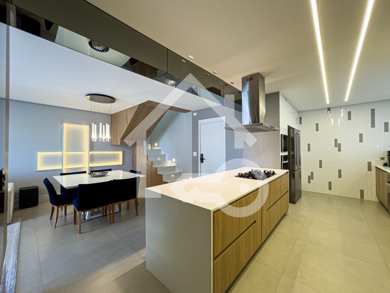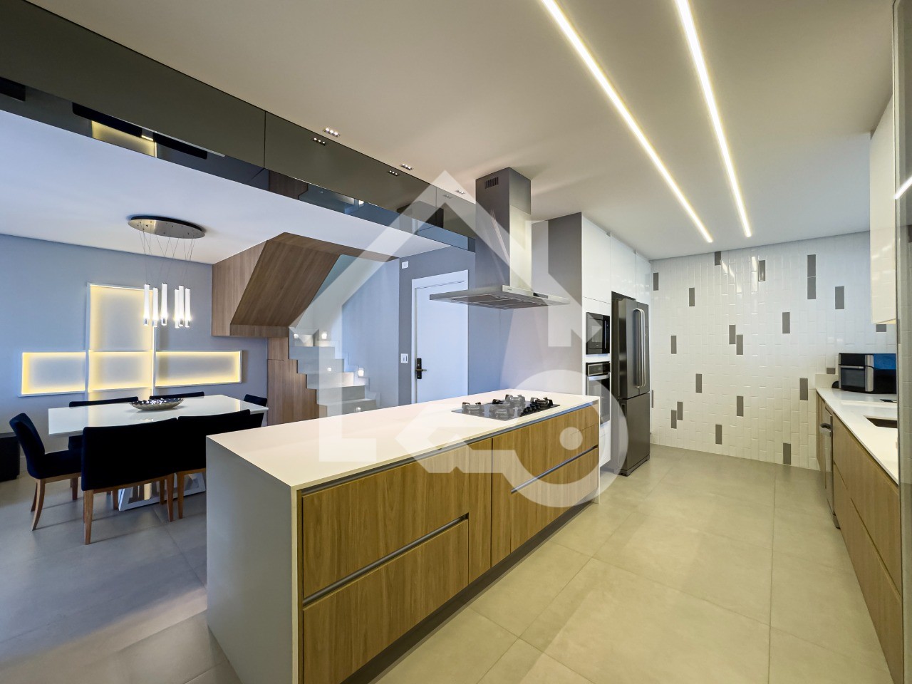 Cozinha em conceito aberto com armários planejados, ilha e coifa.