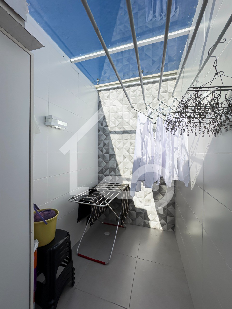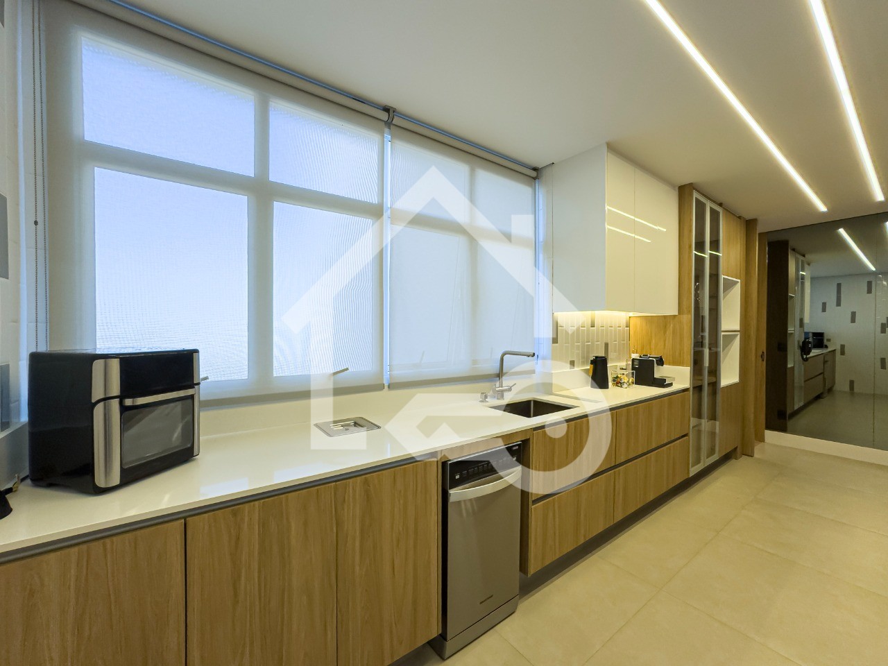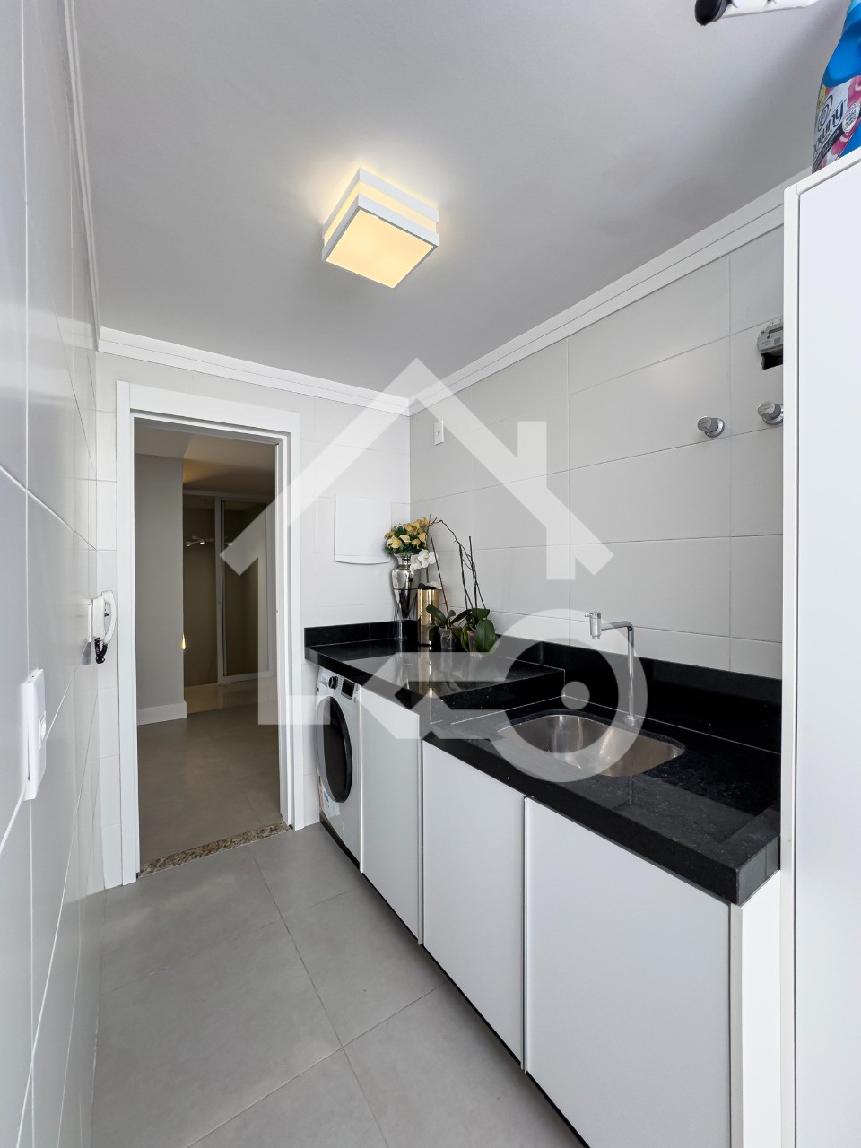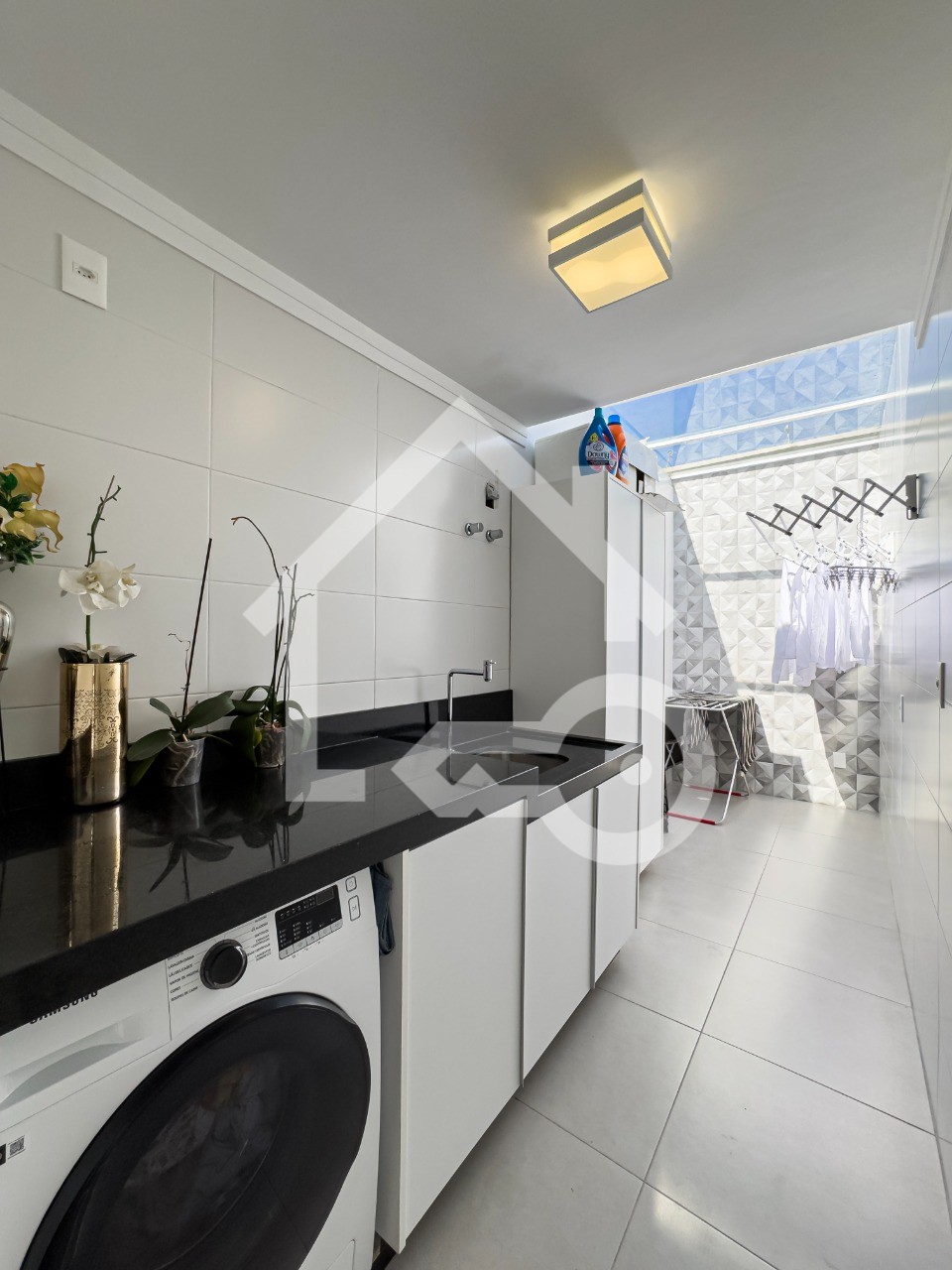 Área de serviço espaçosa e com armários.