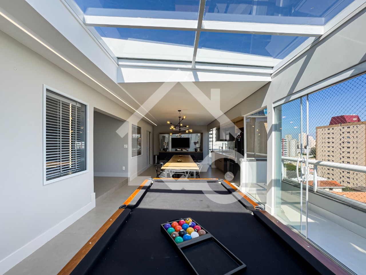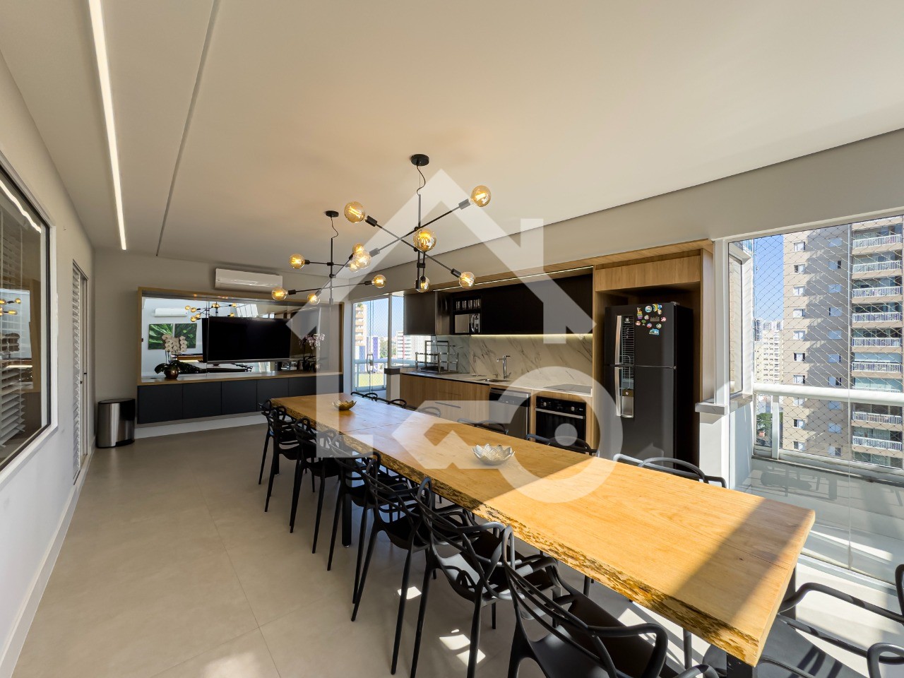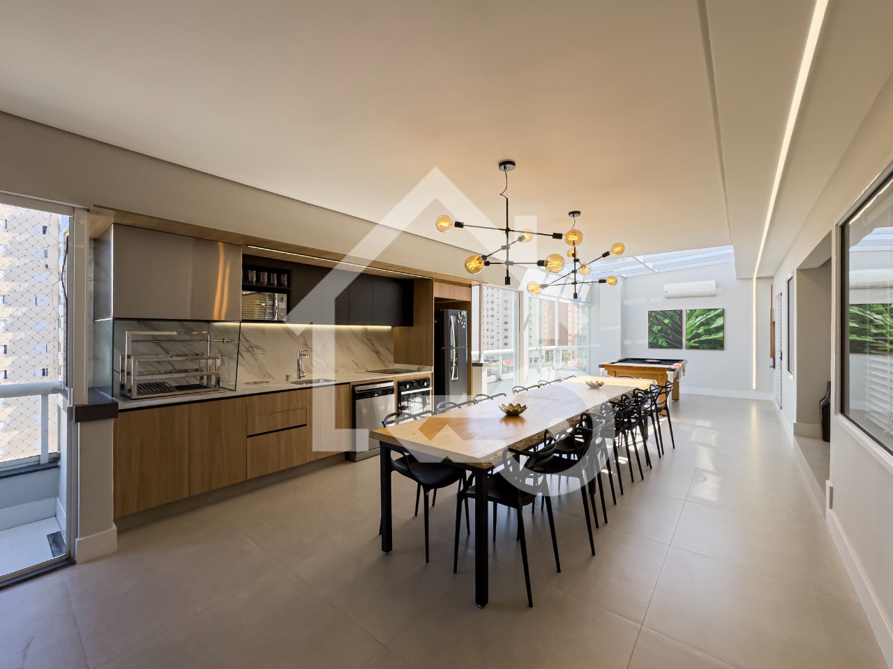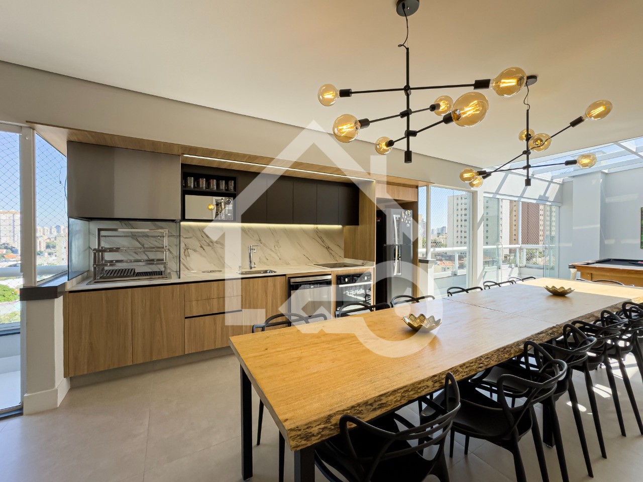 Varanda Gourmet completa com churrasqueira, geladeira, cooktop por indução, mesa de sinuca e ar condicionado.