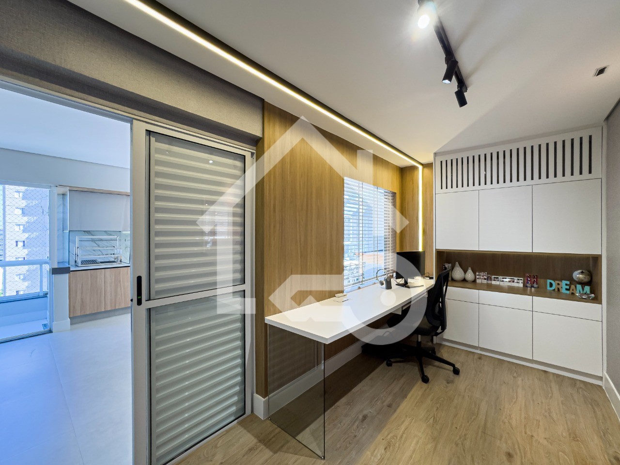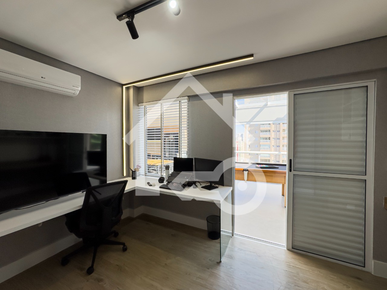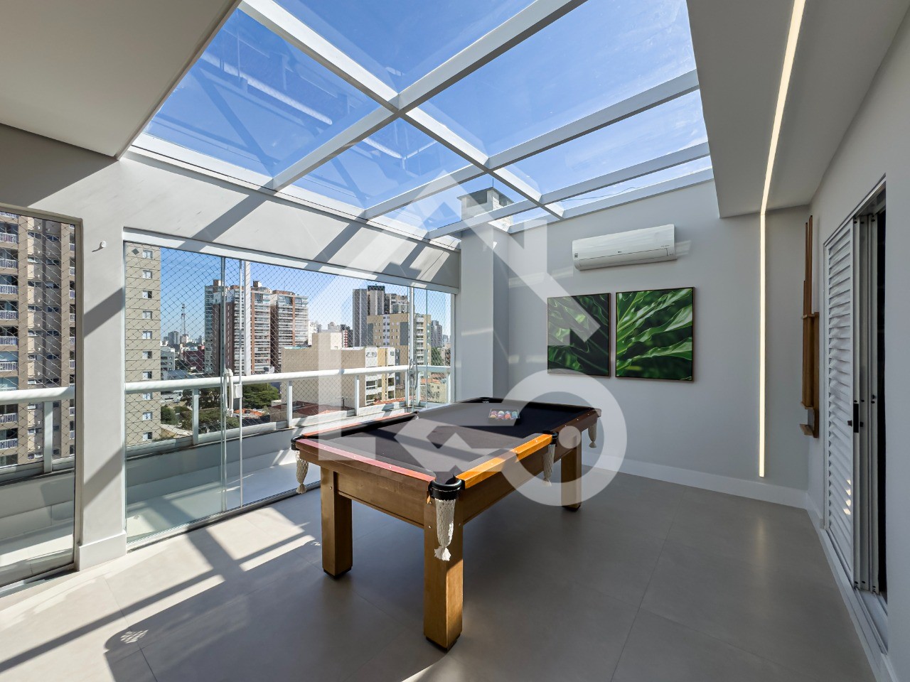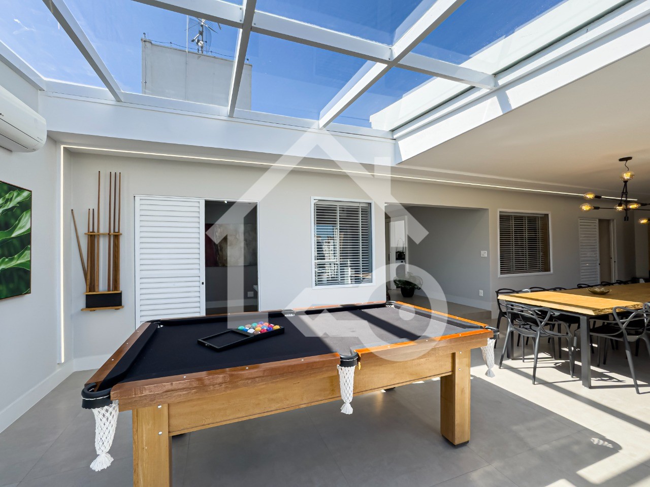 Varanda Gourmet completa com churrasqueira, geladeira, cooktop por indução, mesa de sinuca e ar condicionado.