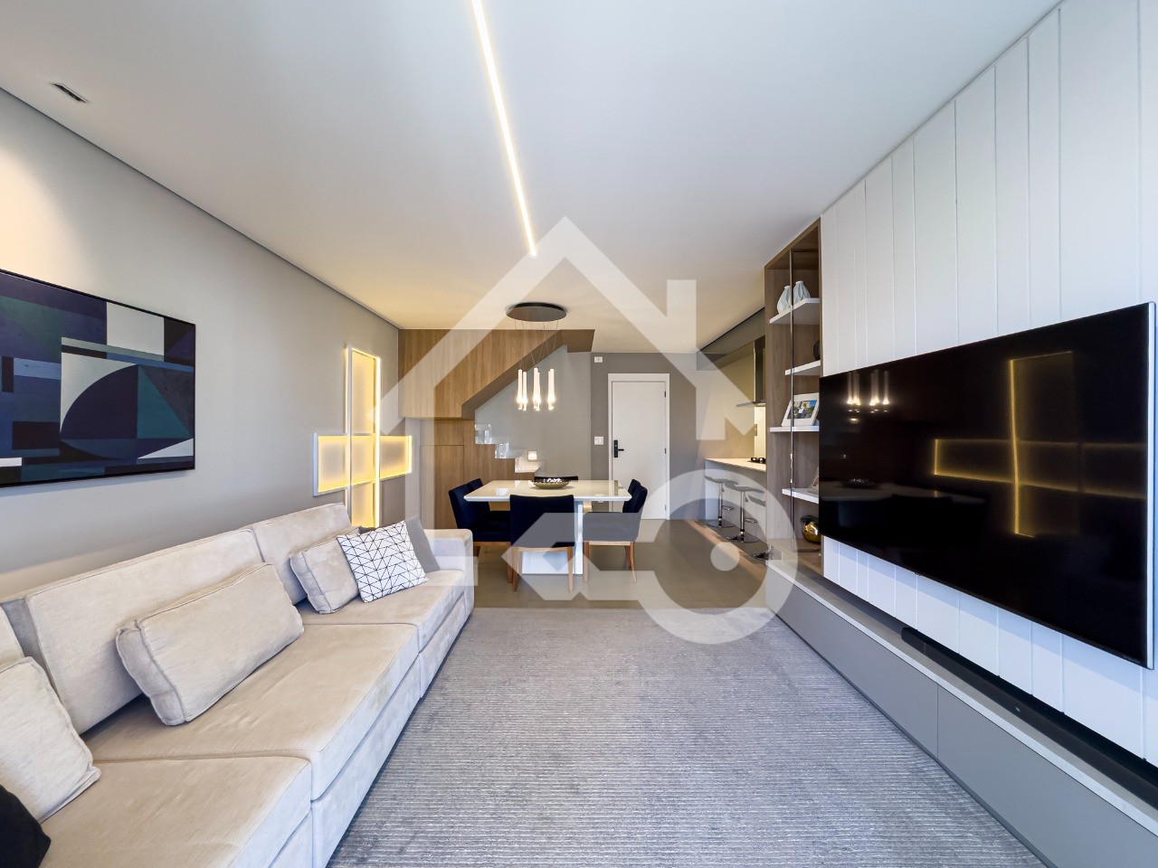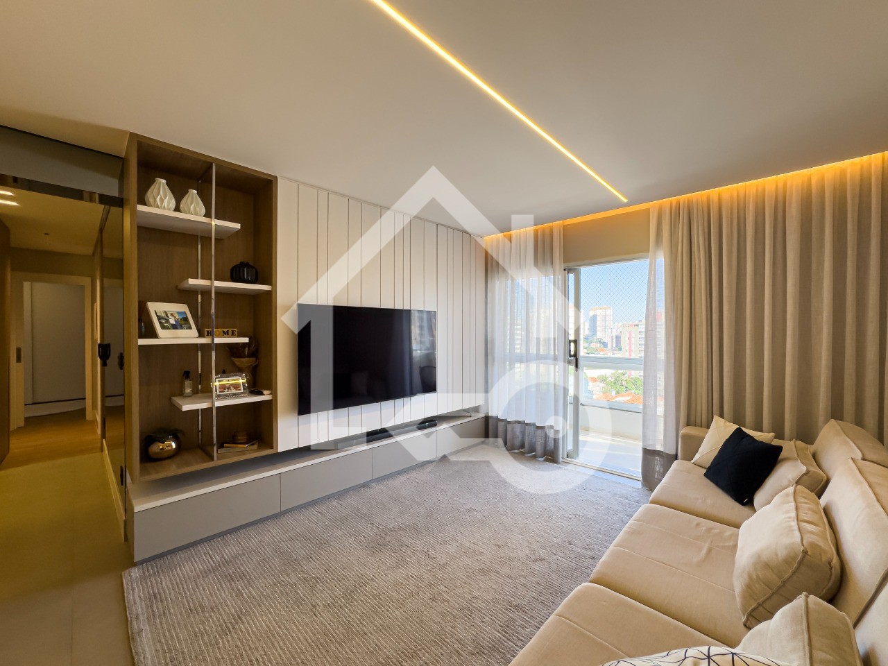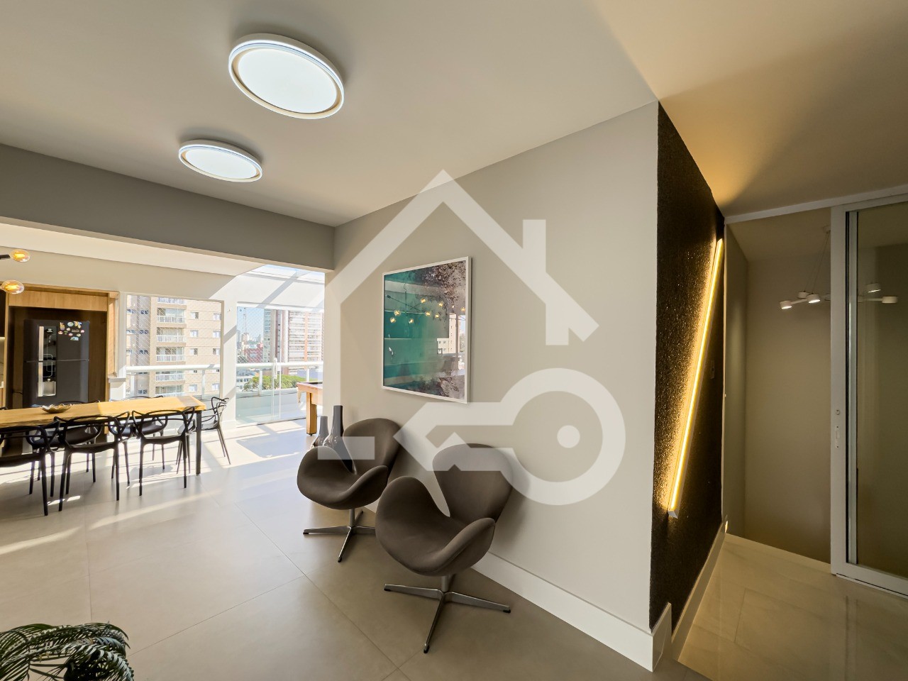 Sala em dois ambientes com varanda envidraçada.