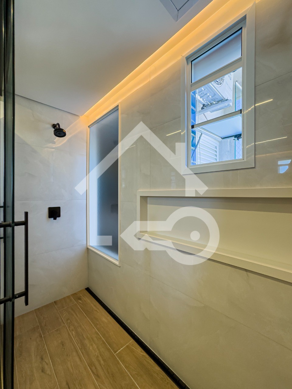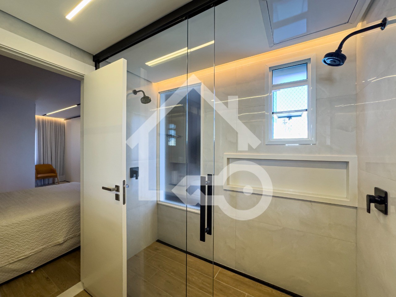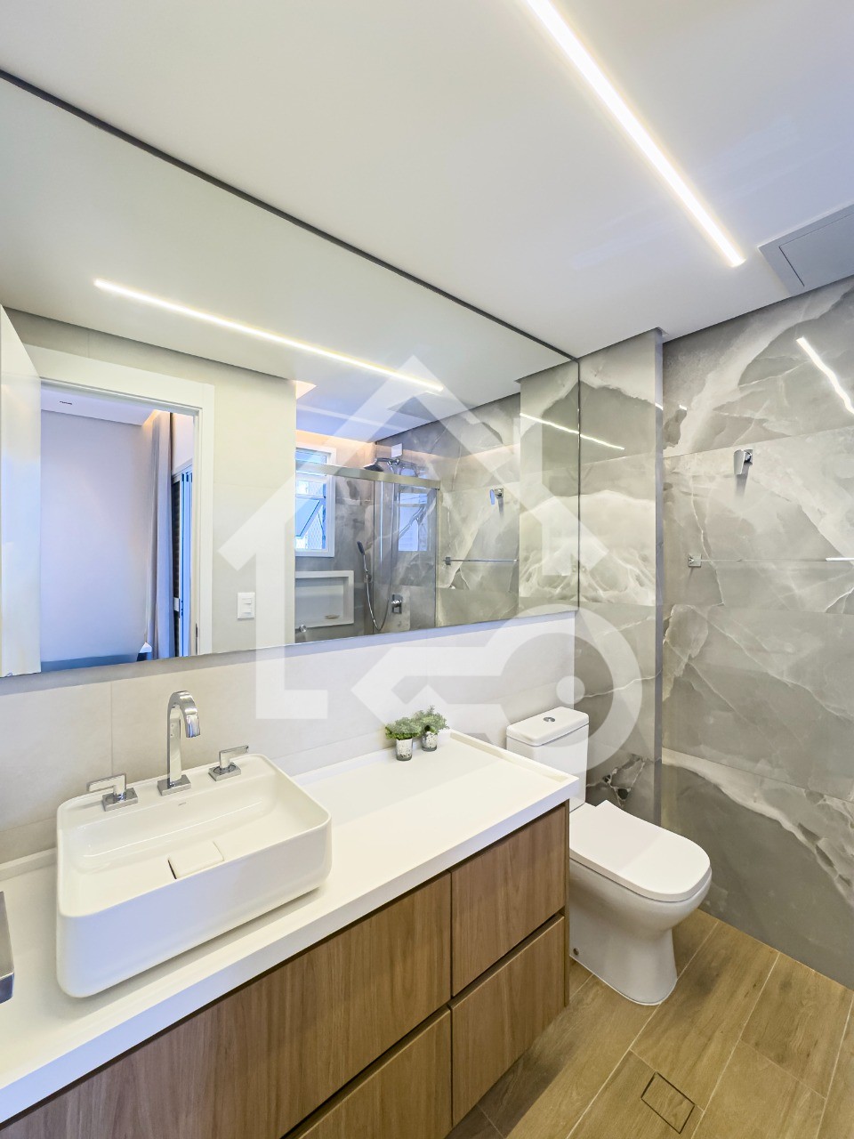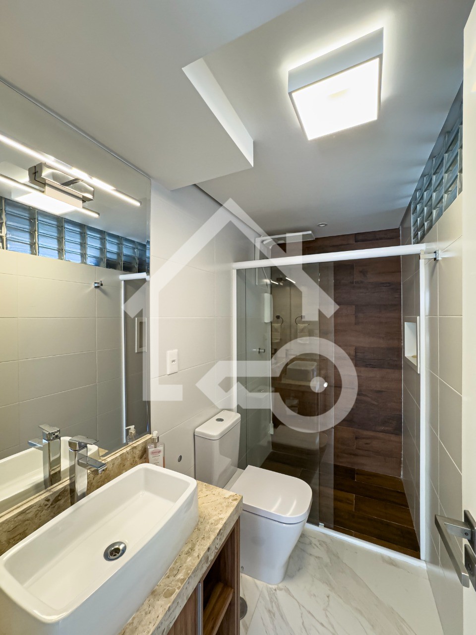 Banheiros com ventilação e iluminação natural e box em vidro.