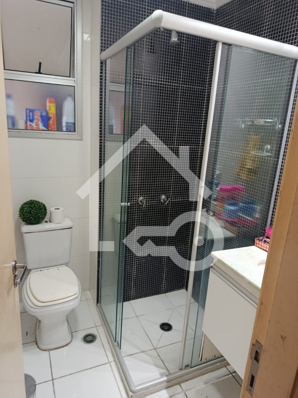 Banheiros com ventilação natural e box em vidro.