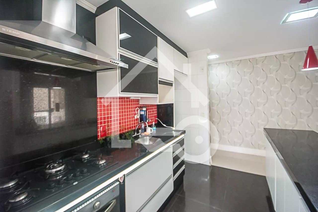 Cozinha com armários planejados, cooktop e forno.
