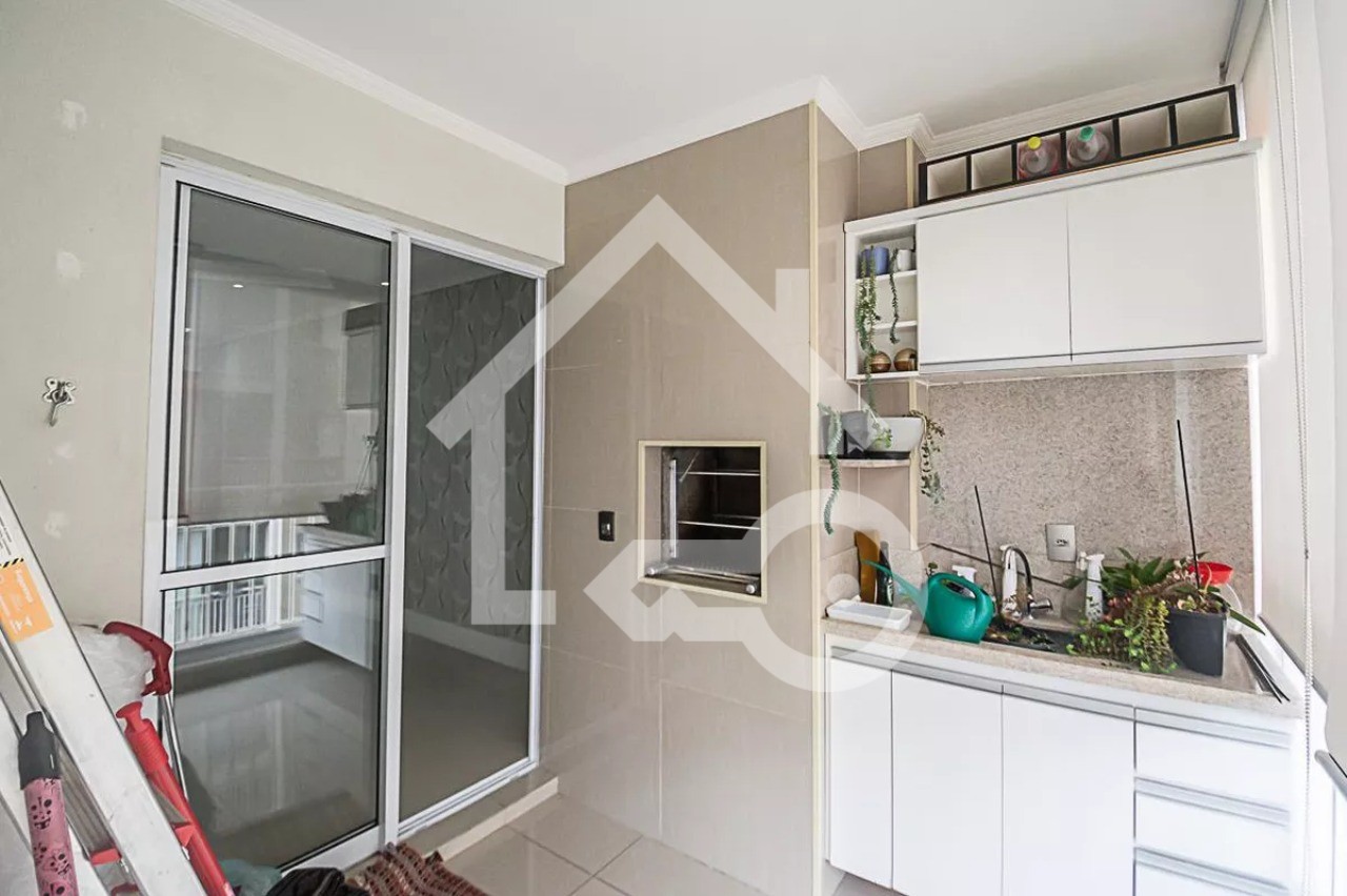 Varanda gourmet com fechamento em vidro e telas de proteção.