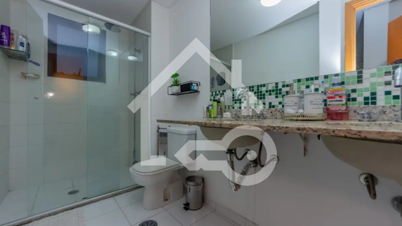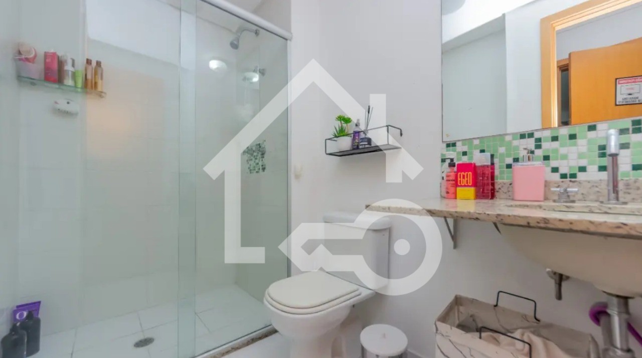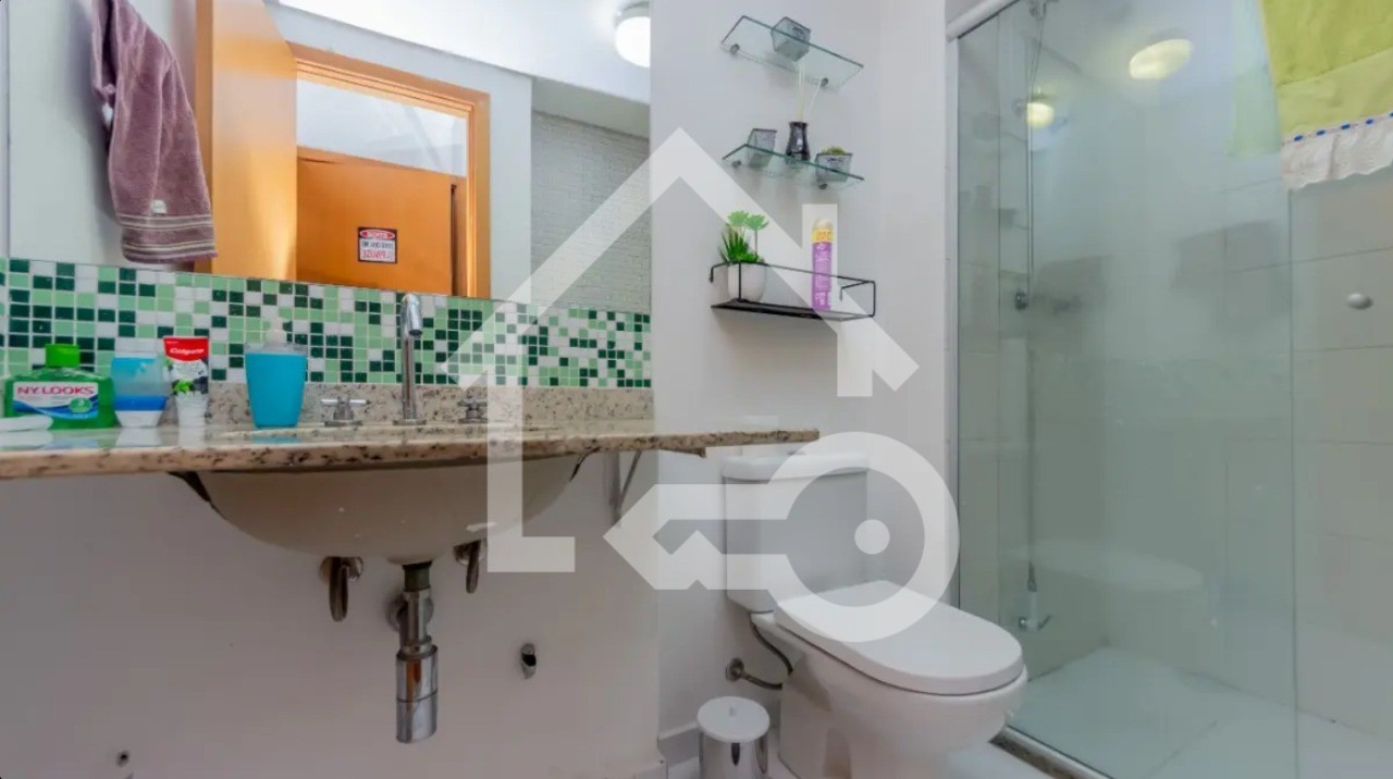 Banheiros com ventilação natural e box em vidro.