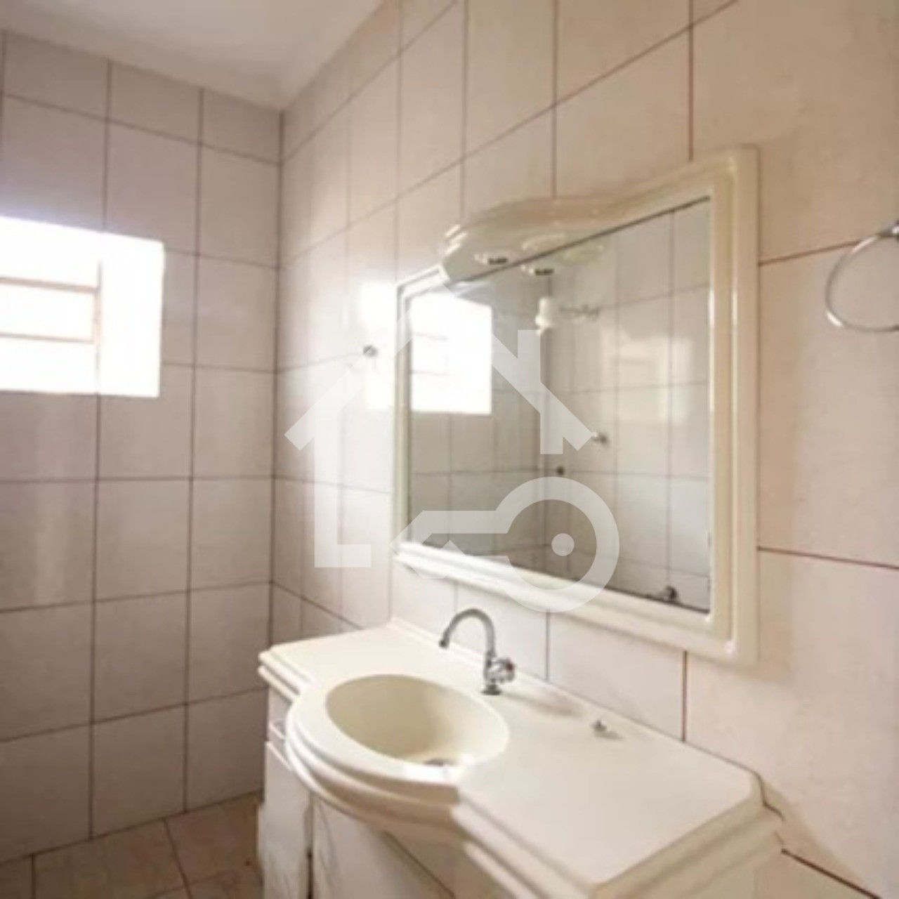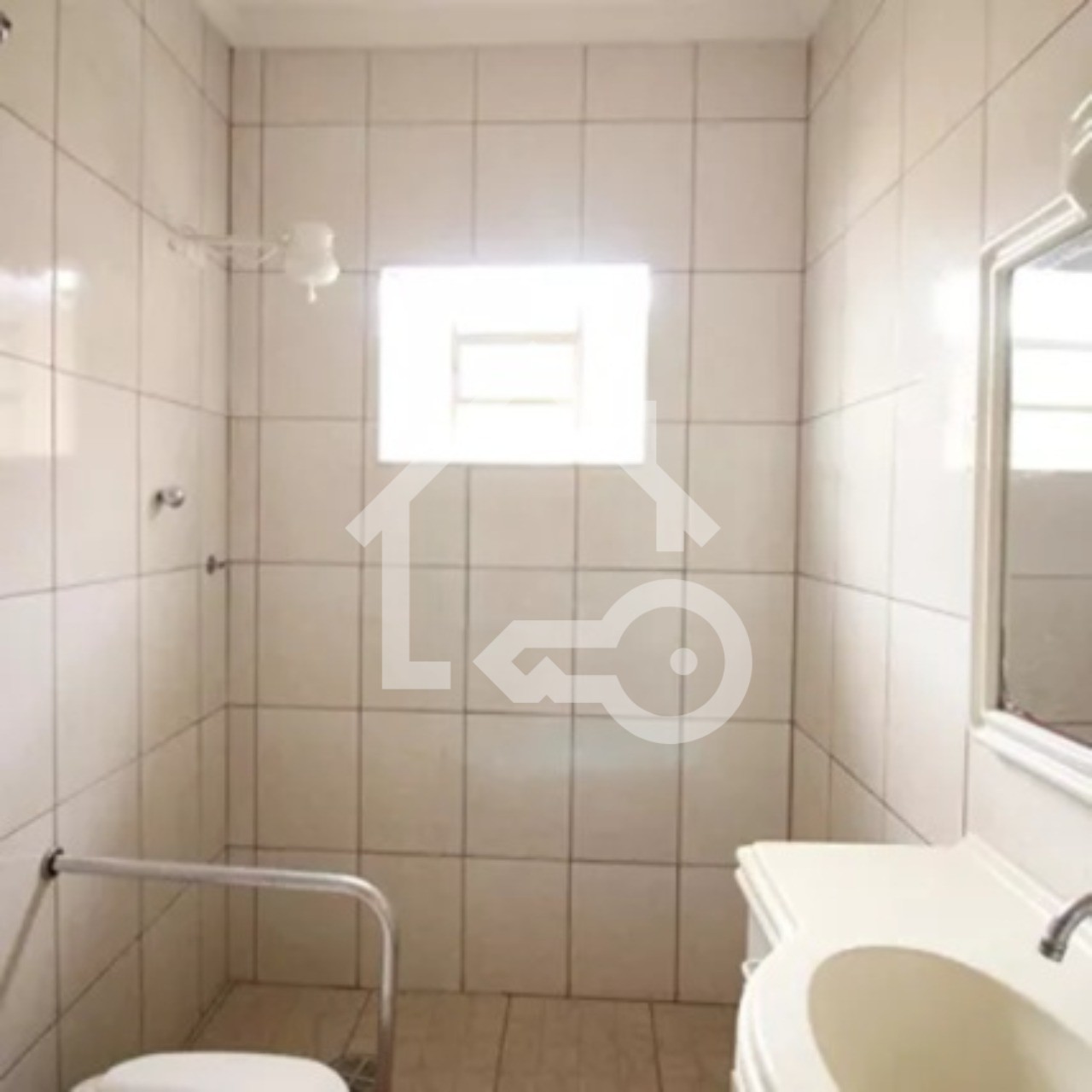 Banheiro com ventilação natural e box em vidro.