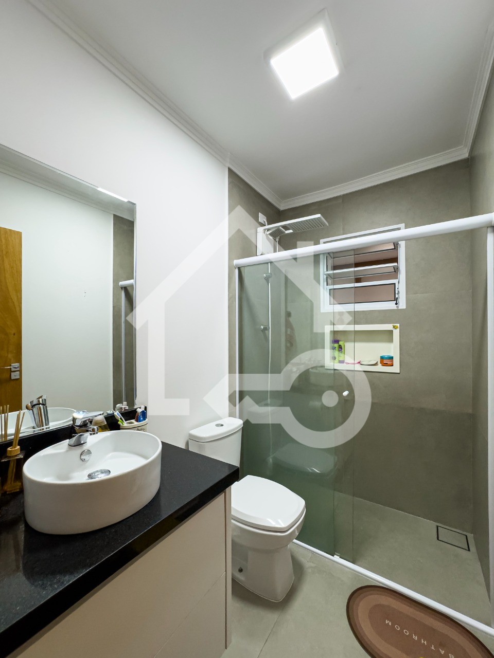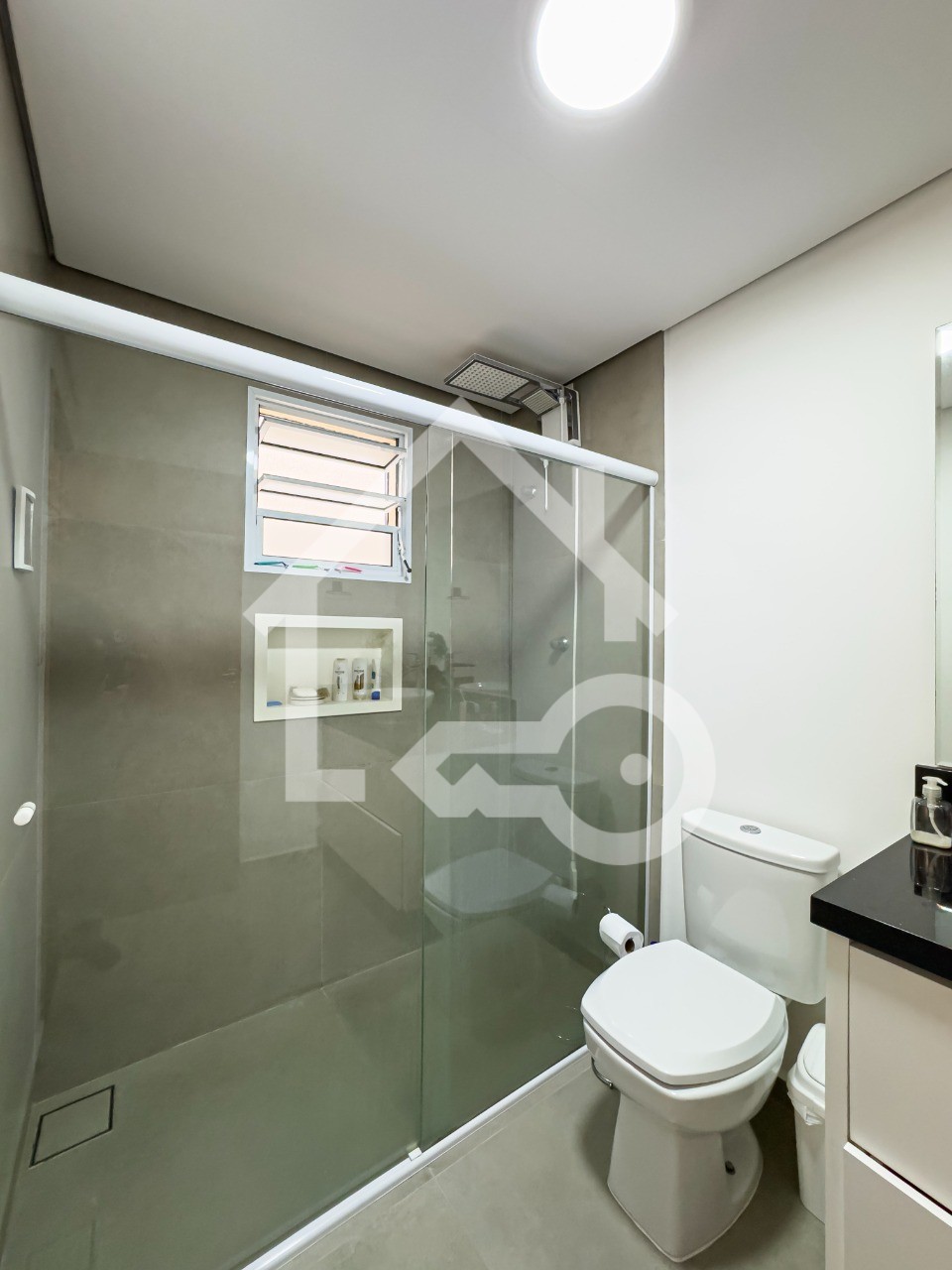 Banheiros com ventilação natural e box em vidro.