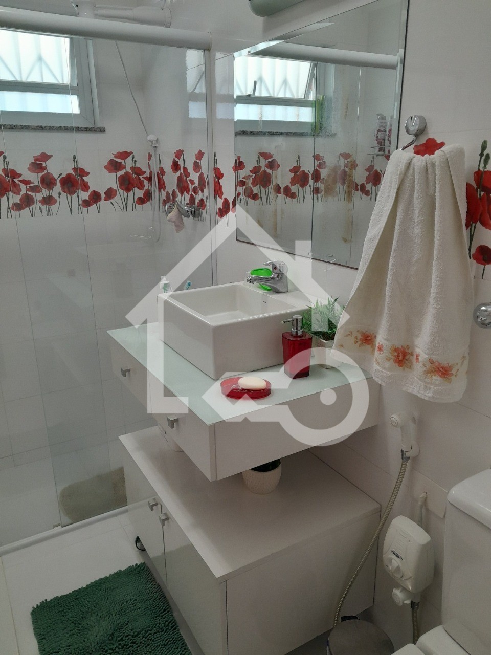 Banheiros com box de vidro, gabinete e ventilação natural;