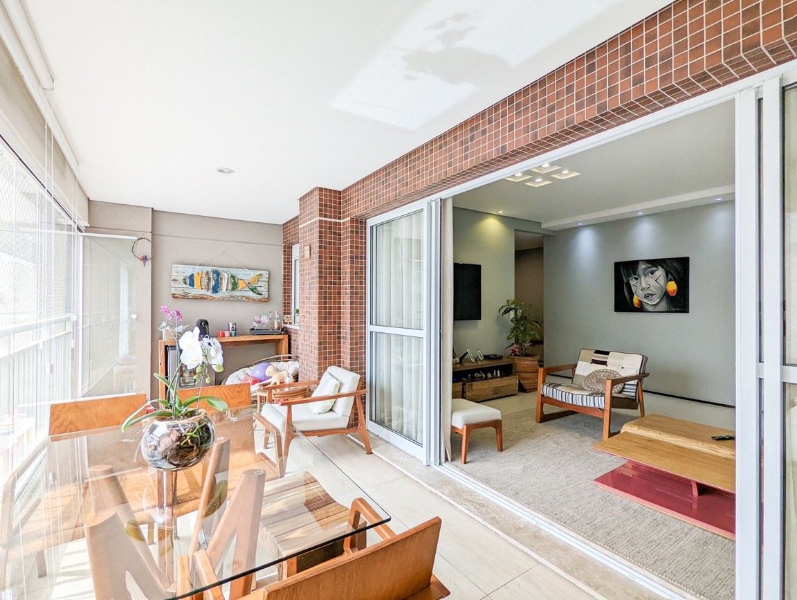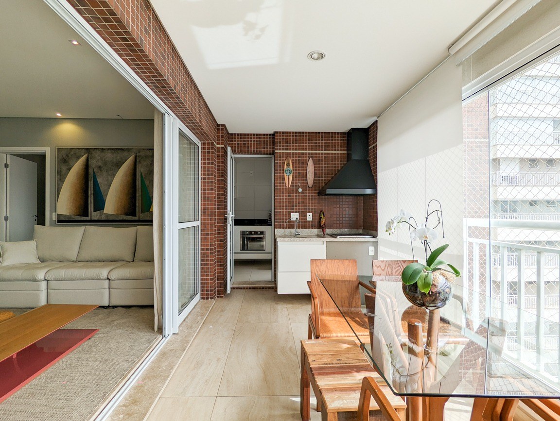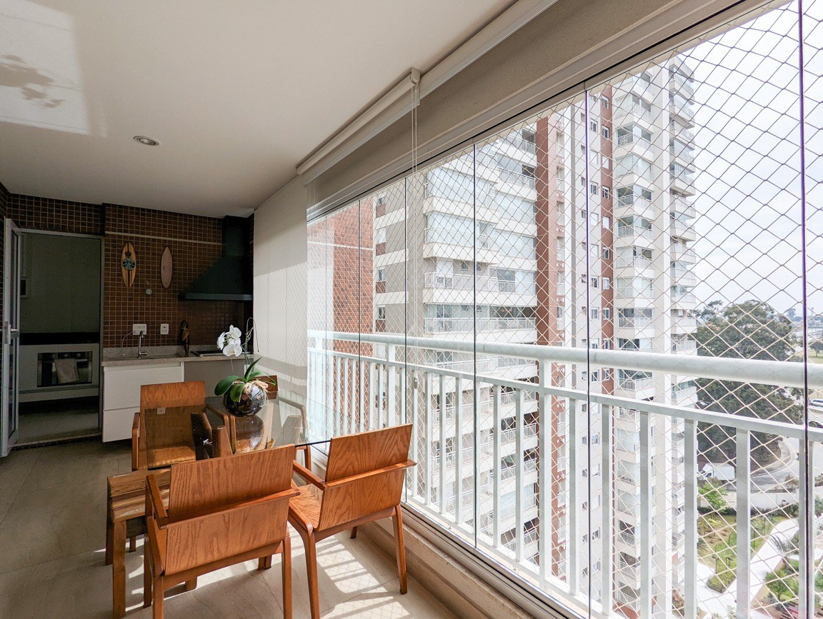 Varanda gourmet com fechamento em vidro e telas de proteção.