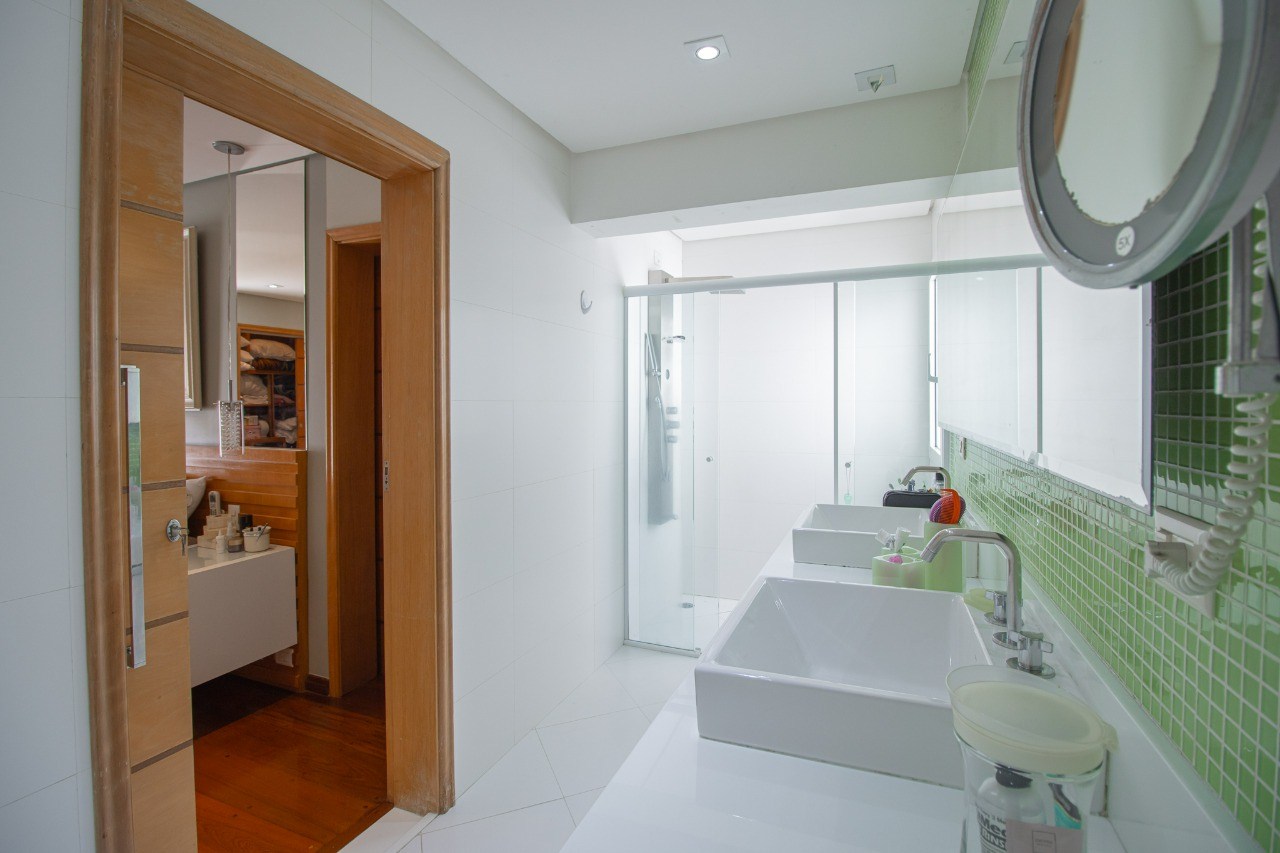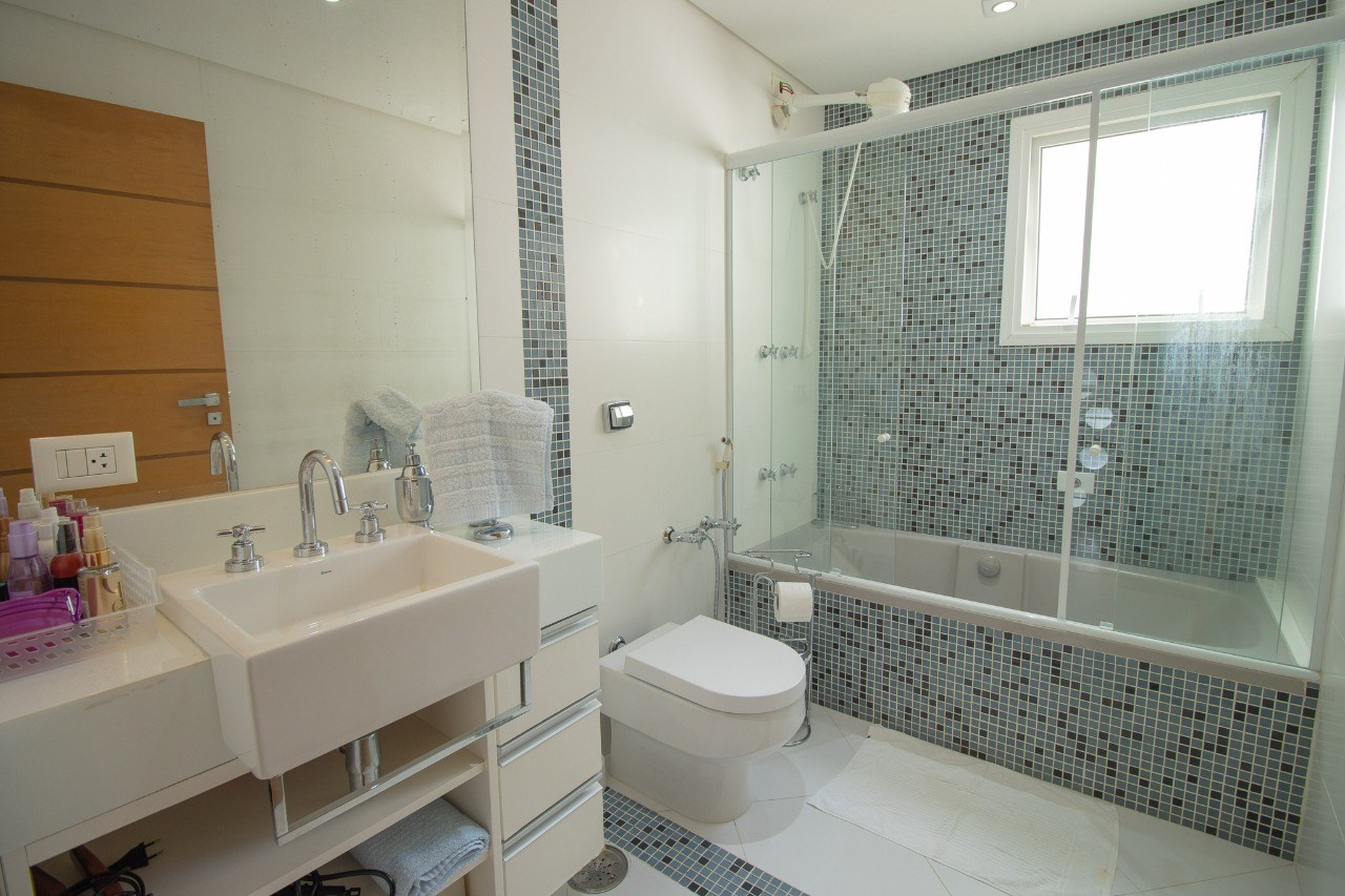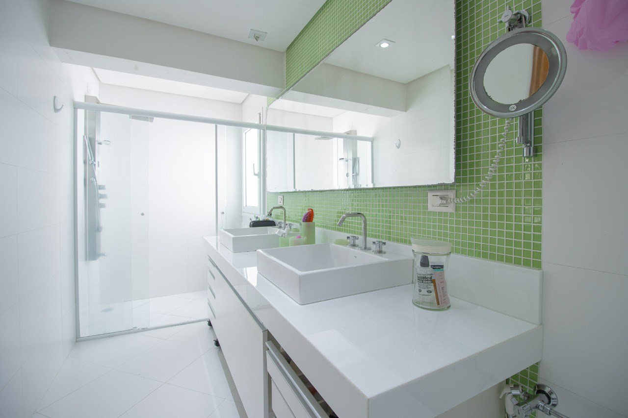 Banheiros espaçosos, com gabinetes planejados e box em vidro.