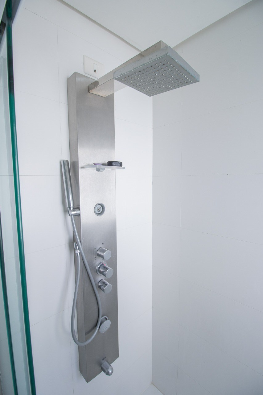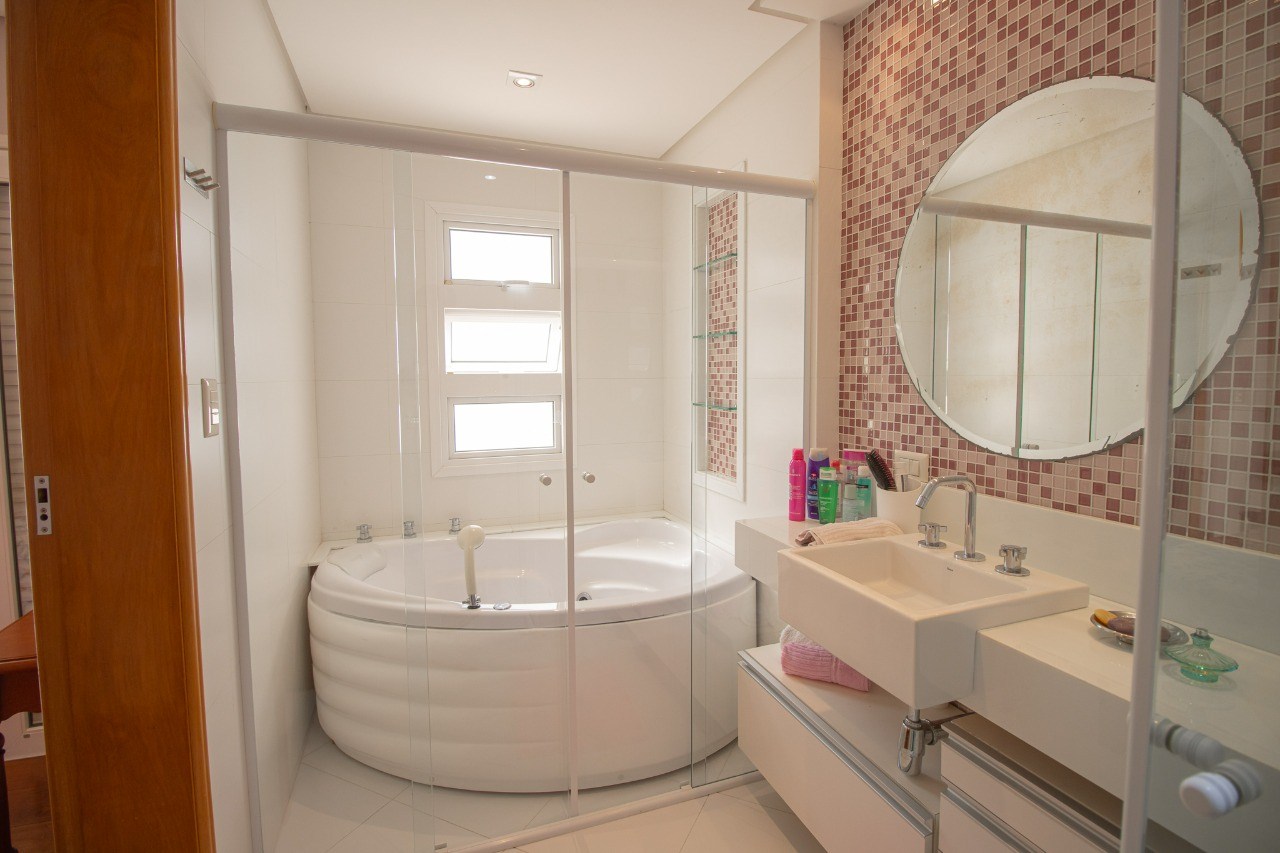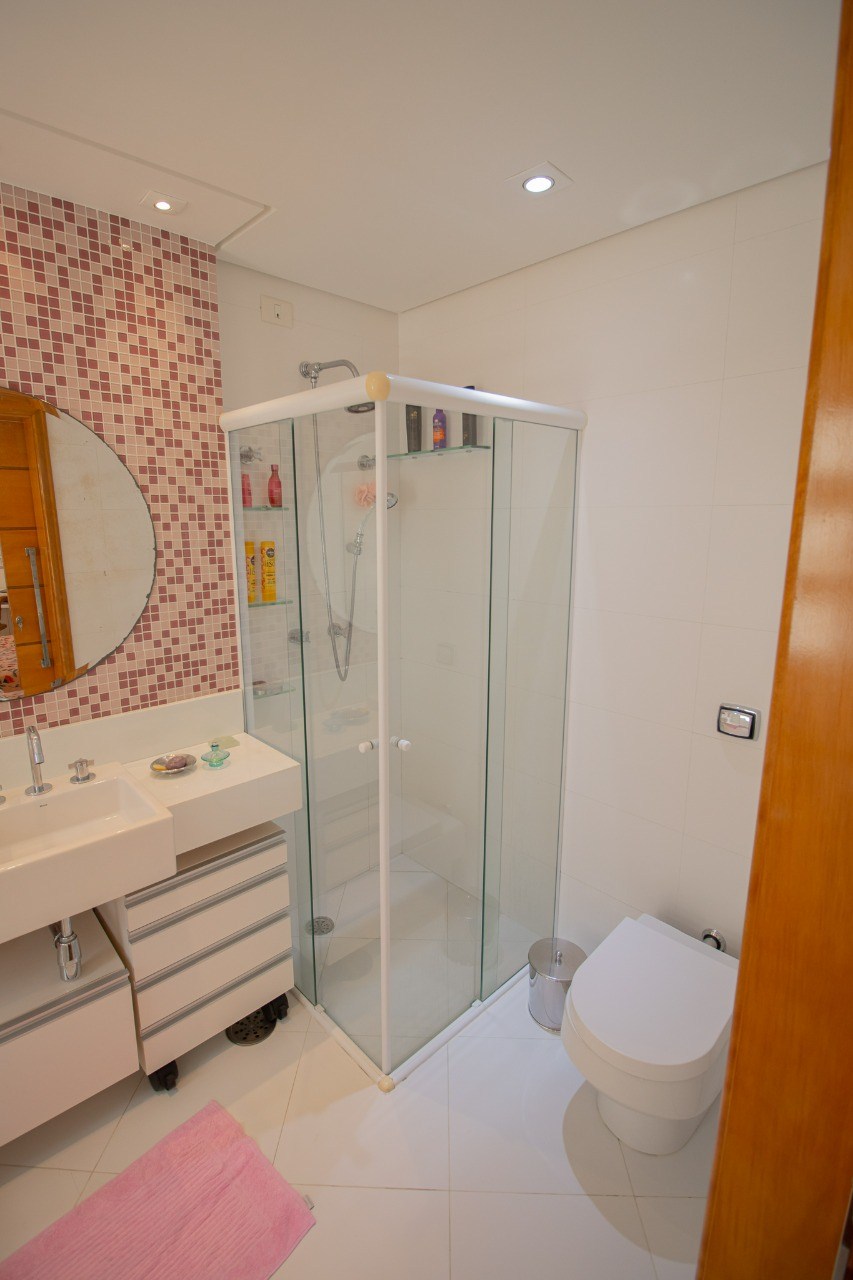 Banheiros espaçosos, com gabinetes planejados e box em vidro.