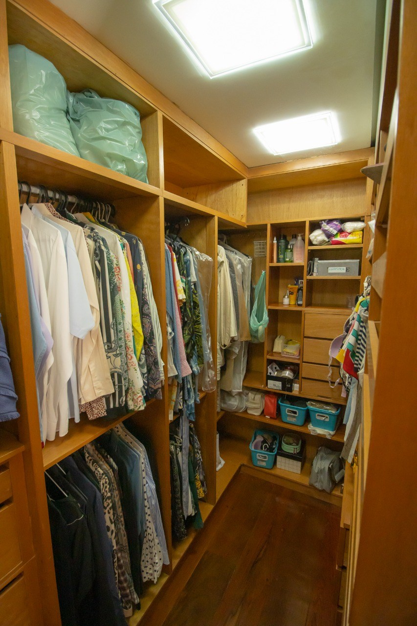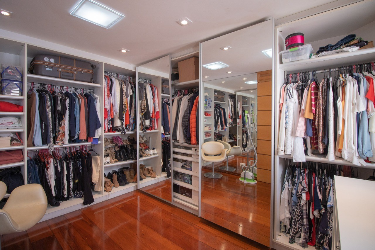 Suíte principal com closet amplo e banheira de hidromassagem.