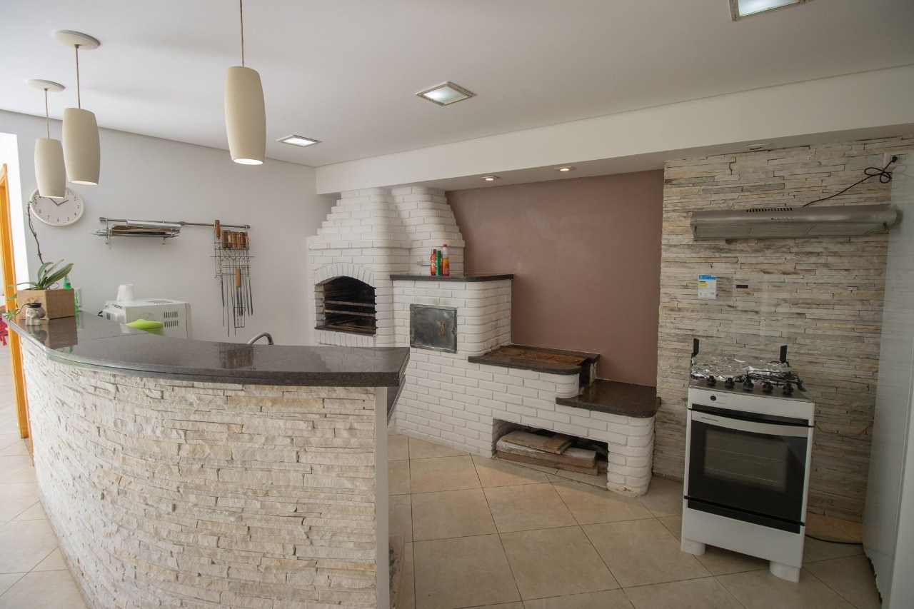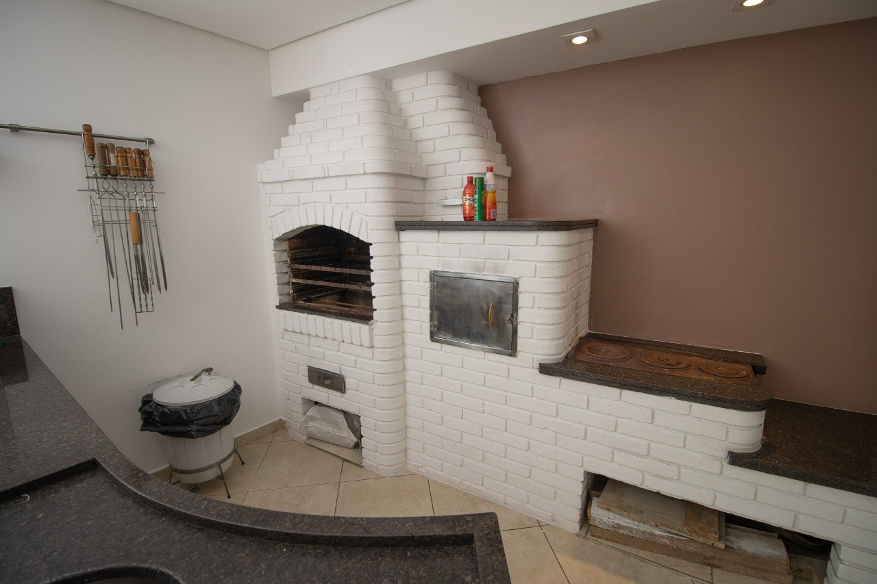 Área gourmet completa com churrasqueira, forno e fogão a lenha.