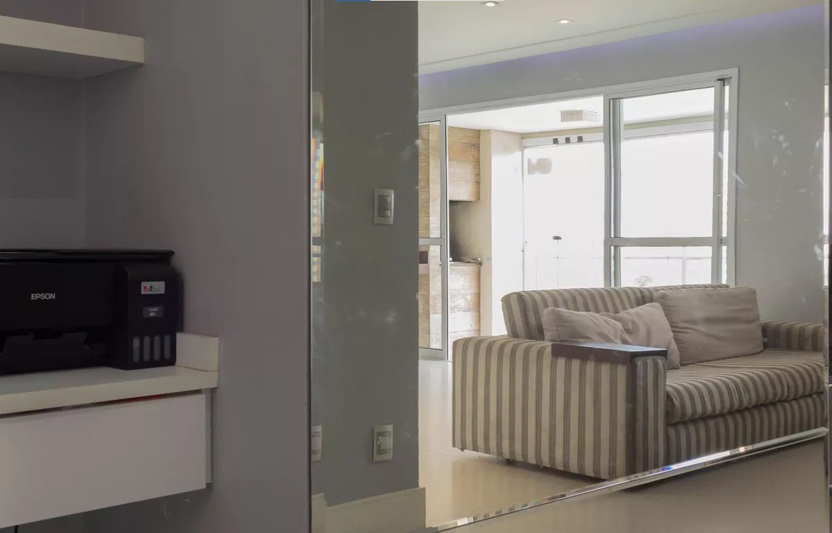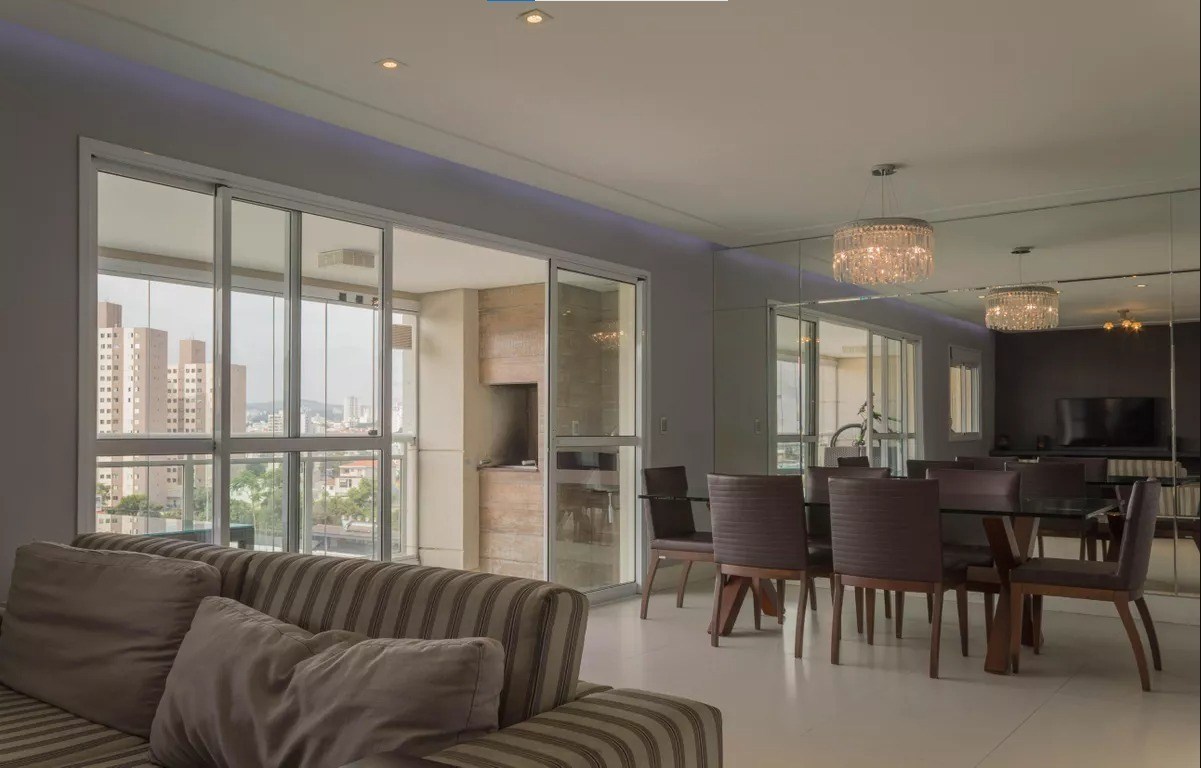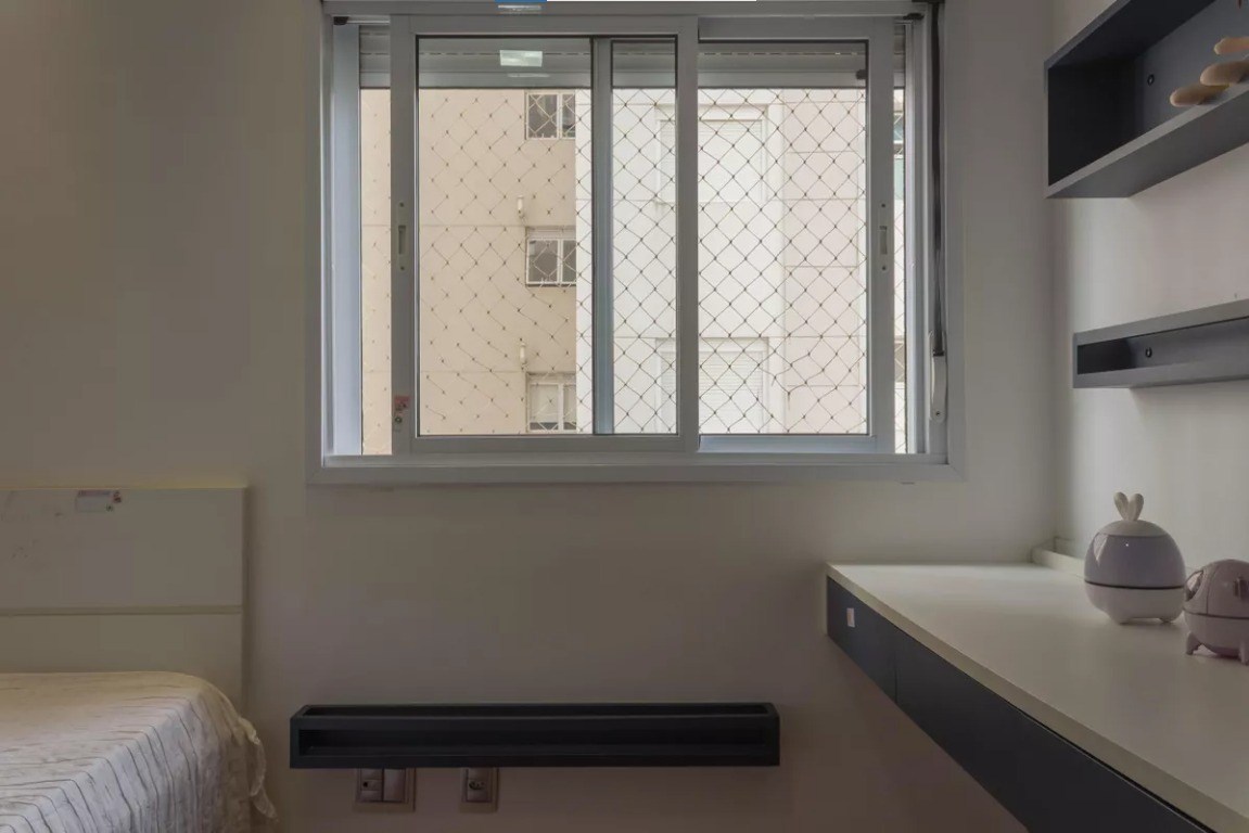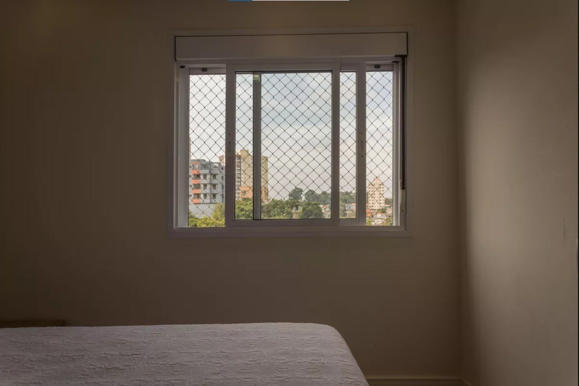 Varanda com fechamente em vidro e telas de proteção.