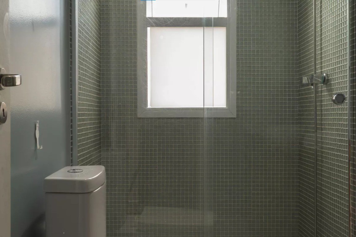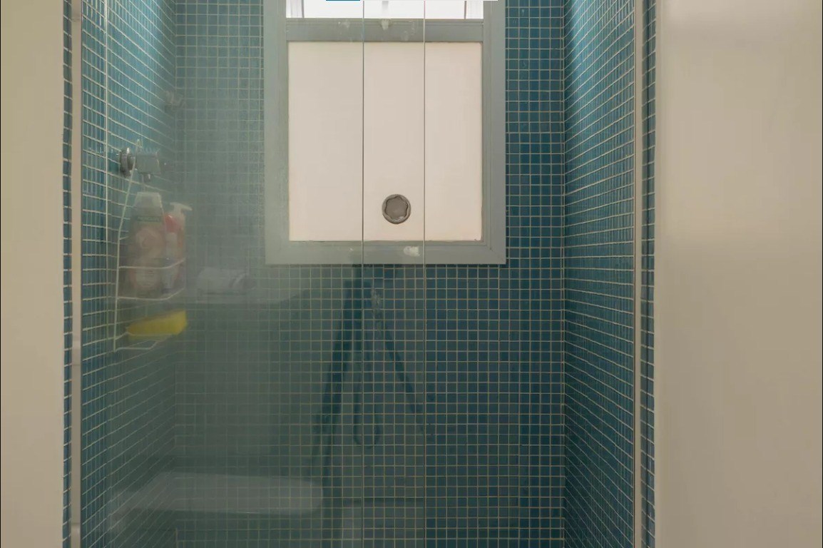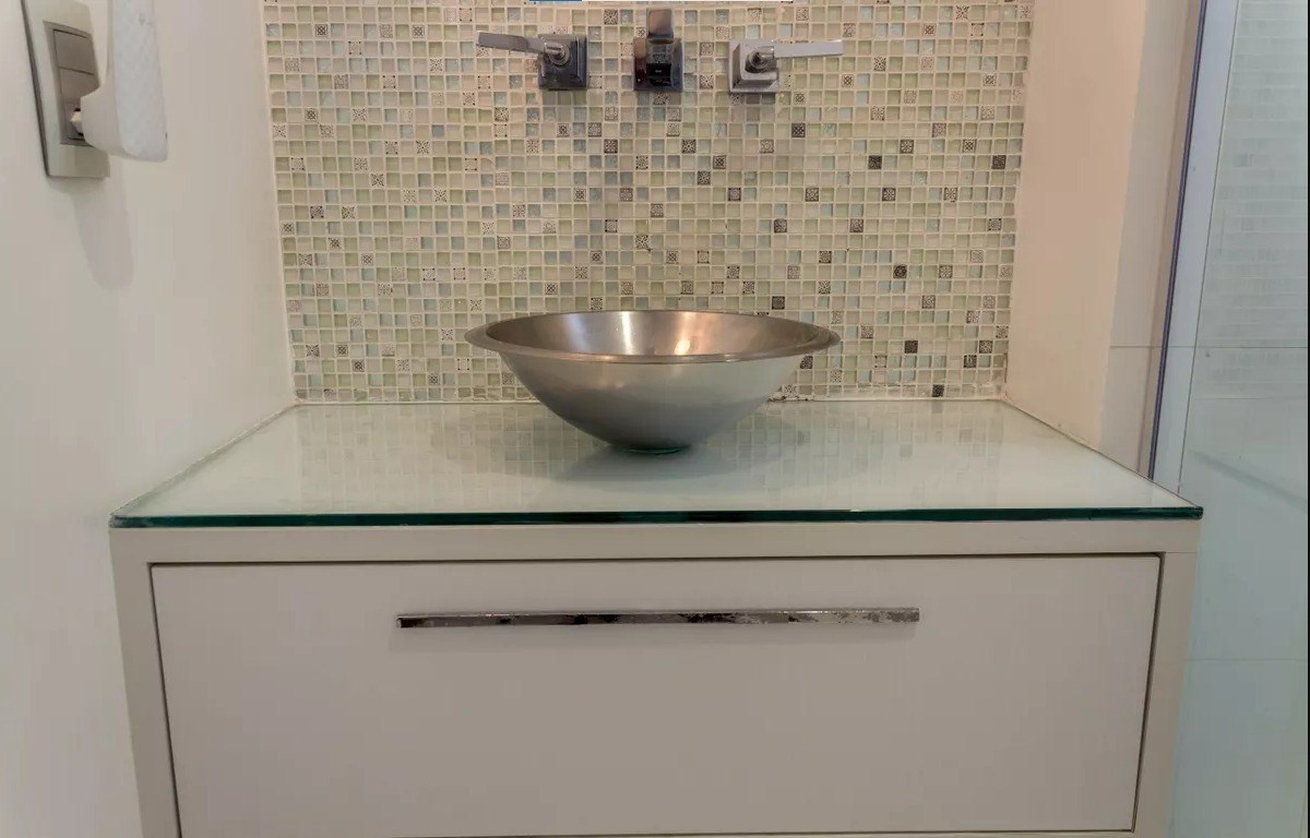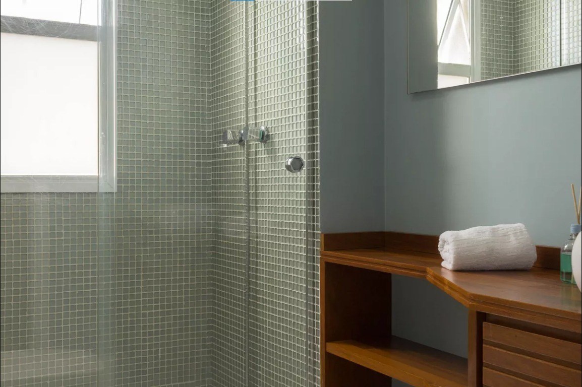Banheiro com box em vidro.