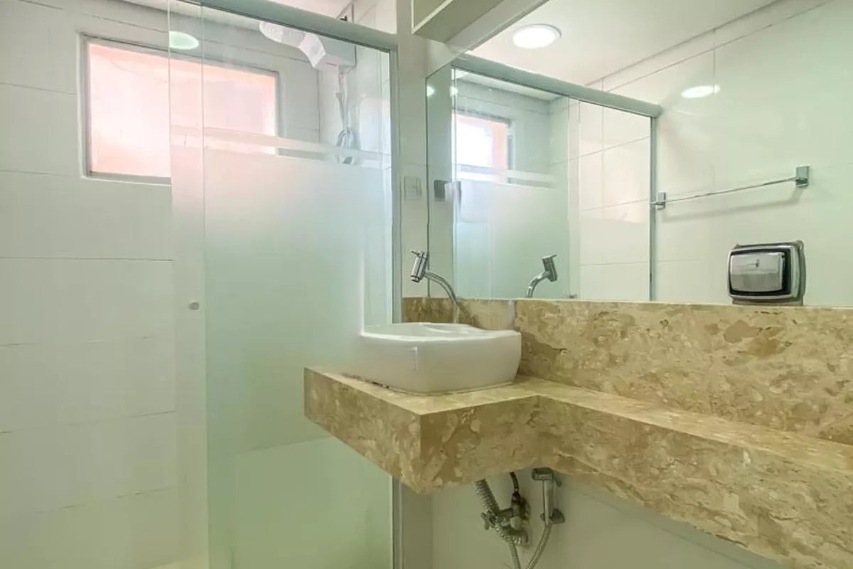 Banheiro com box em vidro e ventilação natural.