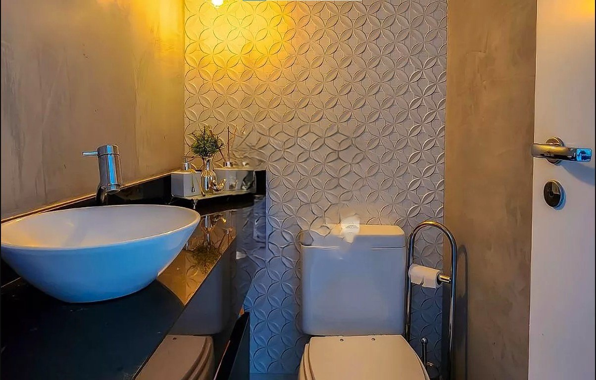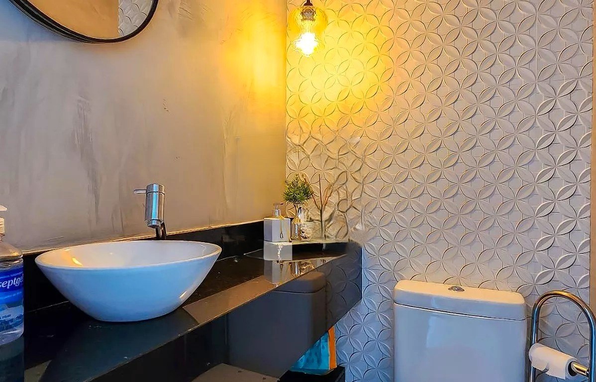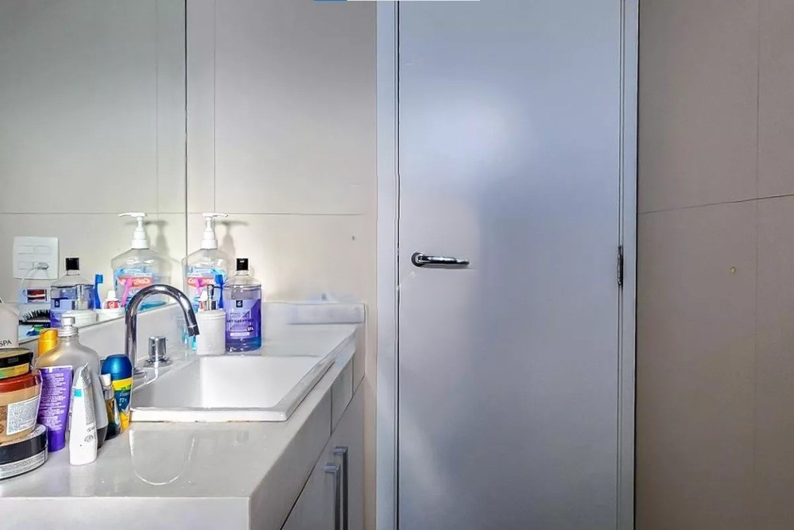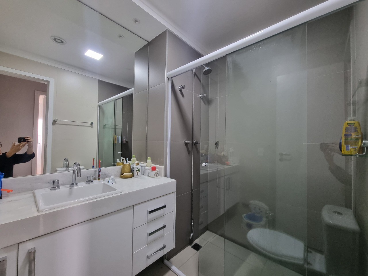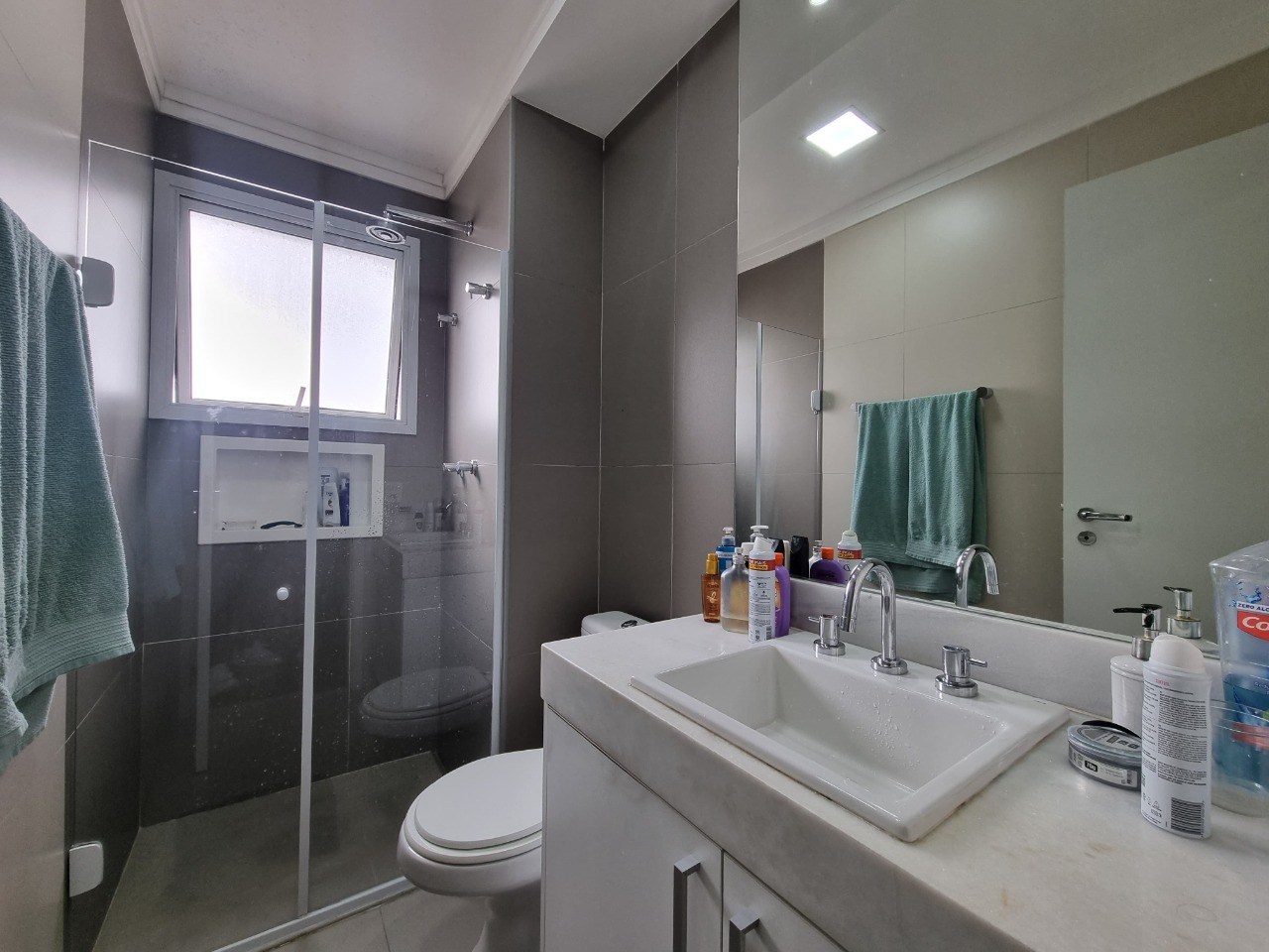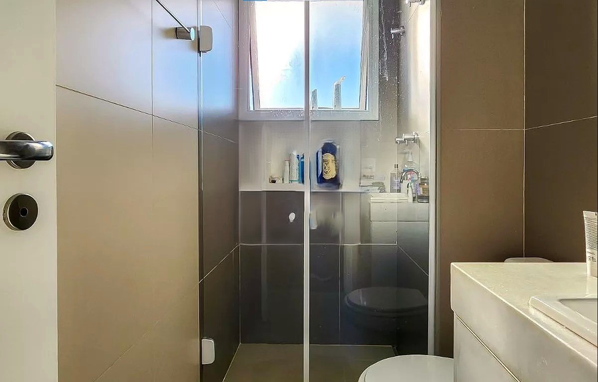 Banheiro com box em vidro.