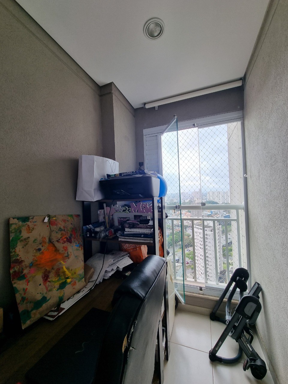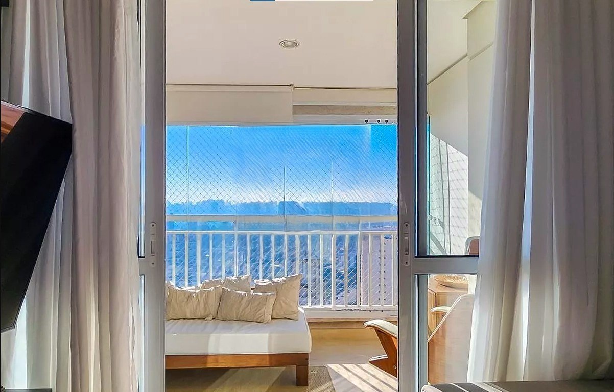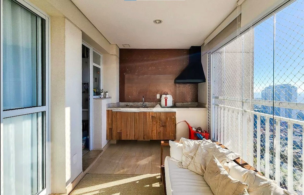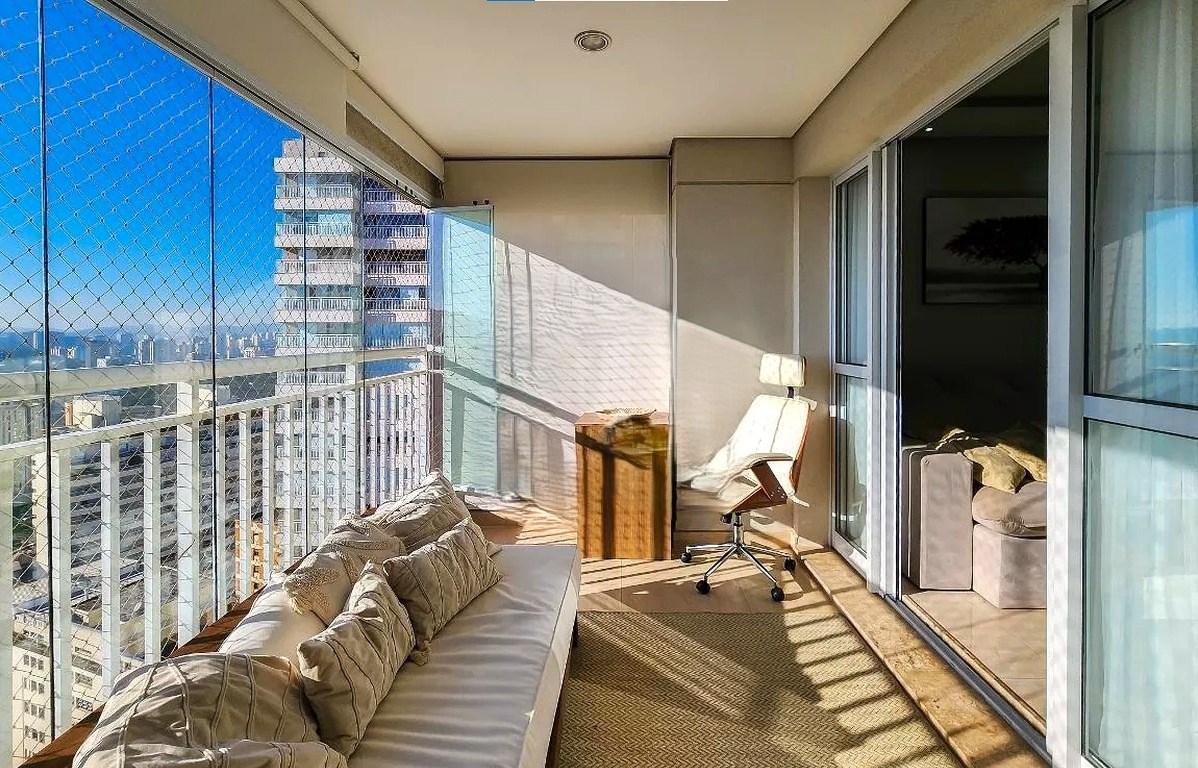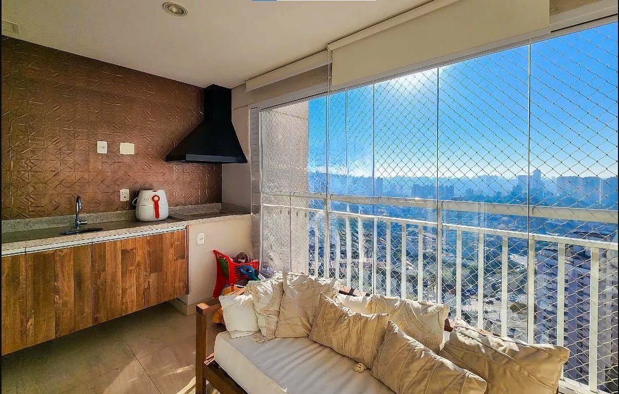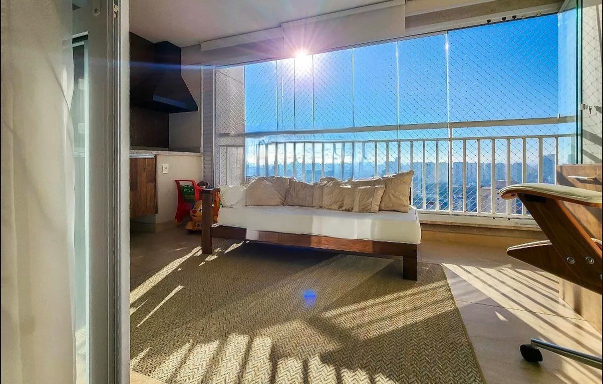 Varanda ampla com fechamento em vidro.