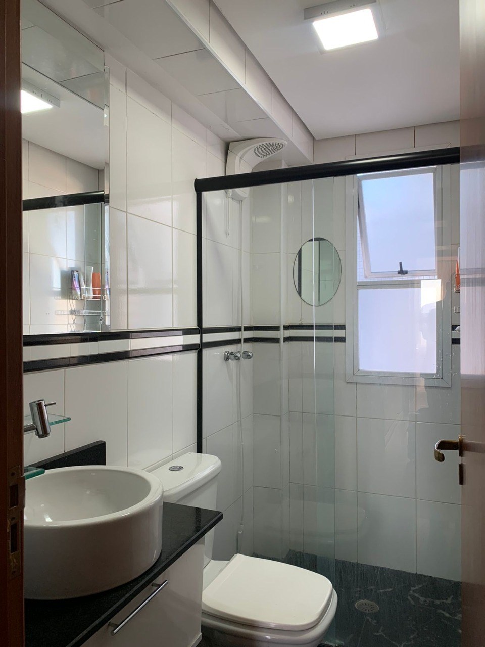 Banheiro com box em vidro.