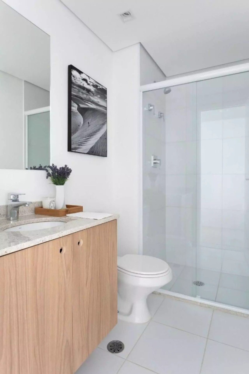 Banheiro com box em vidro.