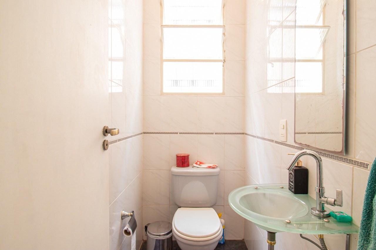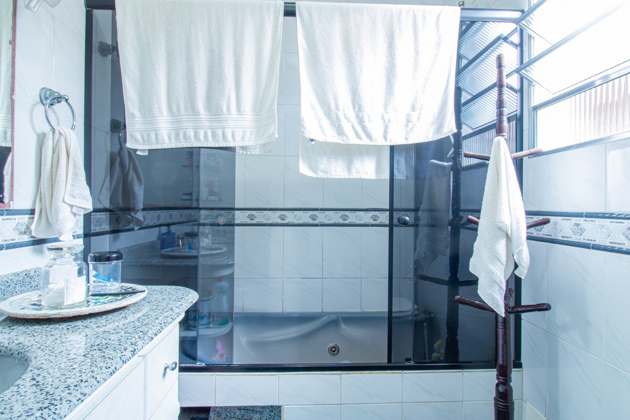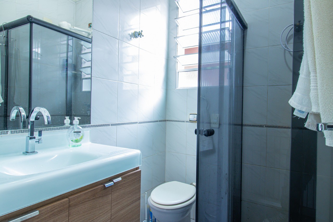 Banheiros com ventilação natural e box em vidro.