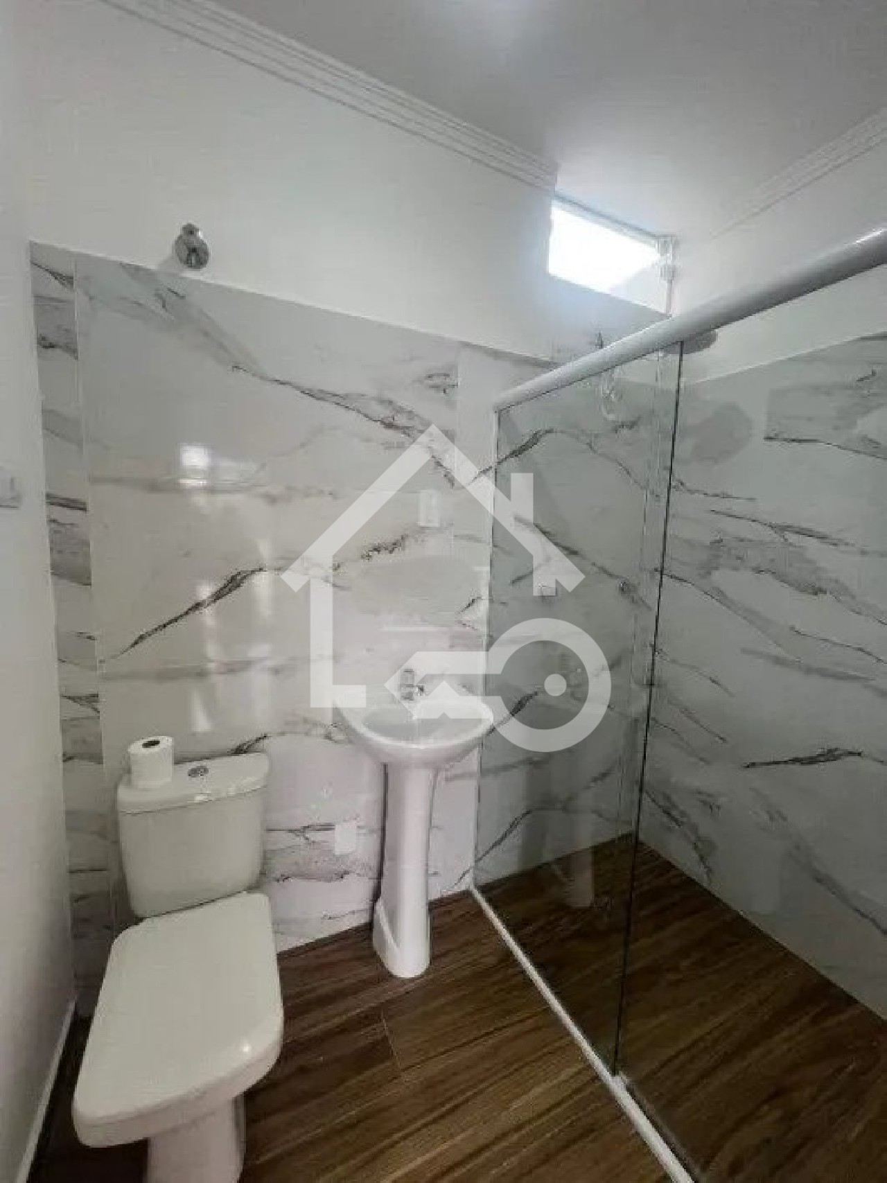 Banheiro com box em vidro.