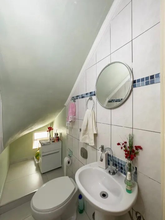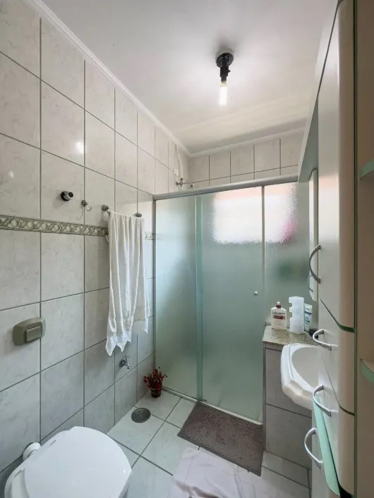 Banheiro com box em vidro e ventilação externa.