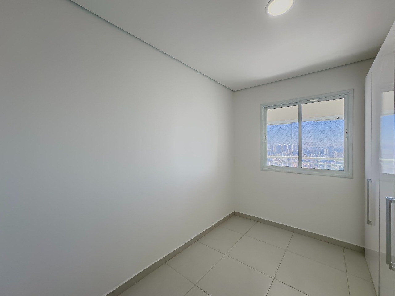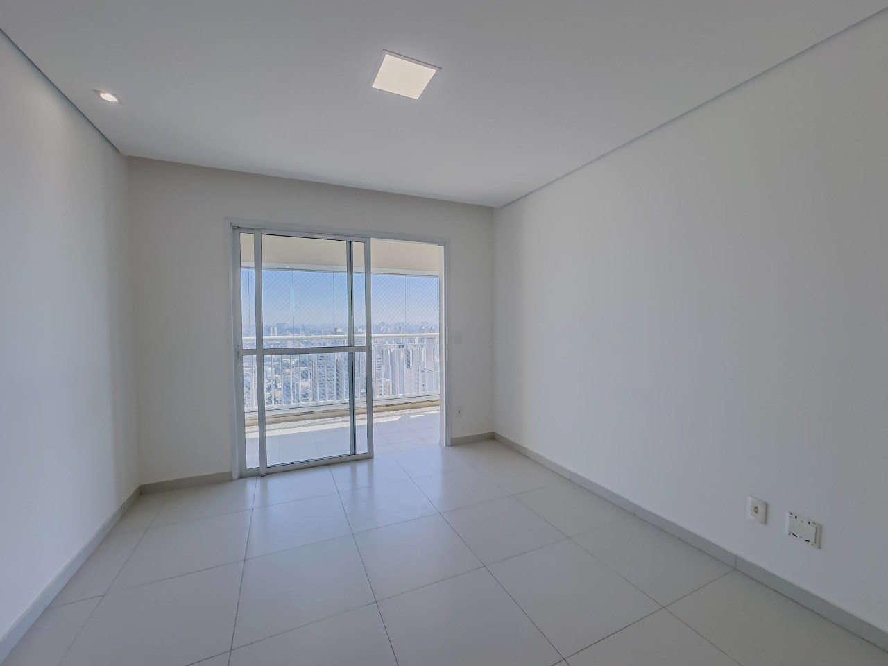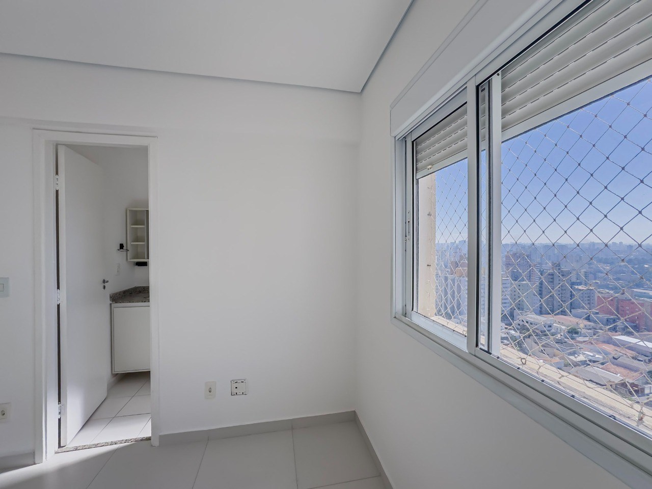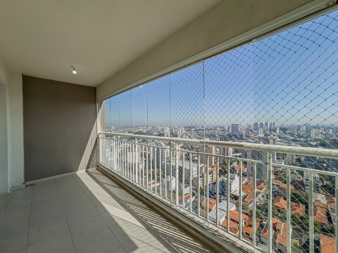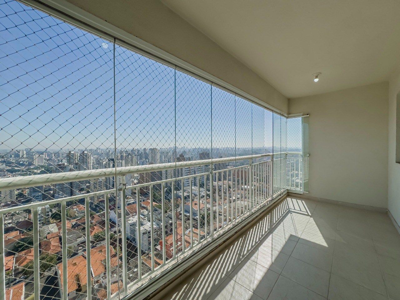 Varanda com tela de proteção e fechamento em vidro.